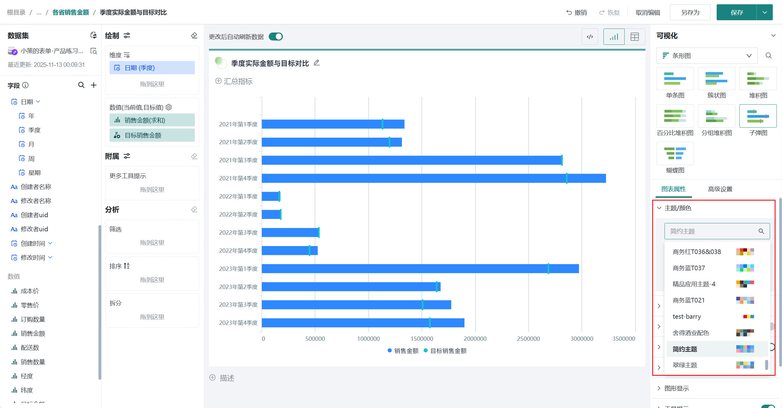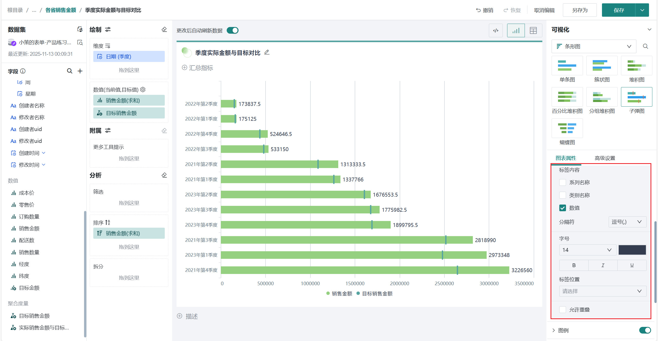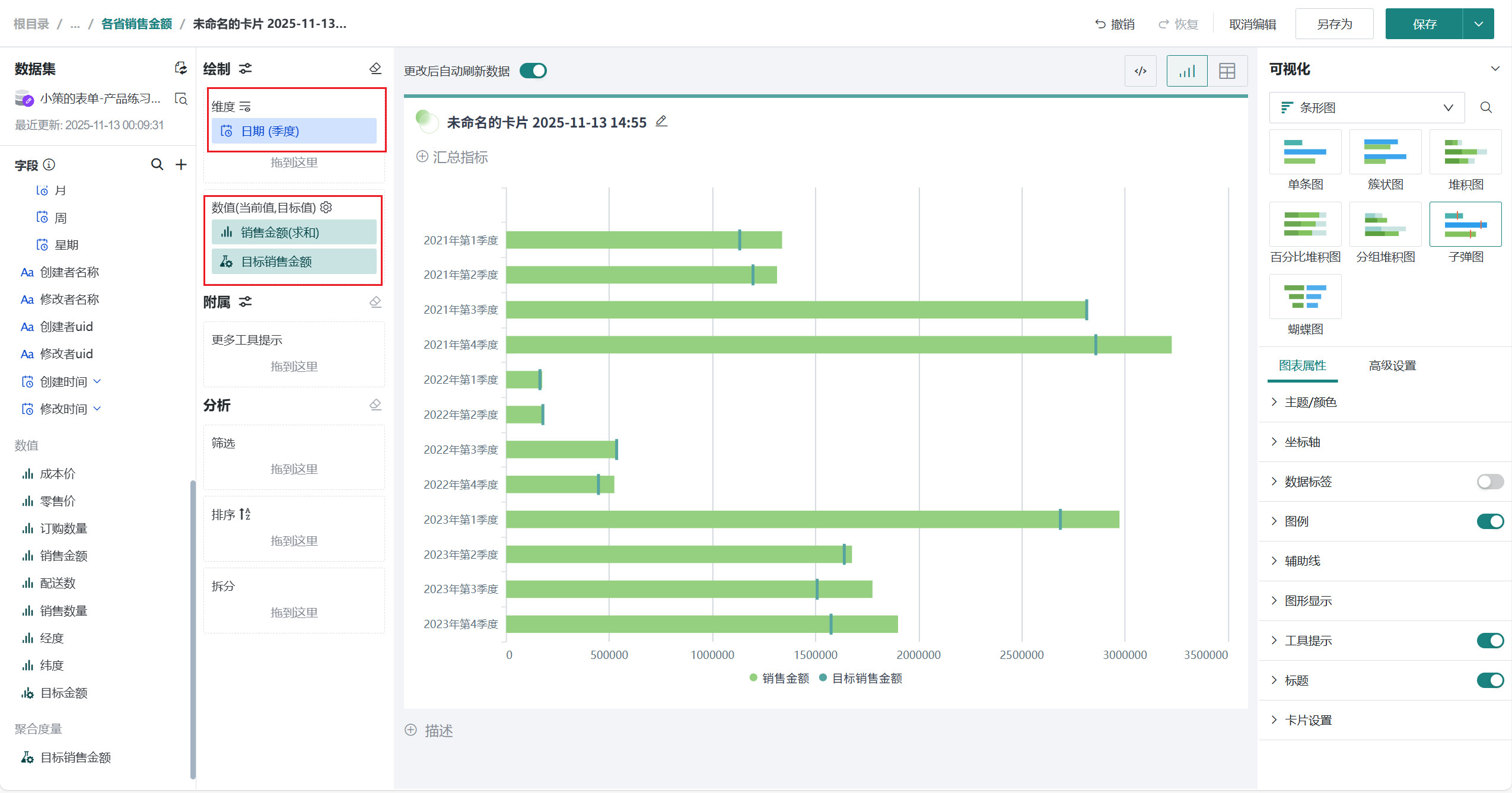 将左侧「数据集」区域的「日期(季度)」拖至「绘制」区域的「维度」。 将我们需要的「销售金额」、「目标销售金额」拖至「绘制」区域的「数值」。
