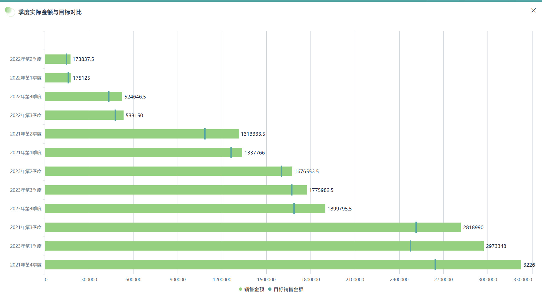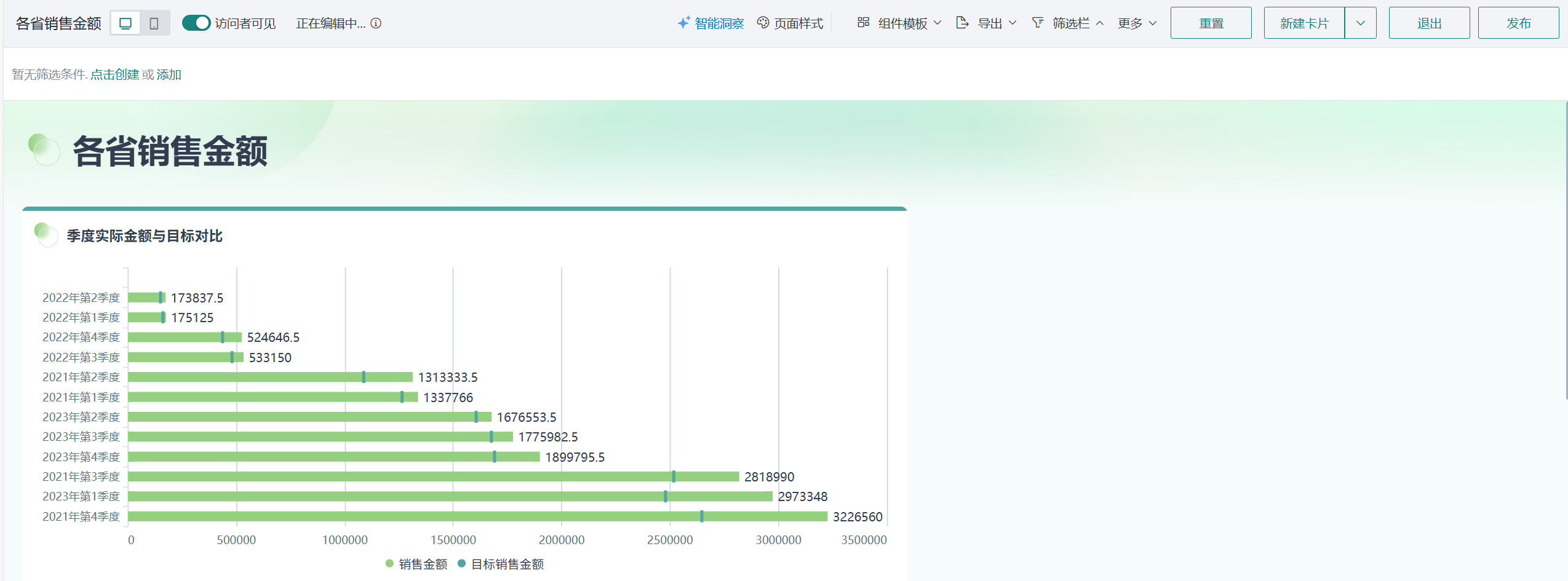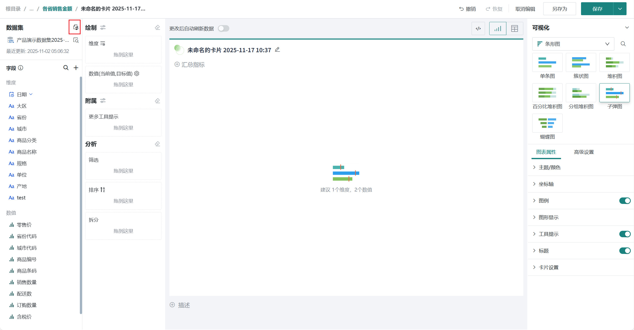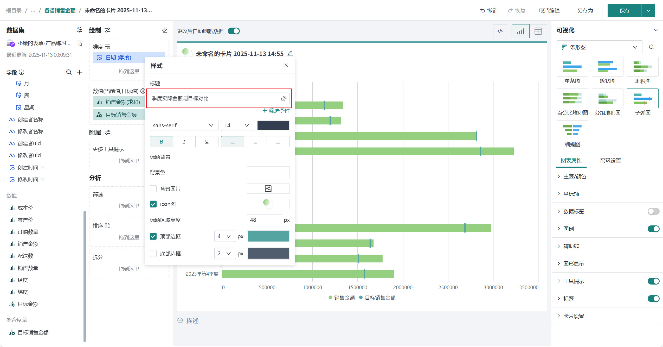 将左侧「数据集」区域的「日期(季度)」拖至「绘制」区域的「维度」。 将我们需要的「销售金额」、「目标销售金额」拖至「绘制」区域的「数值」。