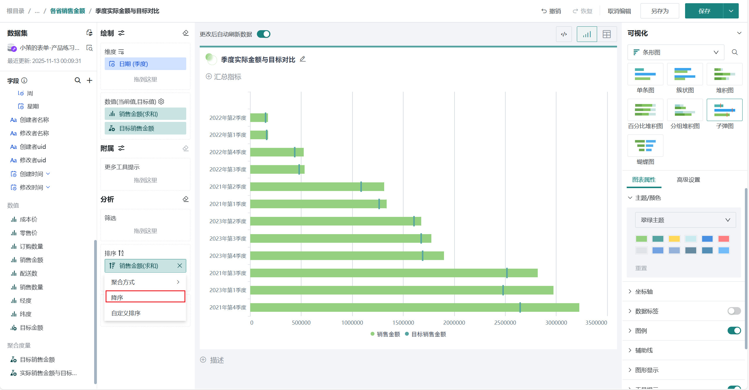 点击字段后选择「降序」,设置柱子按照销售金额降序排列,排序详细配置可参考数据排序。