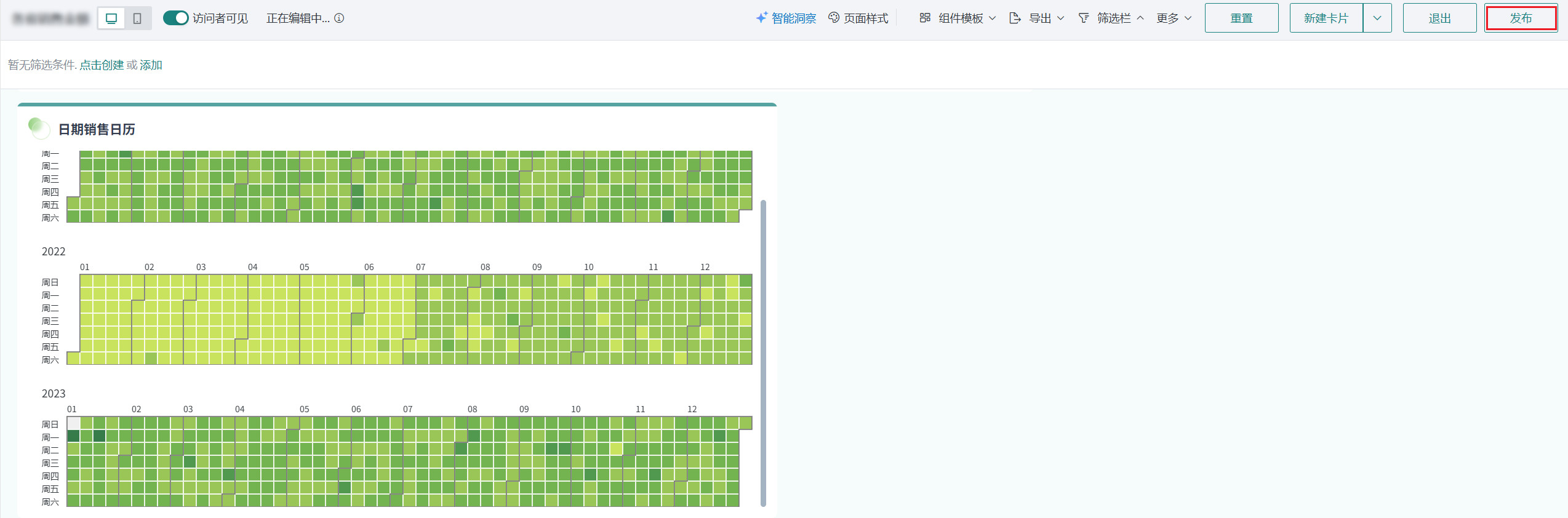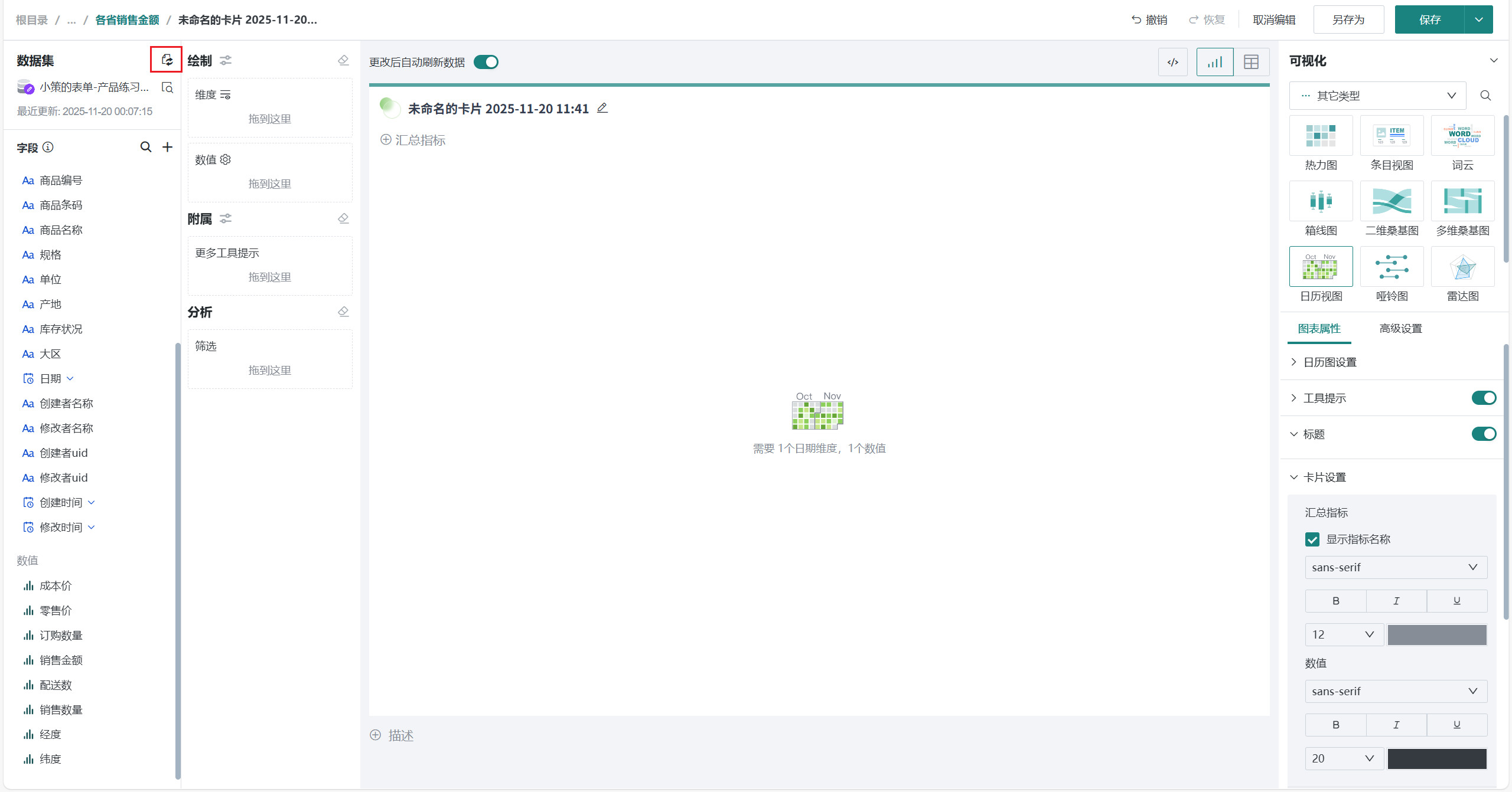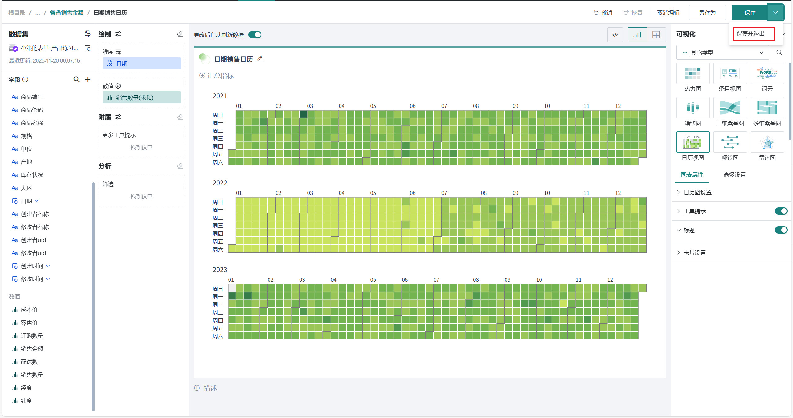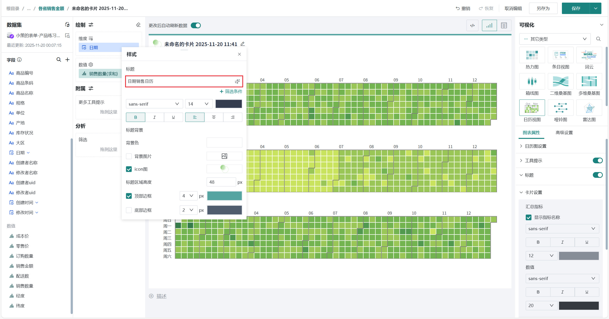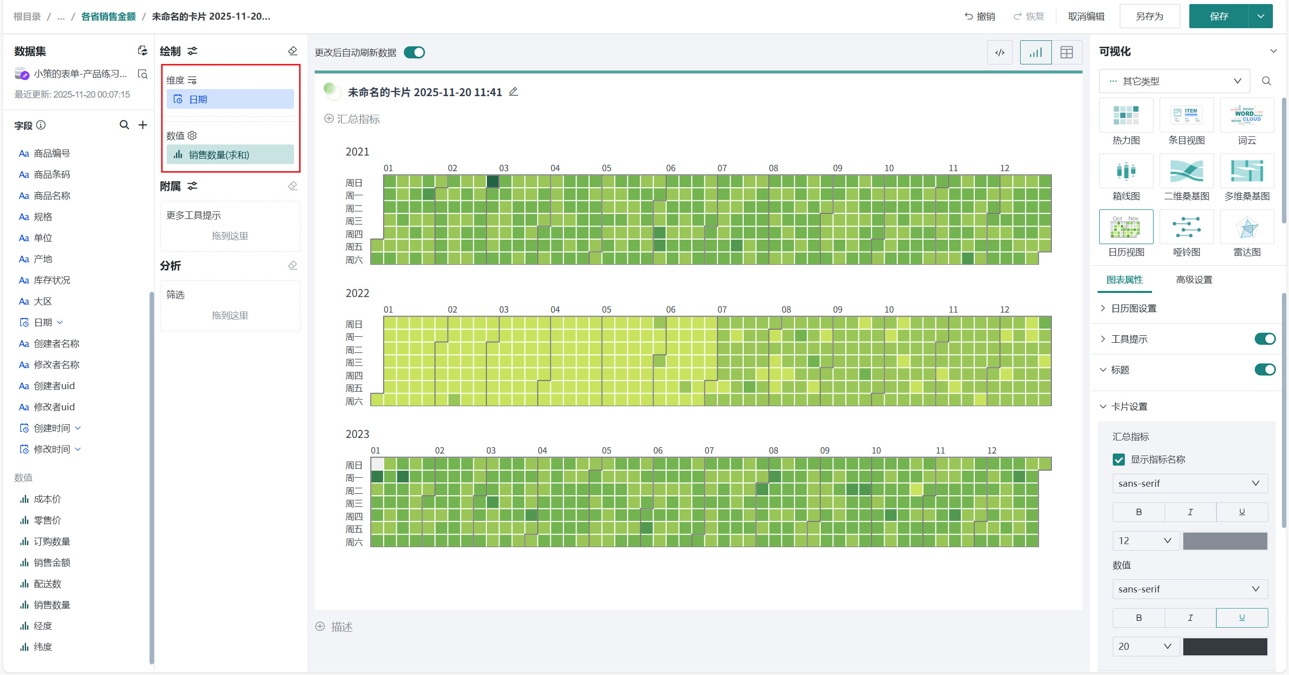 在「可视化>其它类型>日历视图」,将左侧「字段」区域的日期字段(如「日期」)拖至「绘制」区域的「维度」,将数值字段(如「销售数量」等)拖入「数值」。