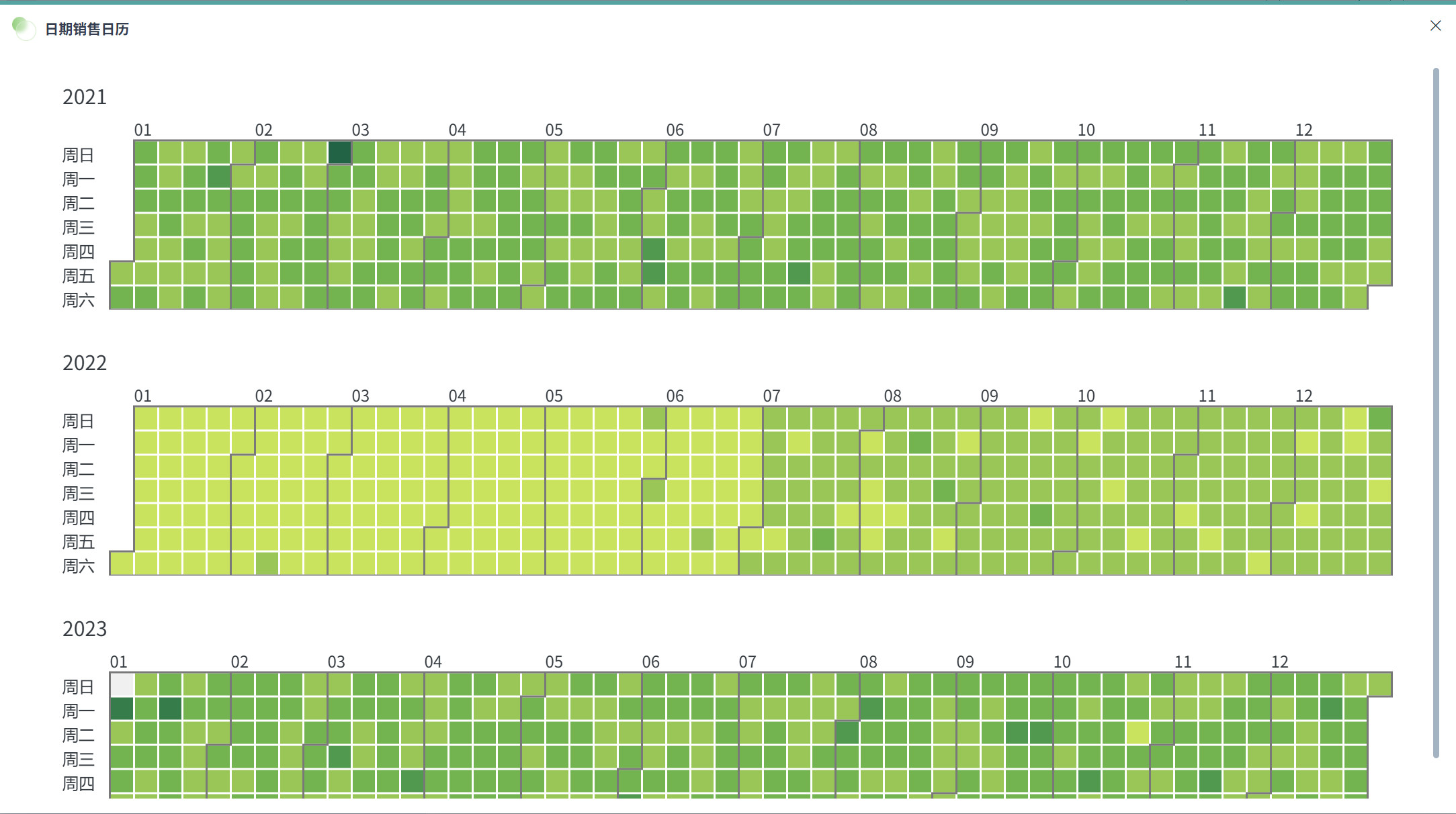 - 模式识别:快速识别数据的周期性模式、峰值和异常日期