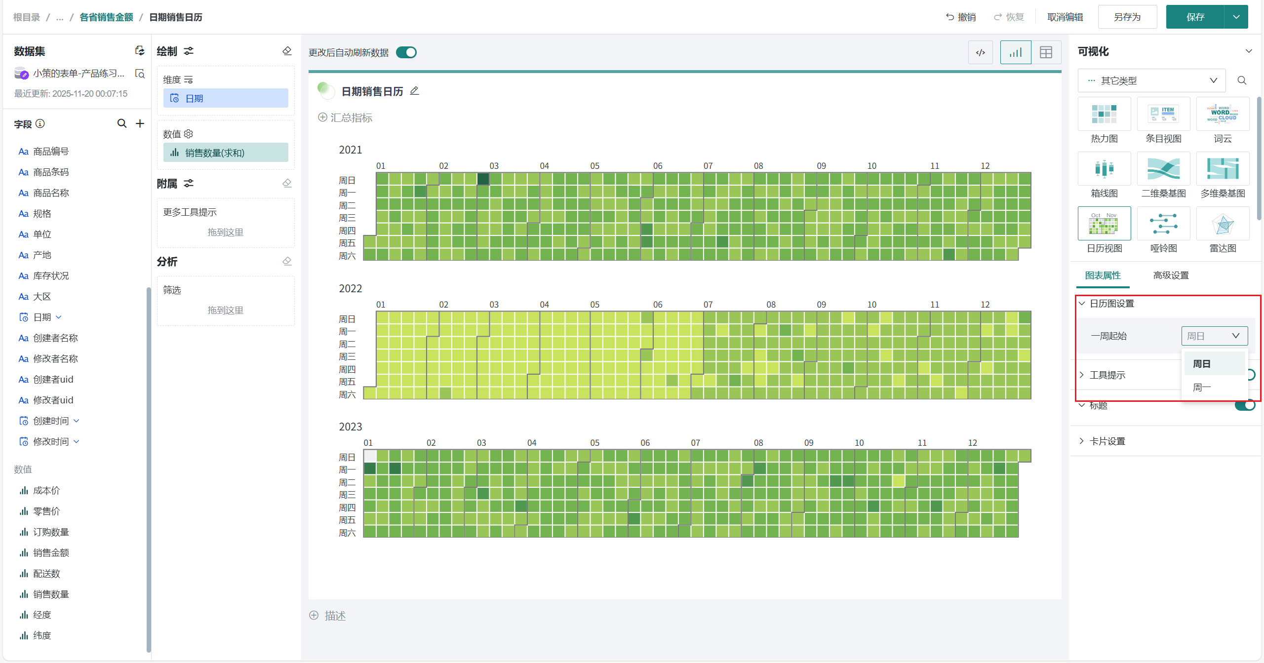 在「图表属性>日历图设置」,可调整日历视图展示的一周起始,如周日或周一。