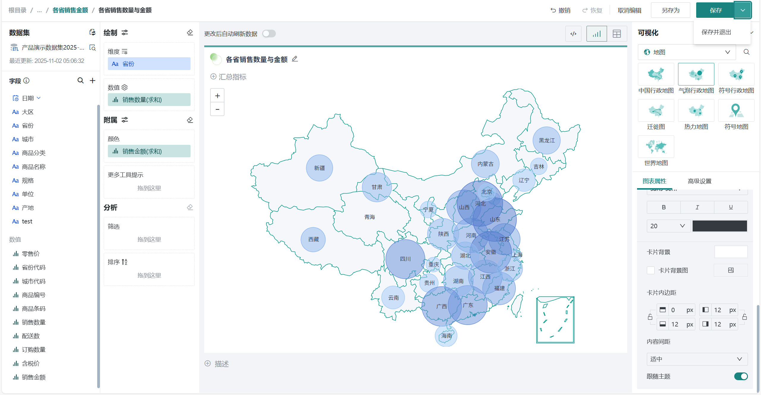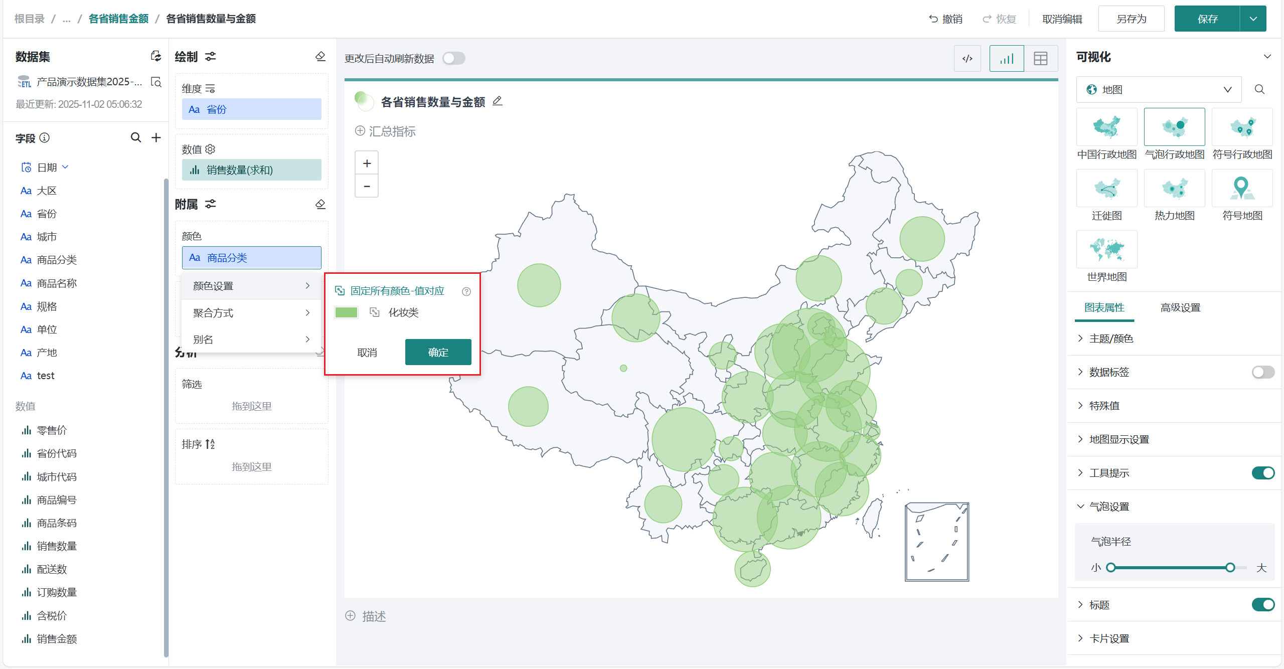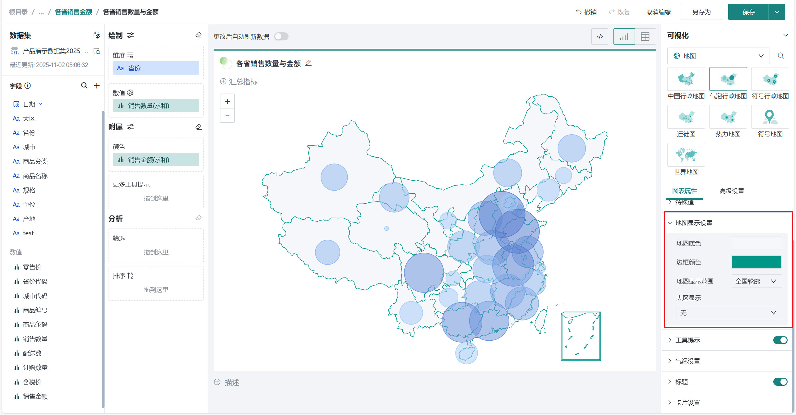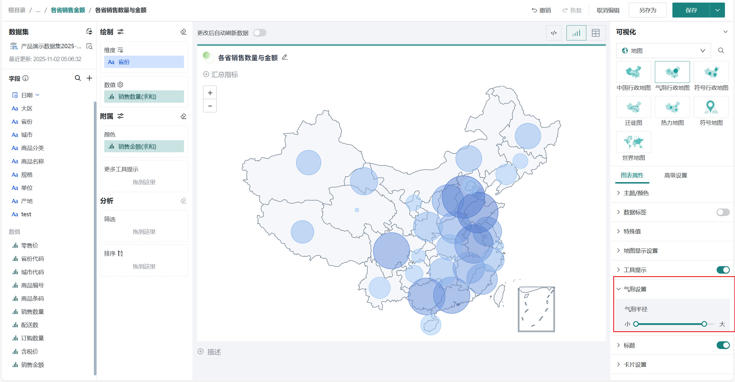在「可视化」区域中选择「气泡行政地图」,将左侧「字段」区域的省份/城市字段(如「省份」)拖至「绘制」区域的「地理维度」,将表示气泡大小的数值字段(如「销售数量」)拖入「数值」,将表示气泡颜色的字段(如「销售金额」)拖入「颜色」。