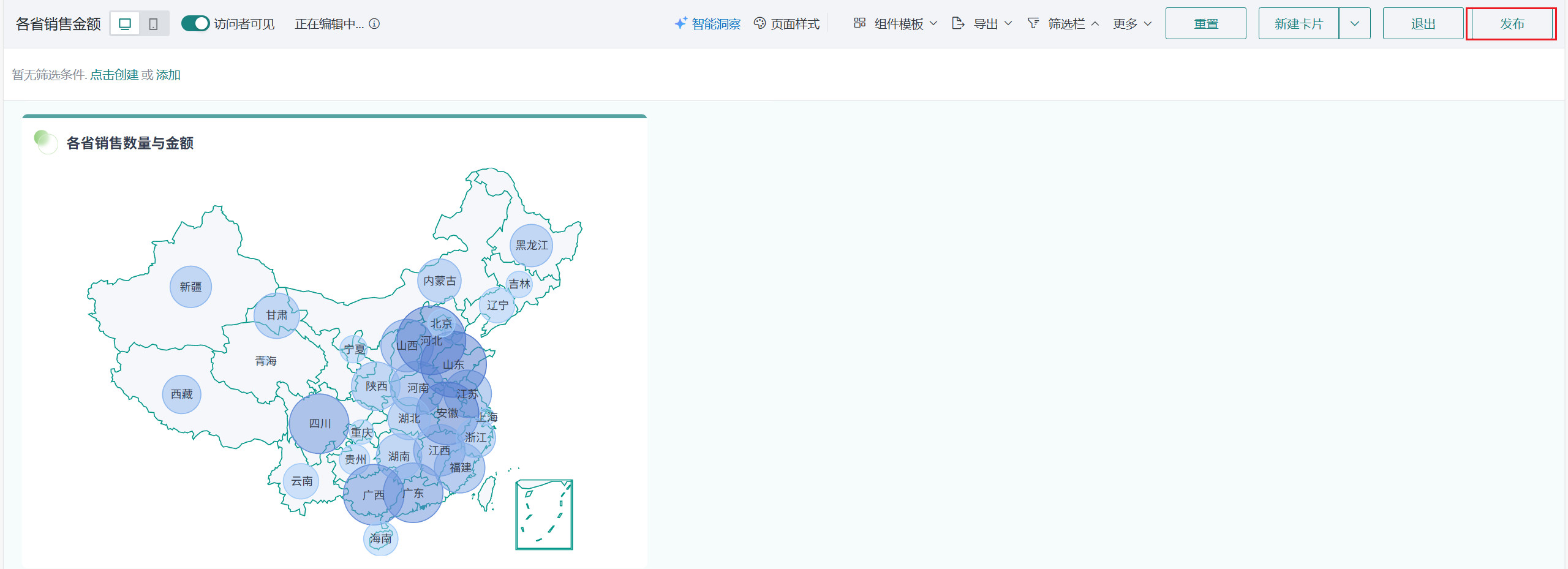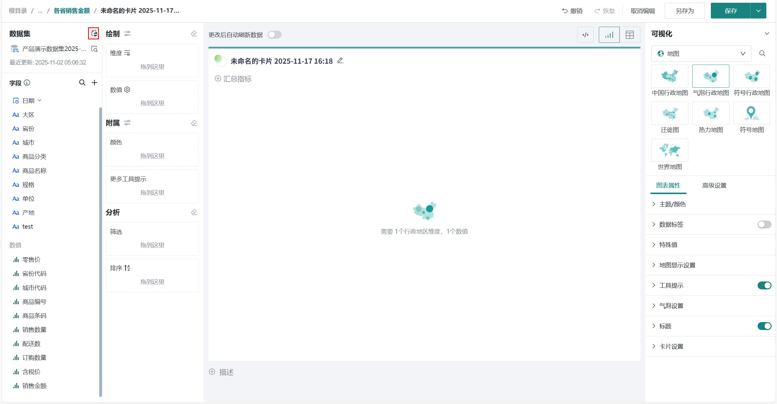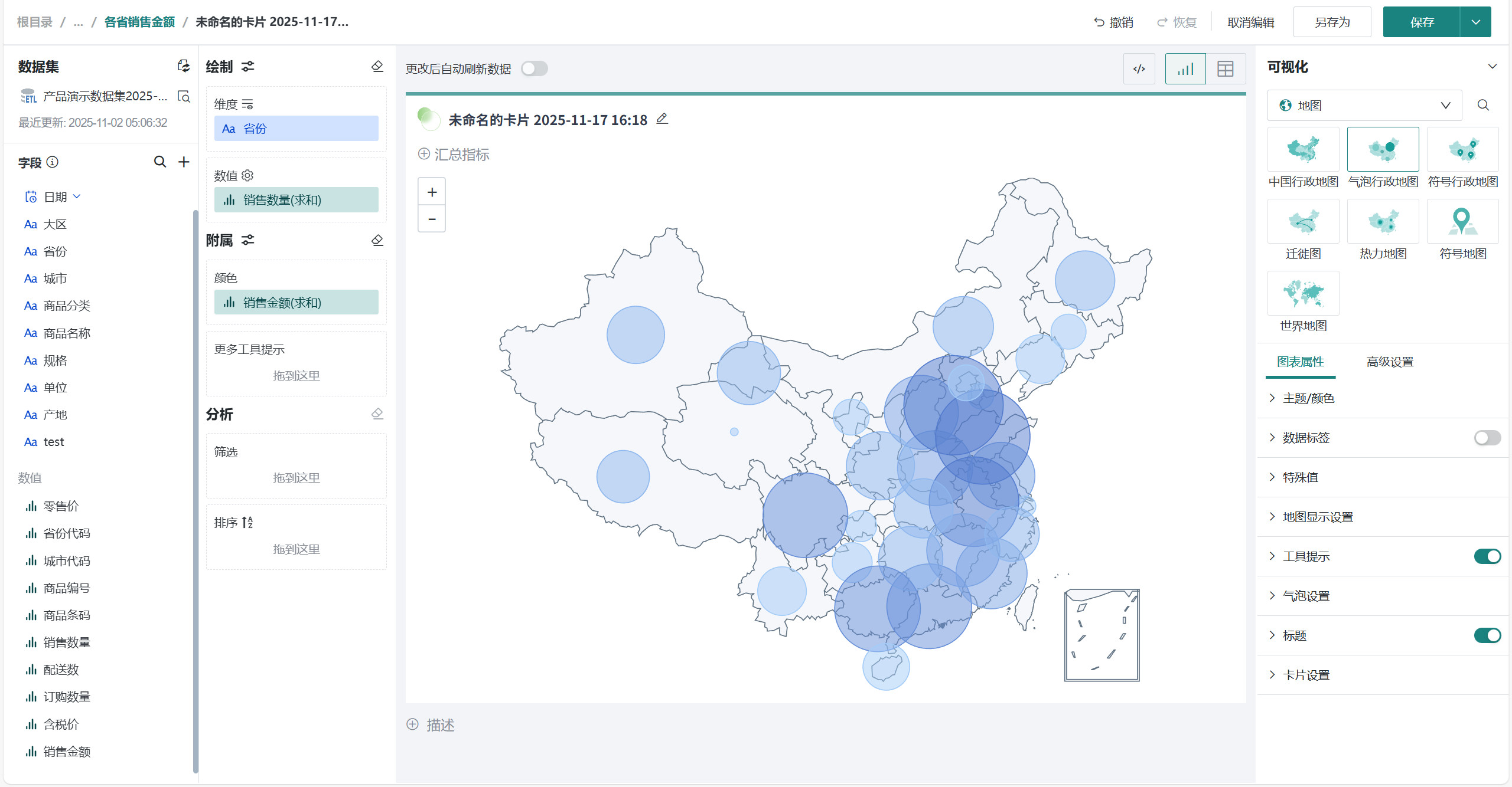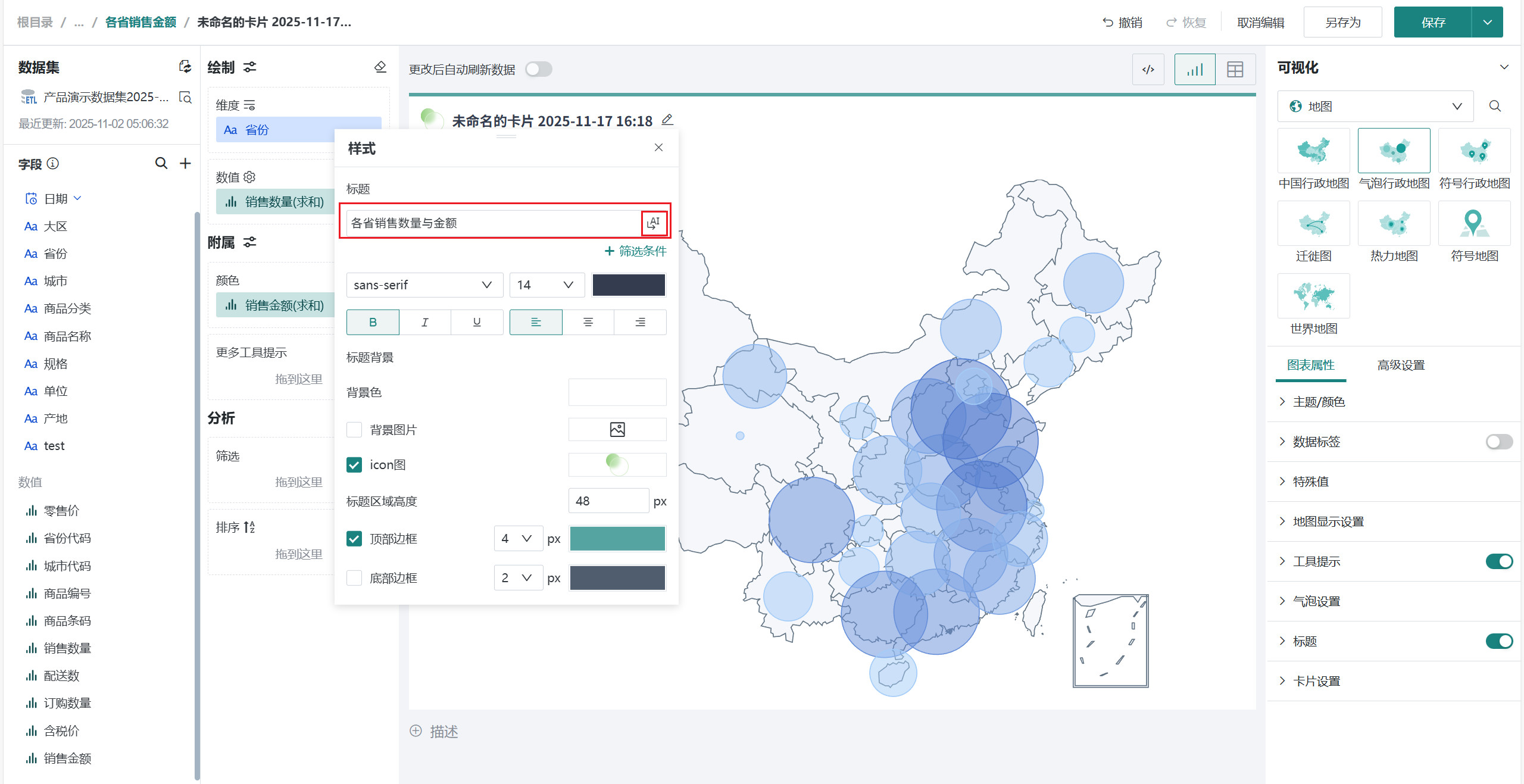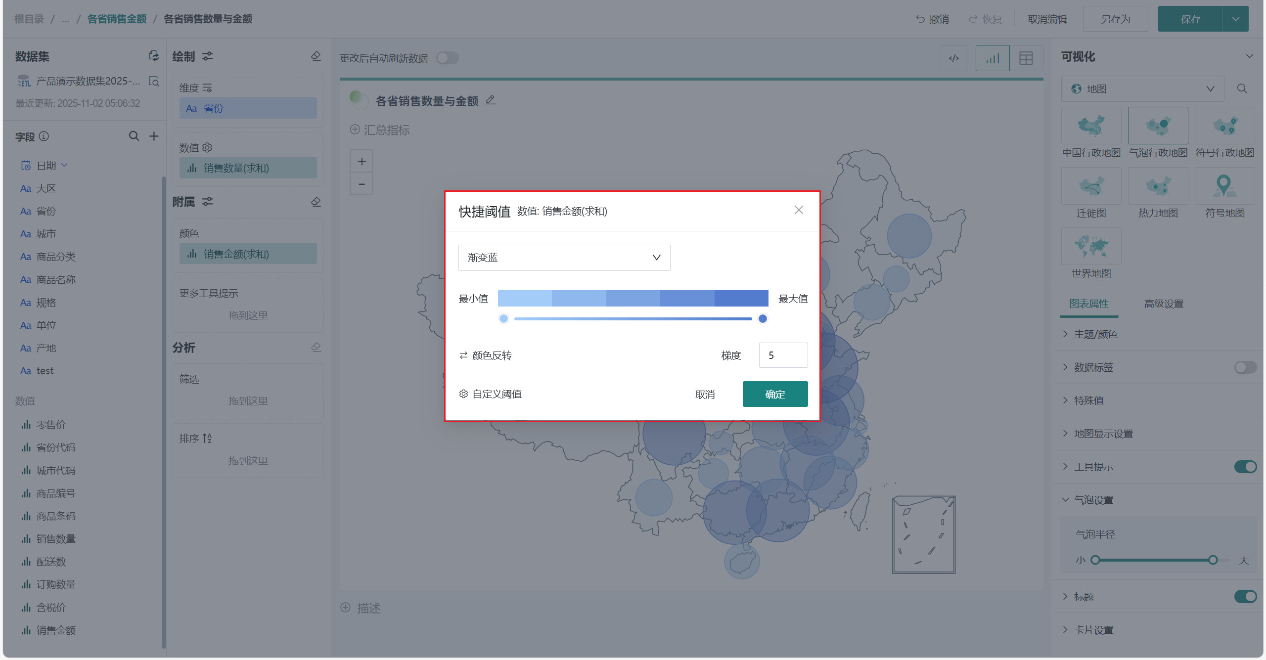在「可视化」区域中选择「气泡行政地图」,将左侧「字段」区域的省份/城市字段(如「省份」)拖至「绘制」区域的「地理维度」,将表示气泡大小的数值字段(如「销售数量」)拖入「数值」,将表示气泡颜色的字段(如「销售金额」)拖入「颜色」。