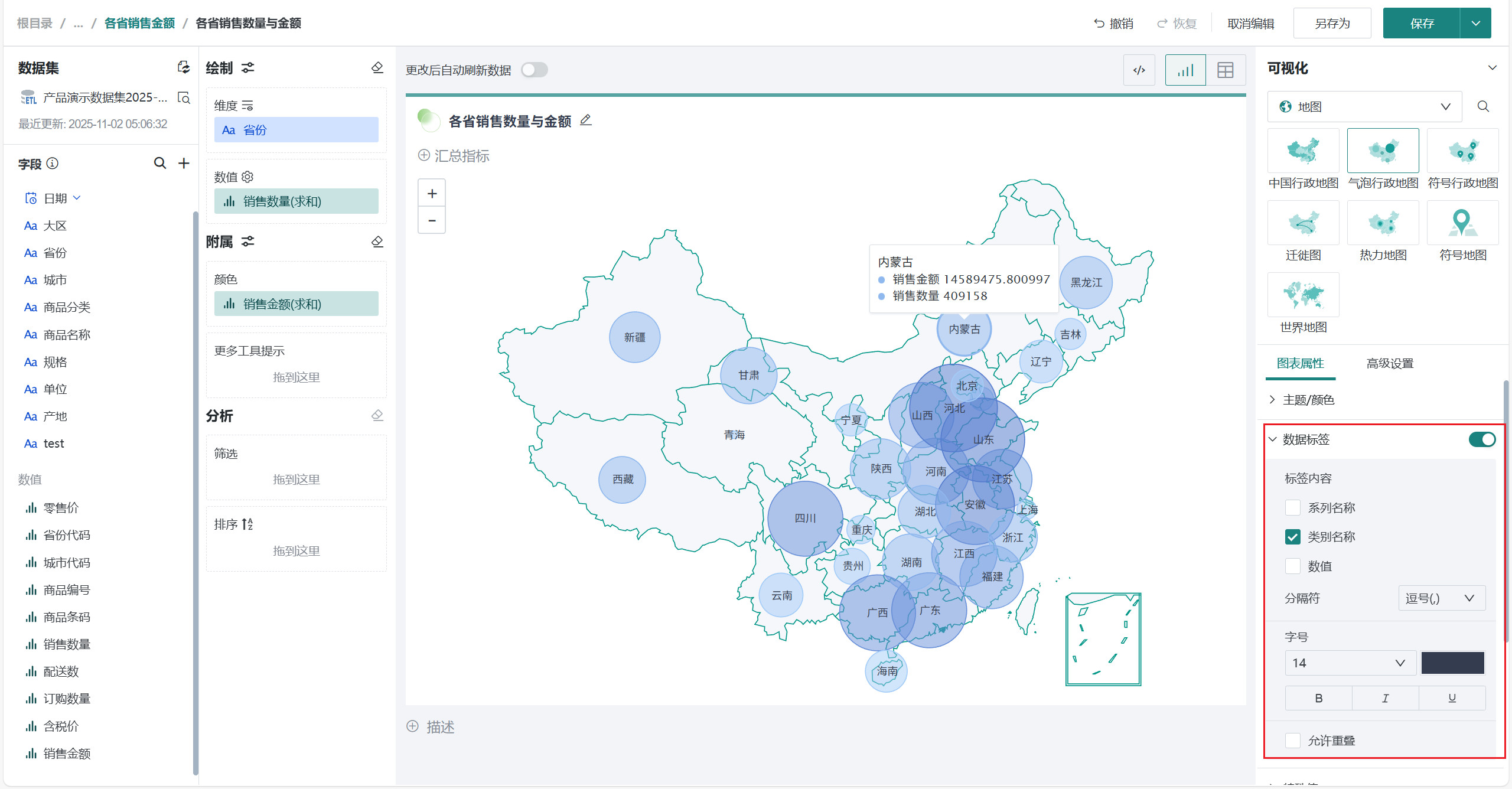 在「图表属性」区域打开「数据标签」按钮,可设置气泡上显示的信息(如数值、省份名称等)。也可配置鼠标悬停时显示的详细信息弹窗,包含多个维度的数据。