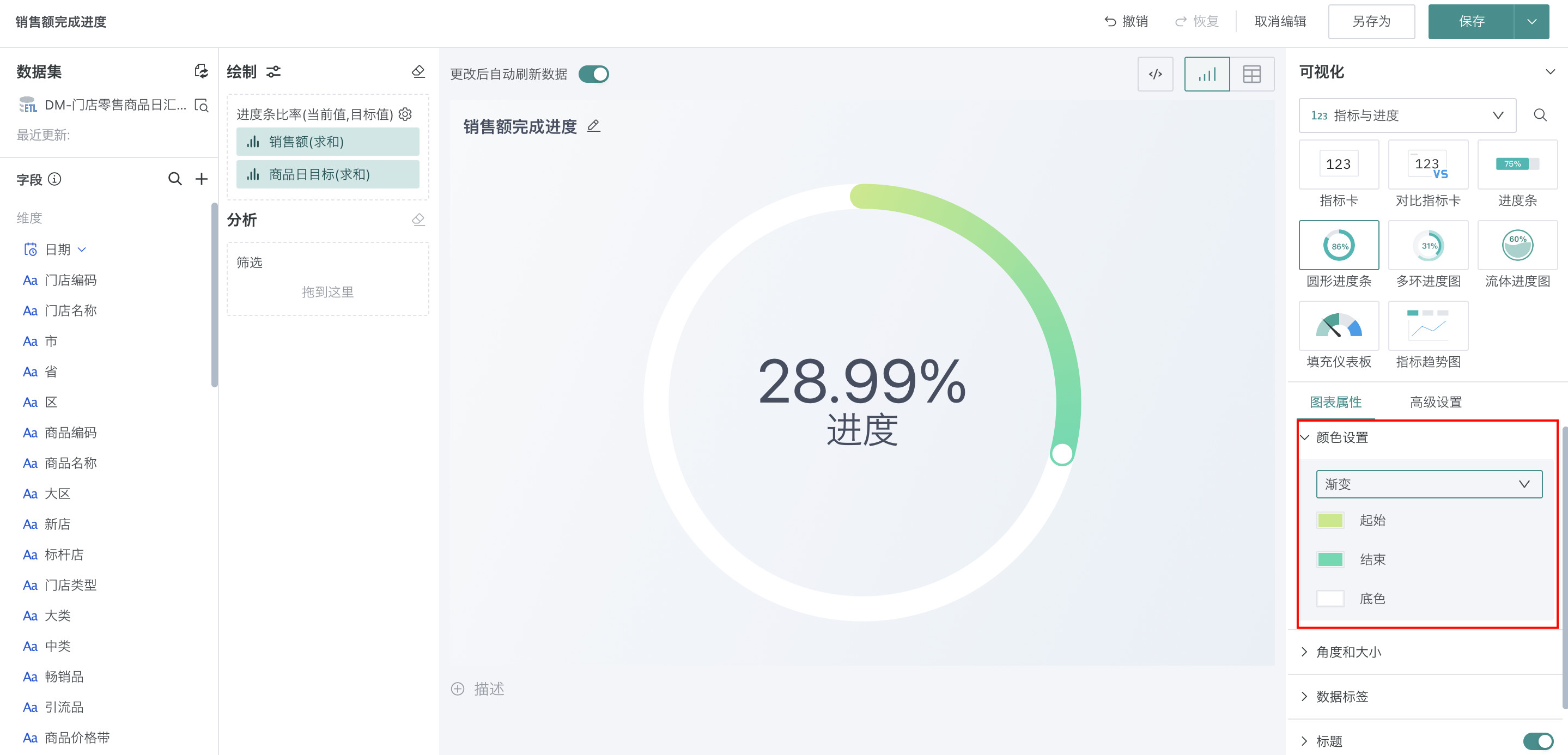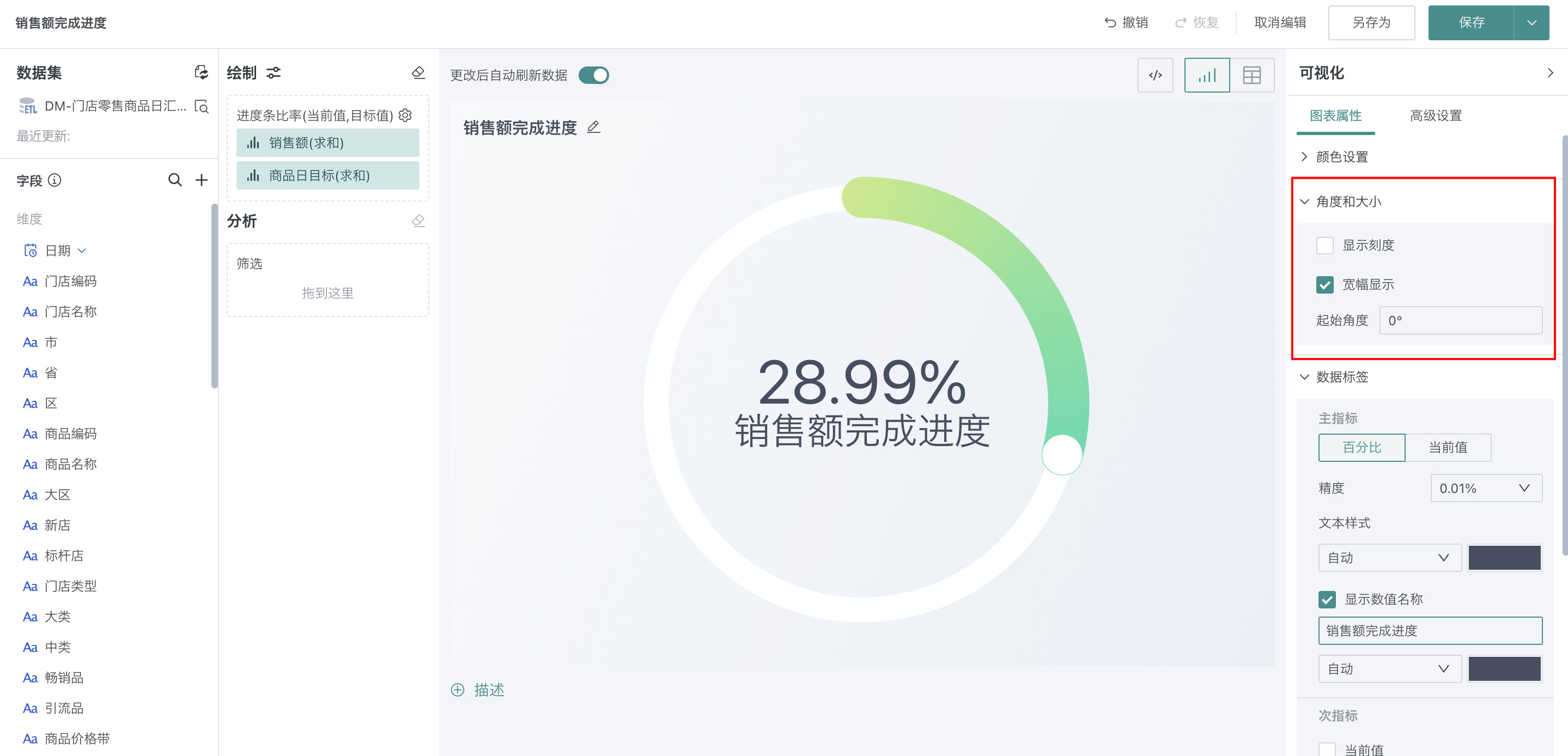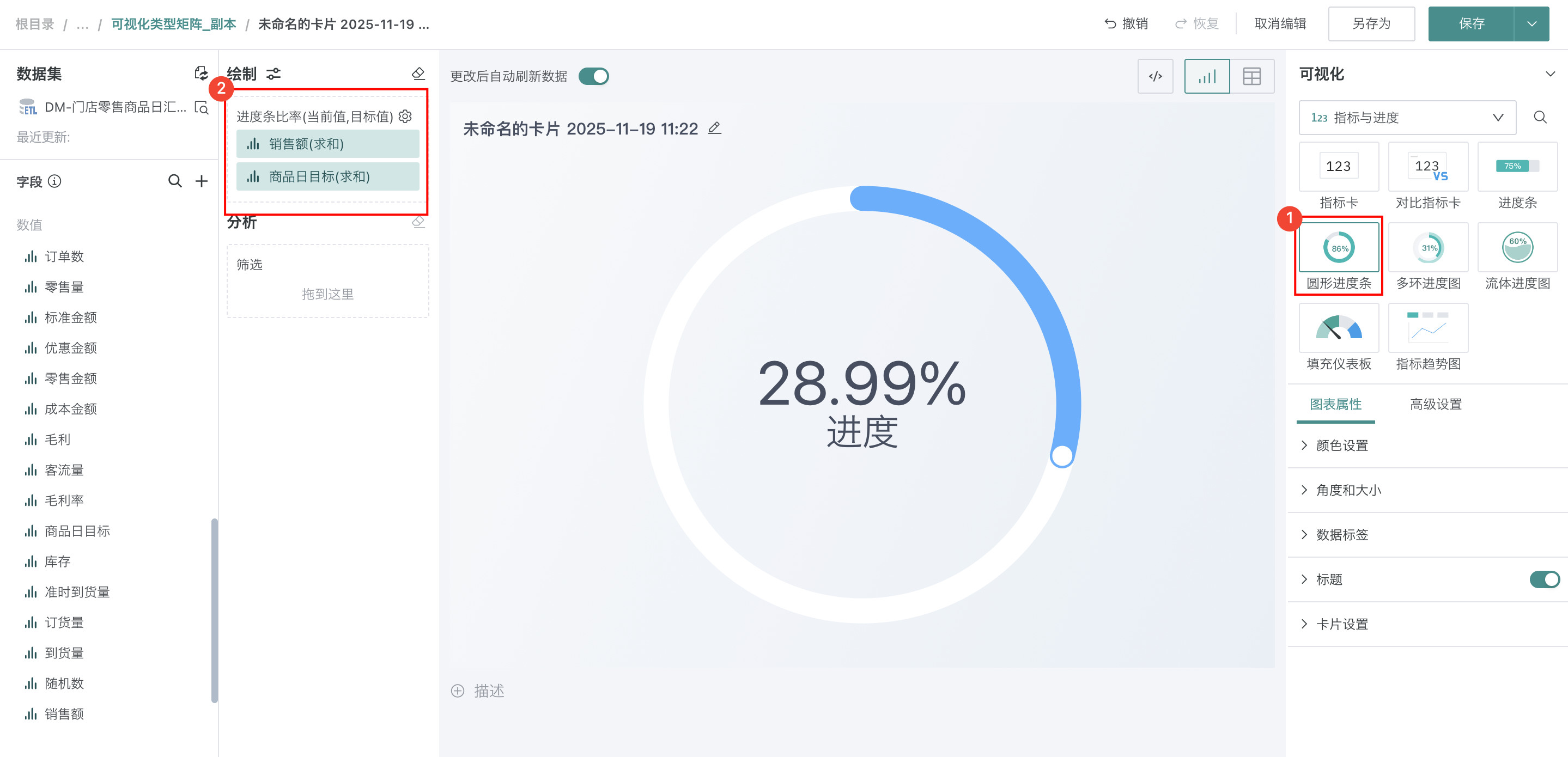 在「可视化」区域中选择「圆形进度条」,将左侧「数据集」区域的「销售额」和「商品日目标」拖至「绘制」区域的「数值」。