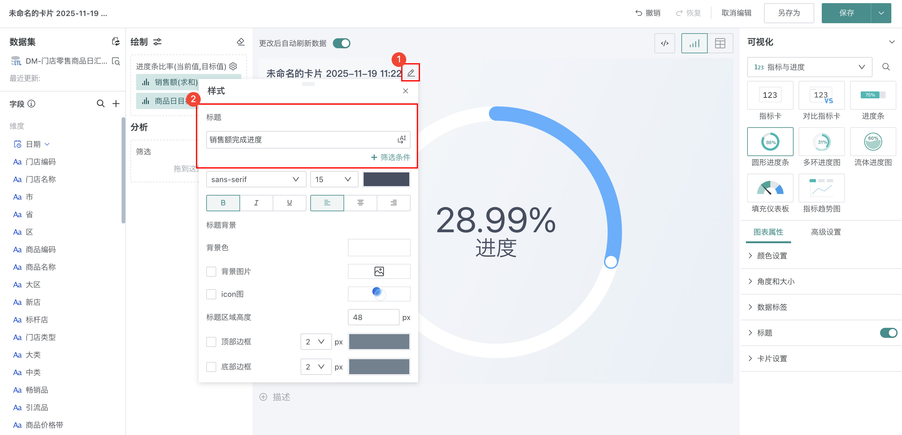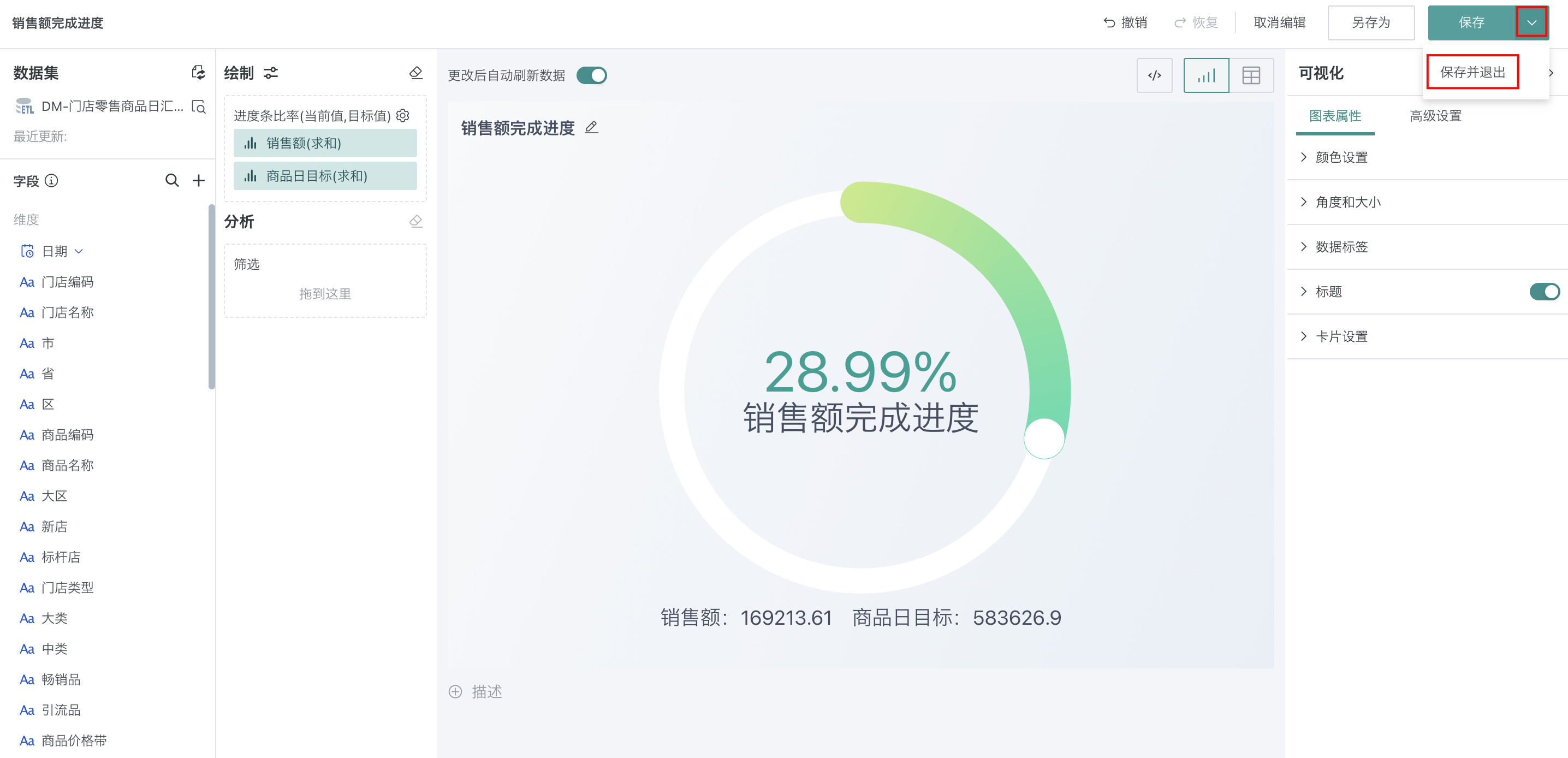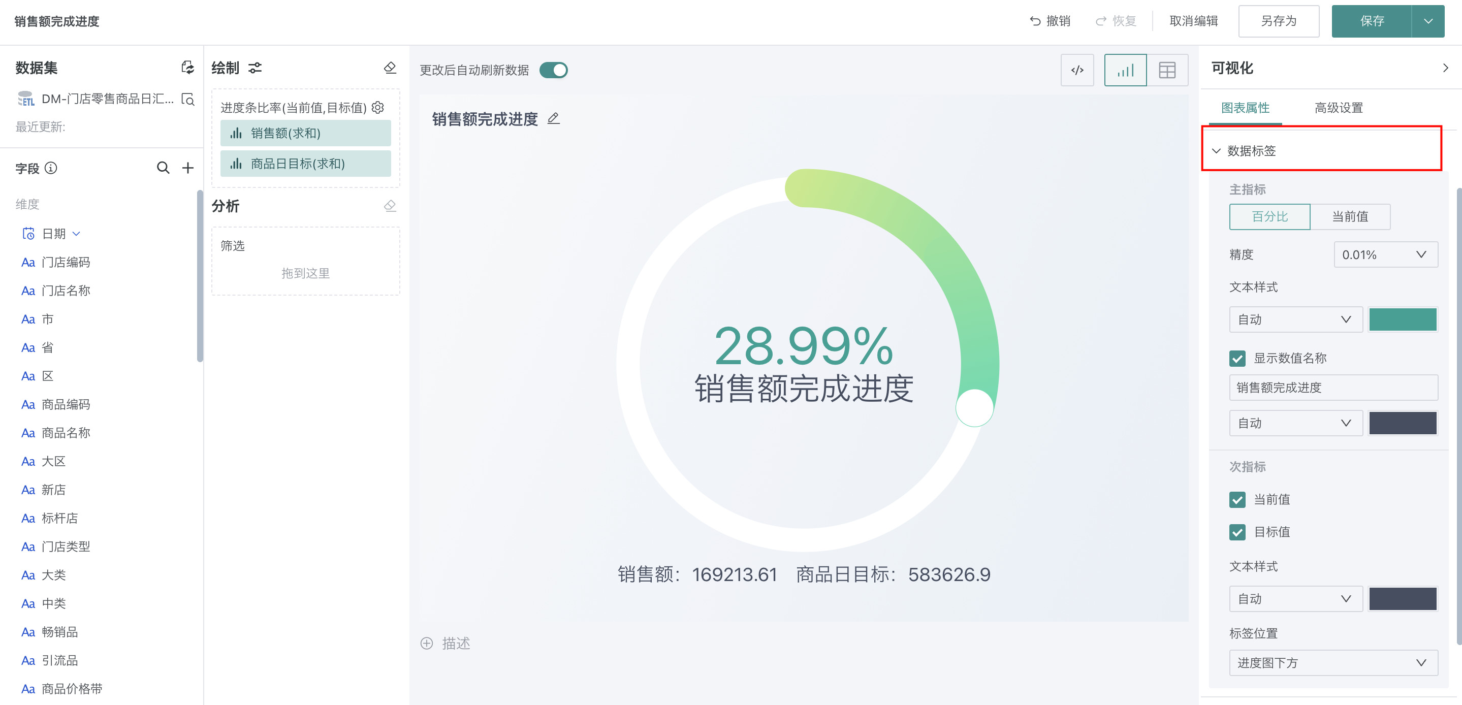 在「可视化」区域中选择「圆形进度条」,将左侧「数据集」区域的「销售额」和「商品日目标」拖至「绘制」区域的「数值」。