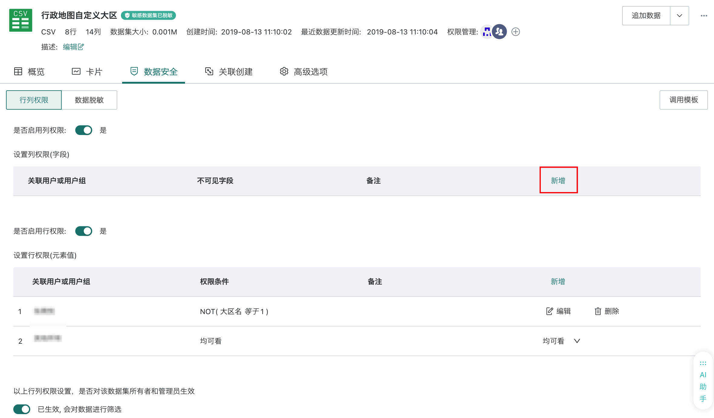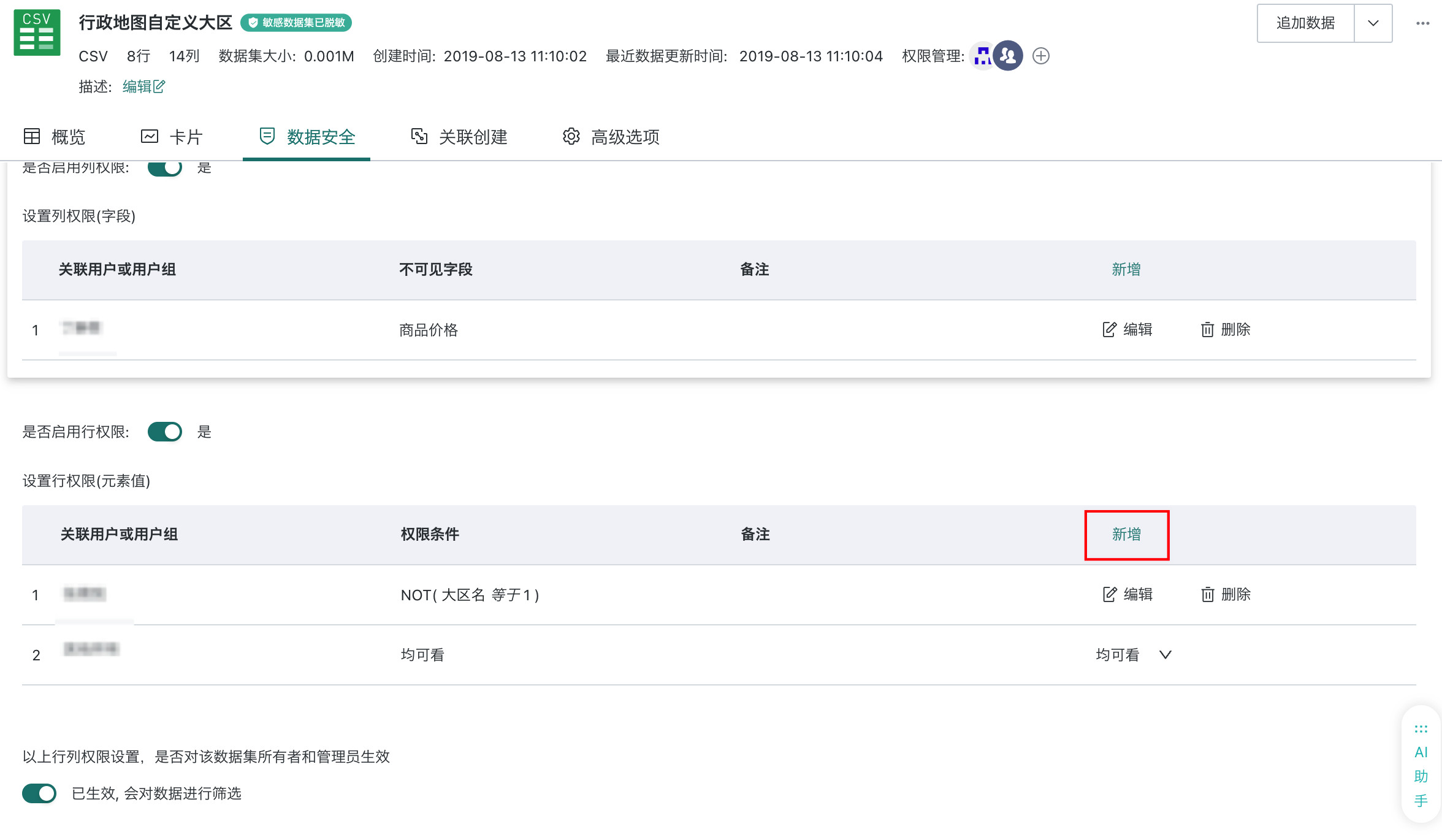 - 在数据集详情页,点击「数据安全 > 行列权限」页签,进入行列权限配置页面。