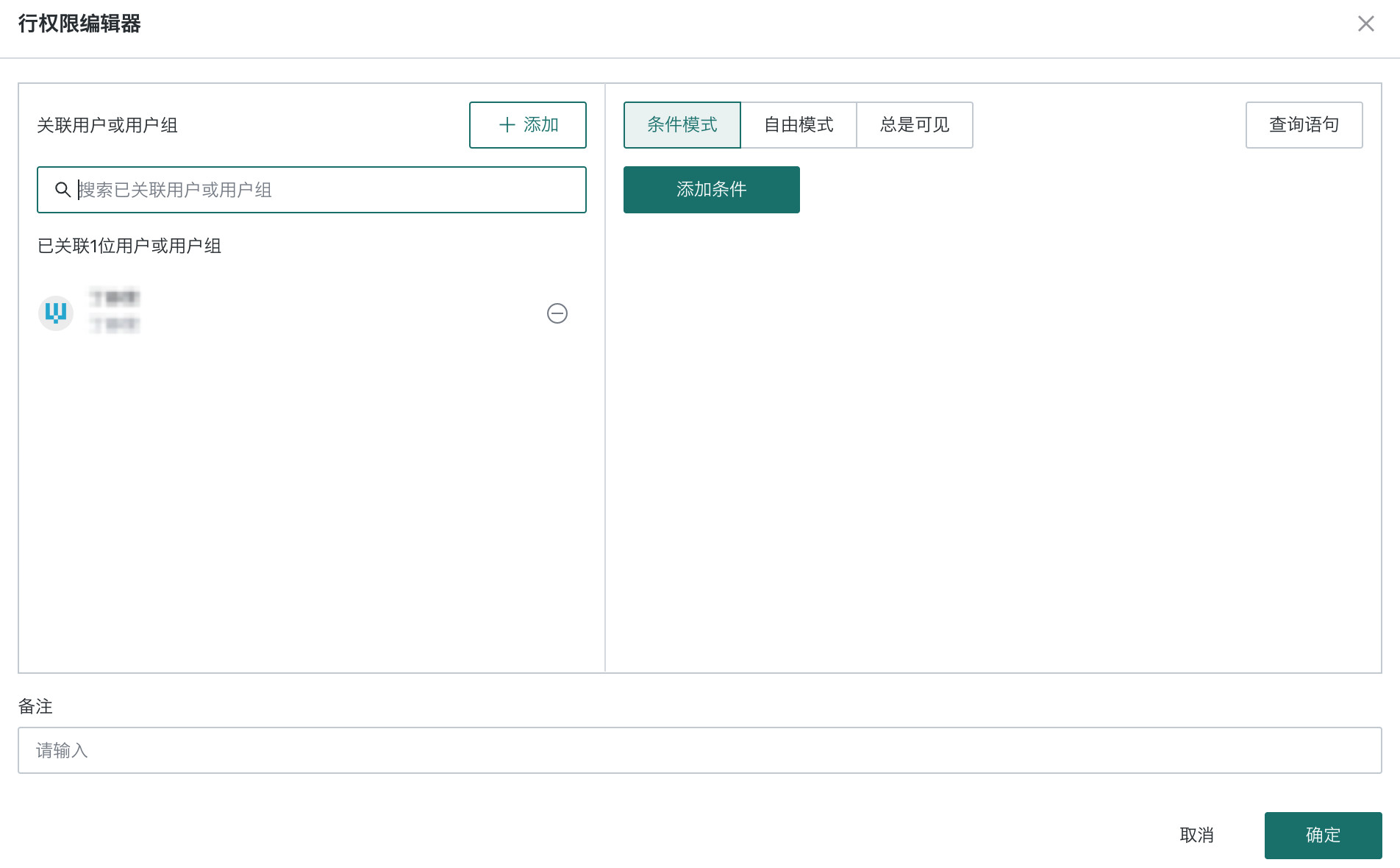 | 条件模式 | 未被当前行权限规则覆盖的用户只能查看满足指定条件的数据 |