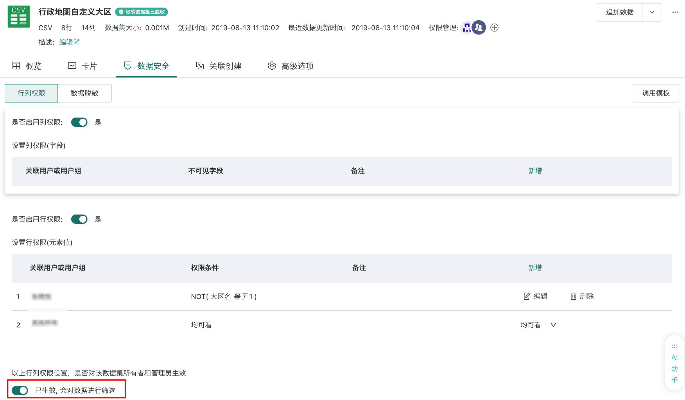 - 只有当管理员和数据集所有者被包含在行列权限的「适用对象」中时,此开关设置才会生效