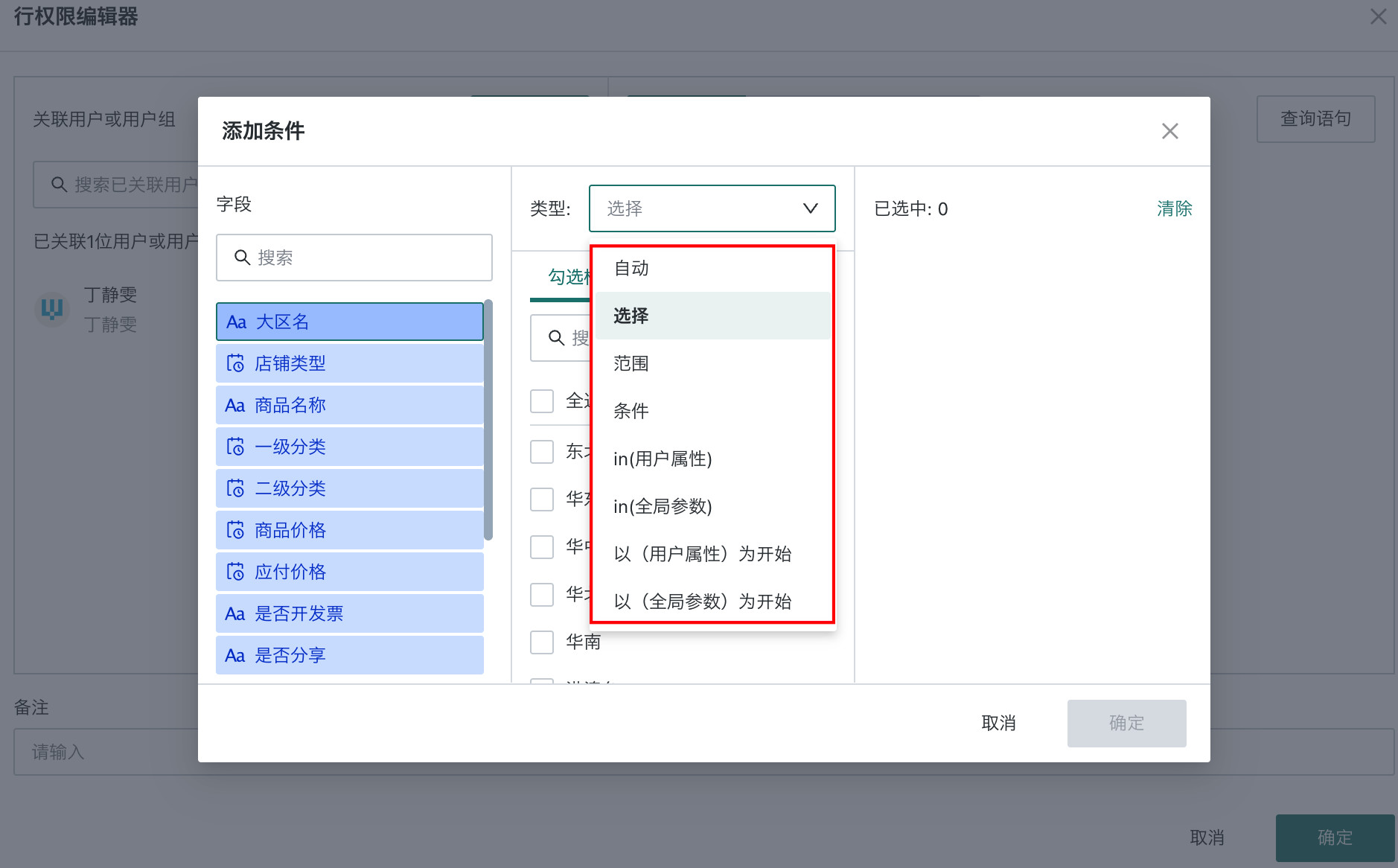 | 选择 | 文本字段 | 直接勾选或批量粘贴条件值,如省份、类别、名称等 |