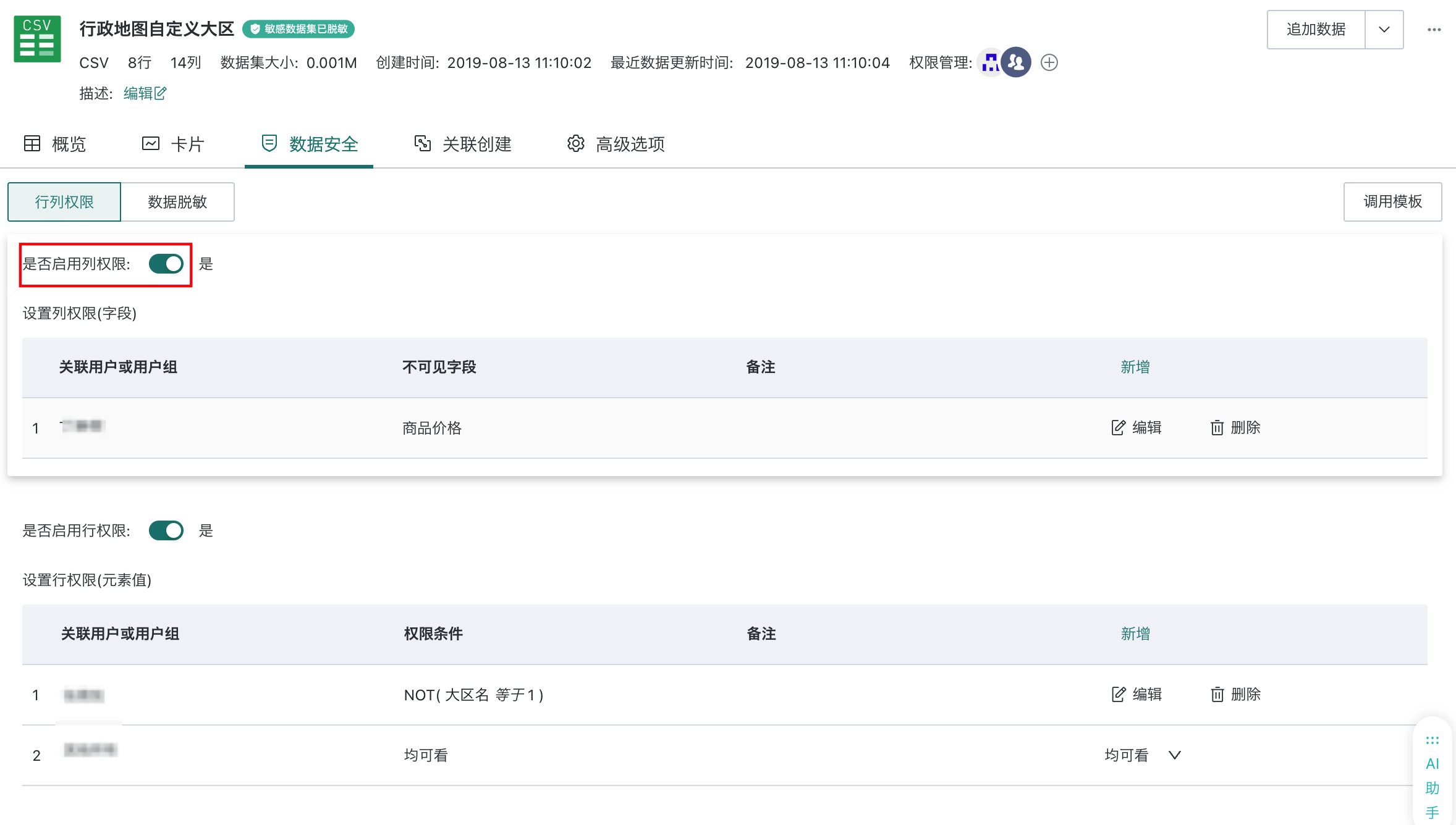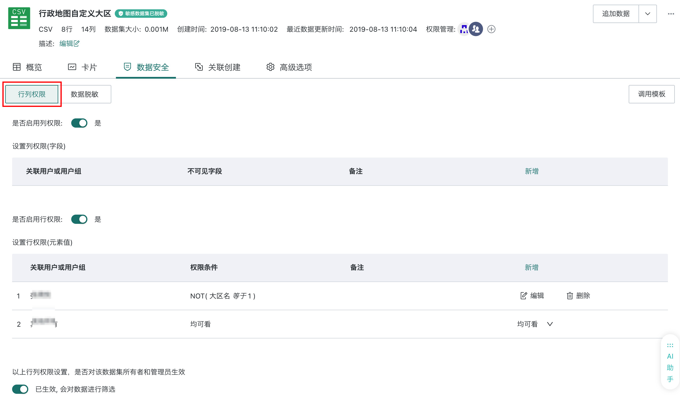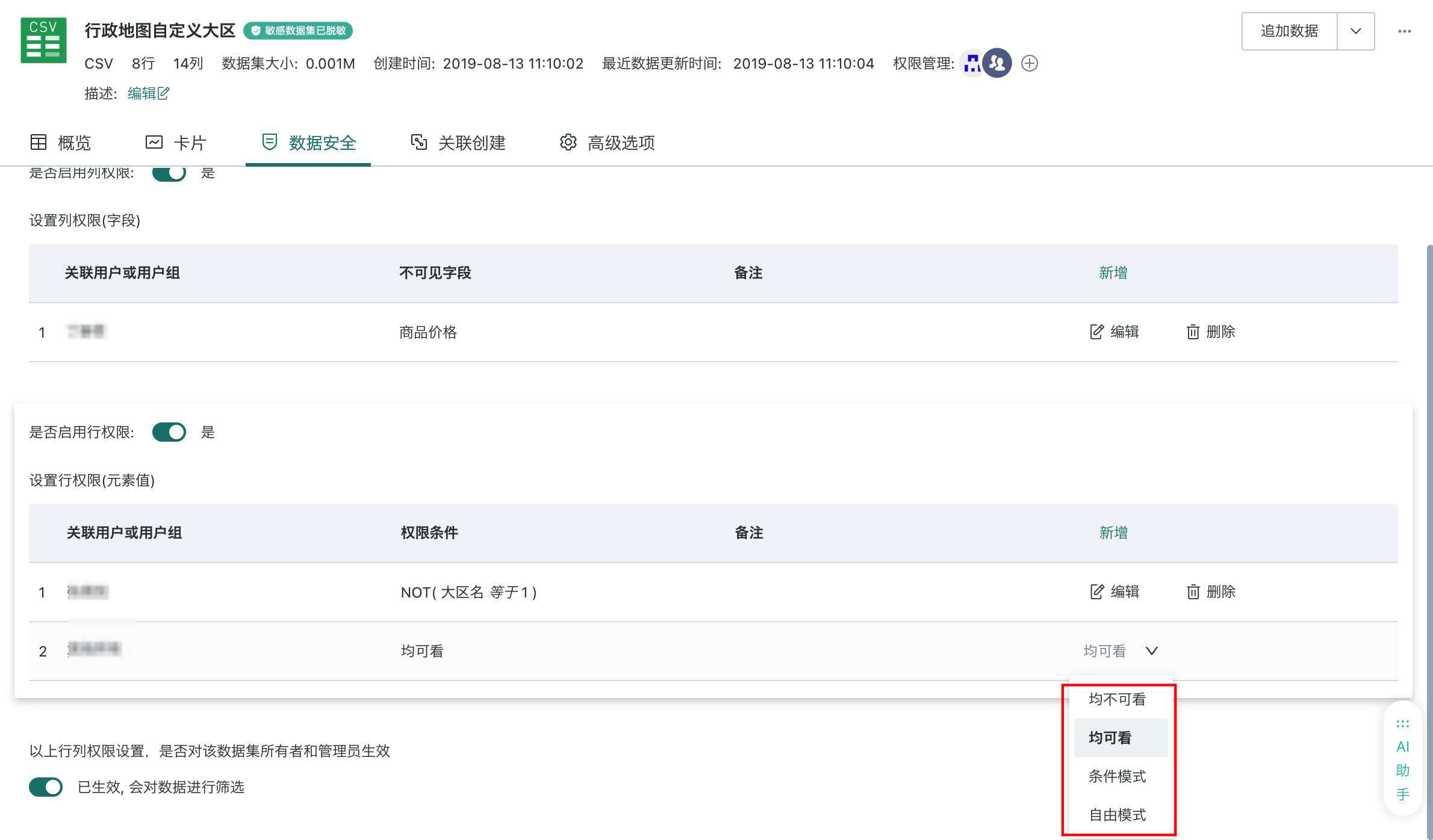 - 权限继承:基于当前数据集派生的子数据集或关联数据集,不会自动继承行列权限,需单独配置
