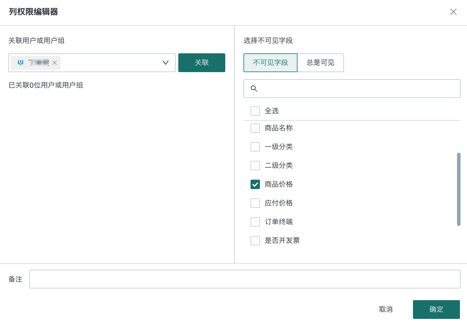- 列权限的对象:选择关联用户或用户组。