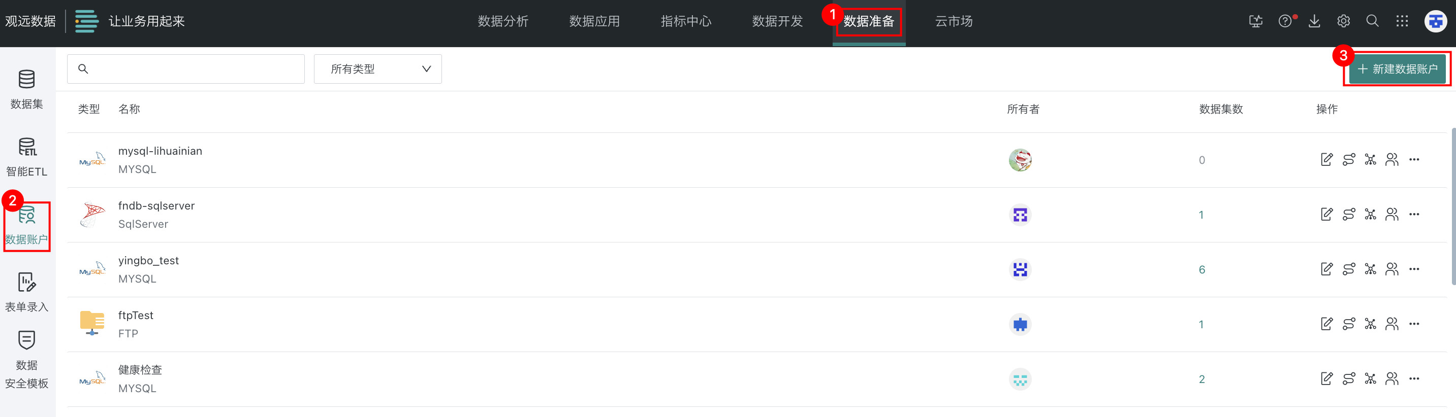 在「数据准备 > 数据账户」页面,点击「新建数据账户」。