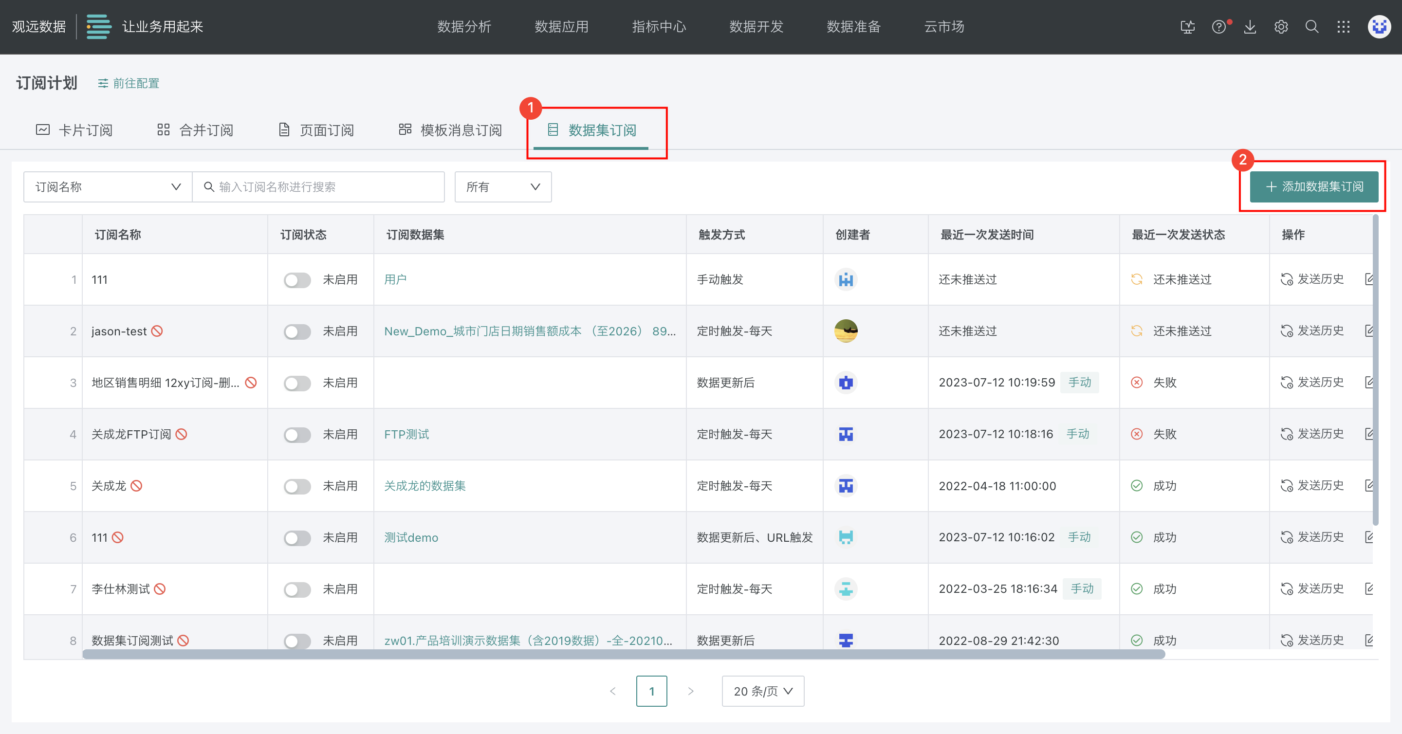 选择「数据集订阅」,点击右侧的「添加数据集订阅」按钮,即可进入「数据集订阅」的配置页面。