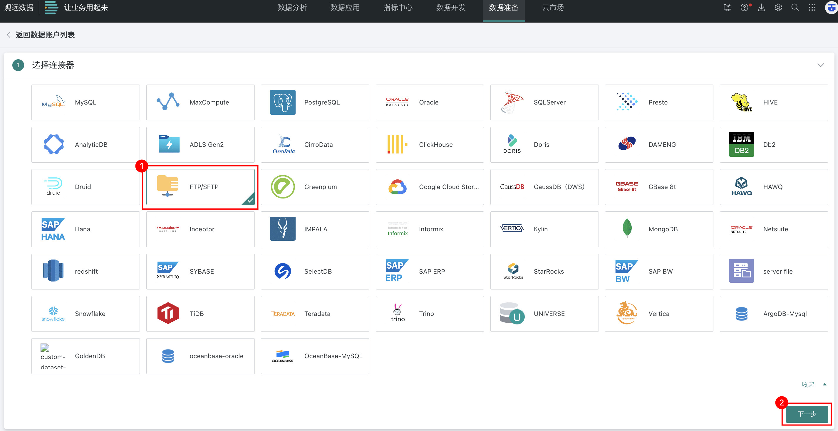 选择连接器为「FTP/SFTP」,点击「下一步」。