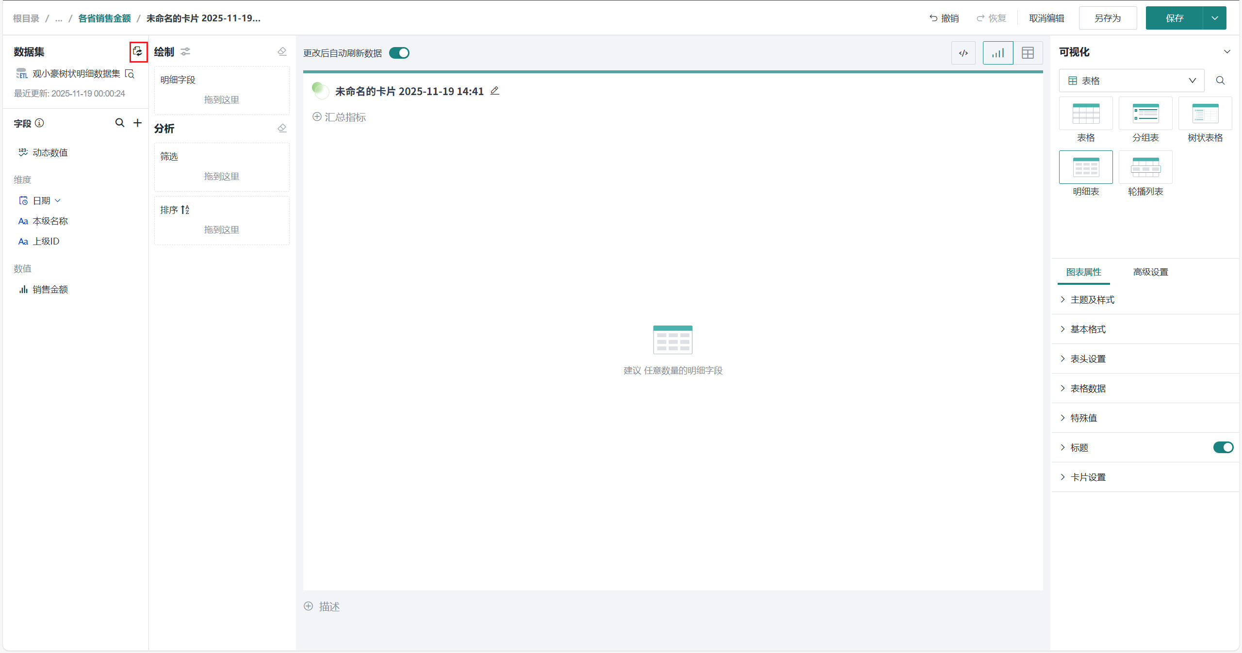 将「销售金额」字段拖至「排序」区域,方便快速查找最大值、最小值。默认升序,排序详细配置可参考数据排序。
