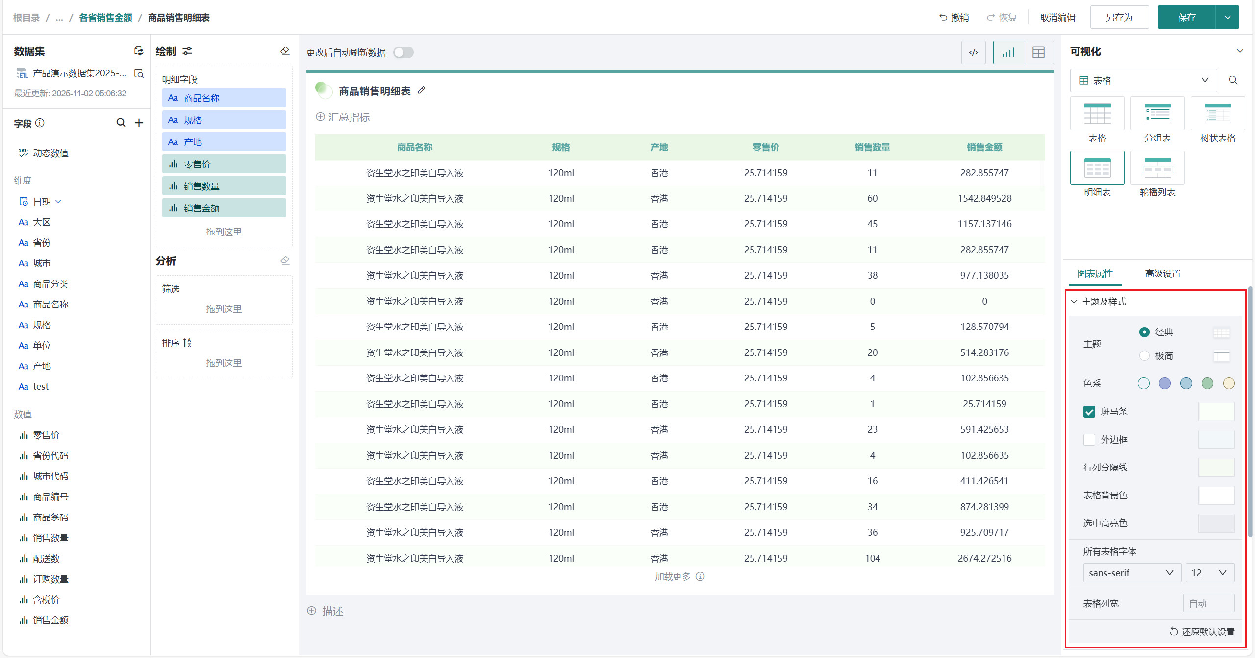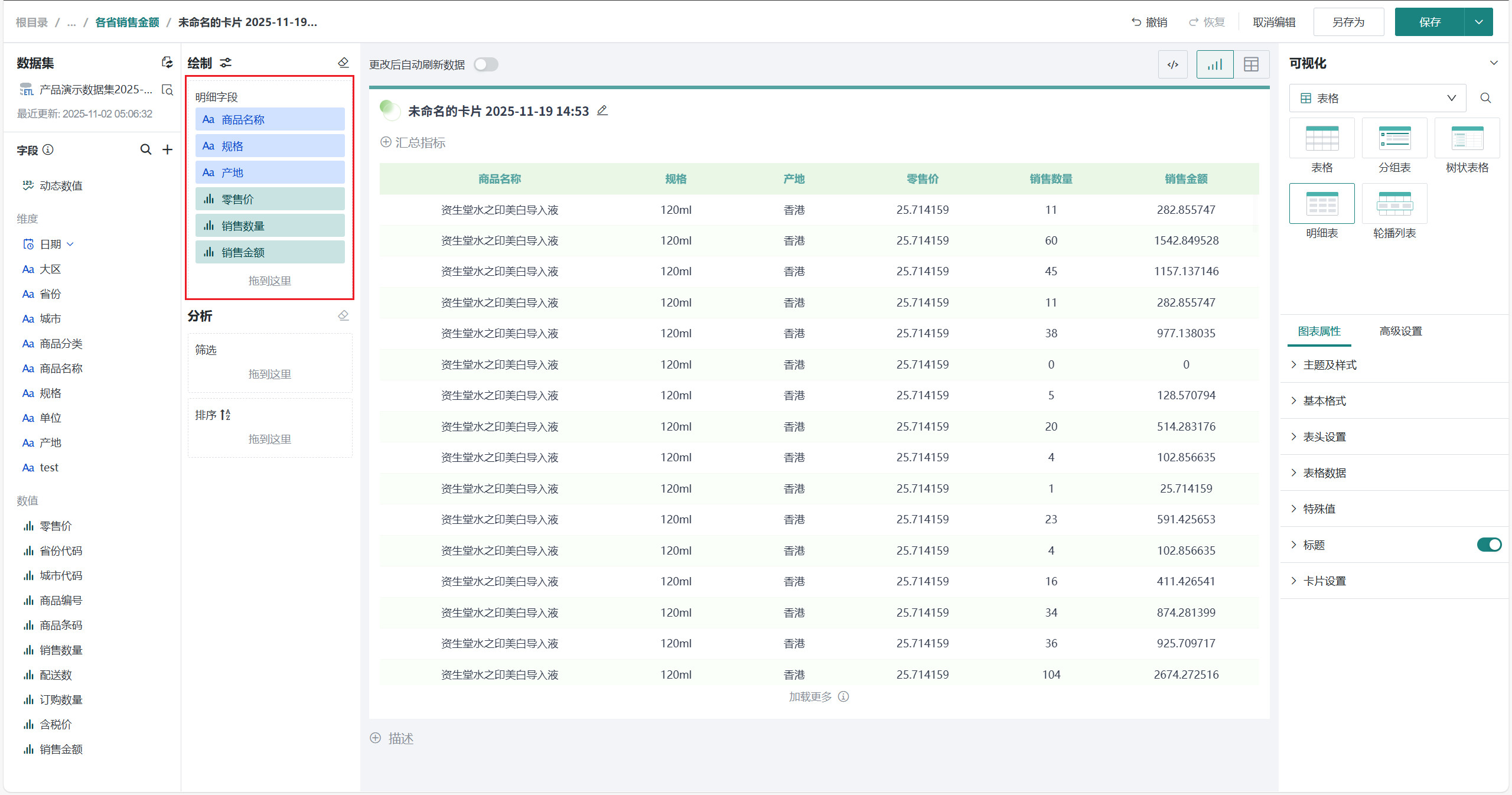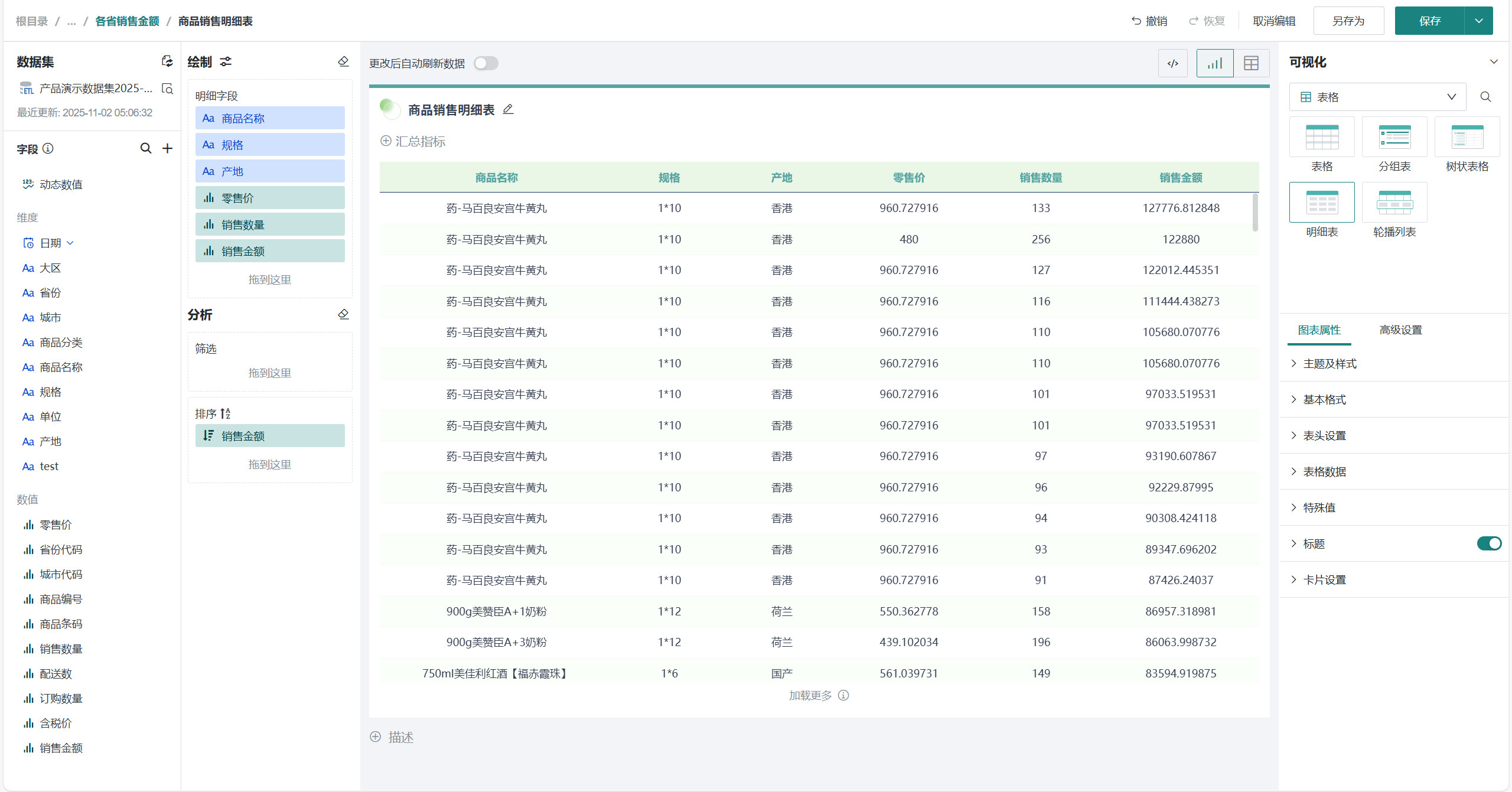 选择「可视化>表格>明细表」,将左侧「字段」区域的需要展示的字段(如「商品名称」、「规格」、「产地」、「零售价」、「销售数量」、「销售金额」等)拖至「绘制」区域的「明细字段」。