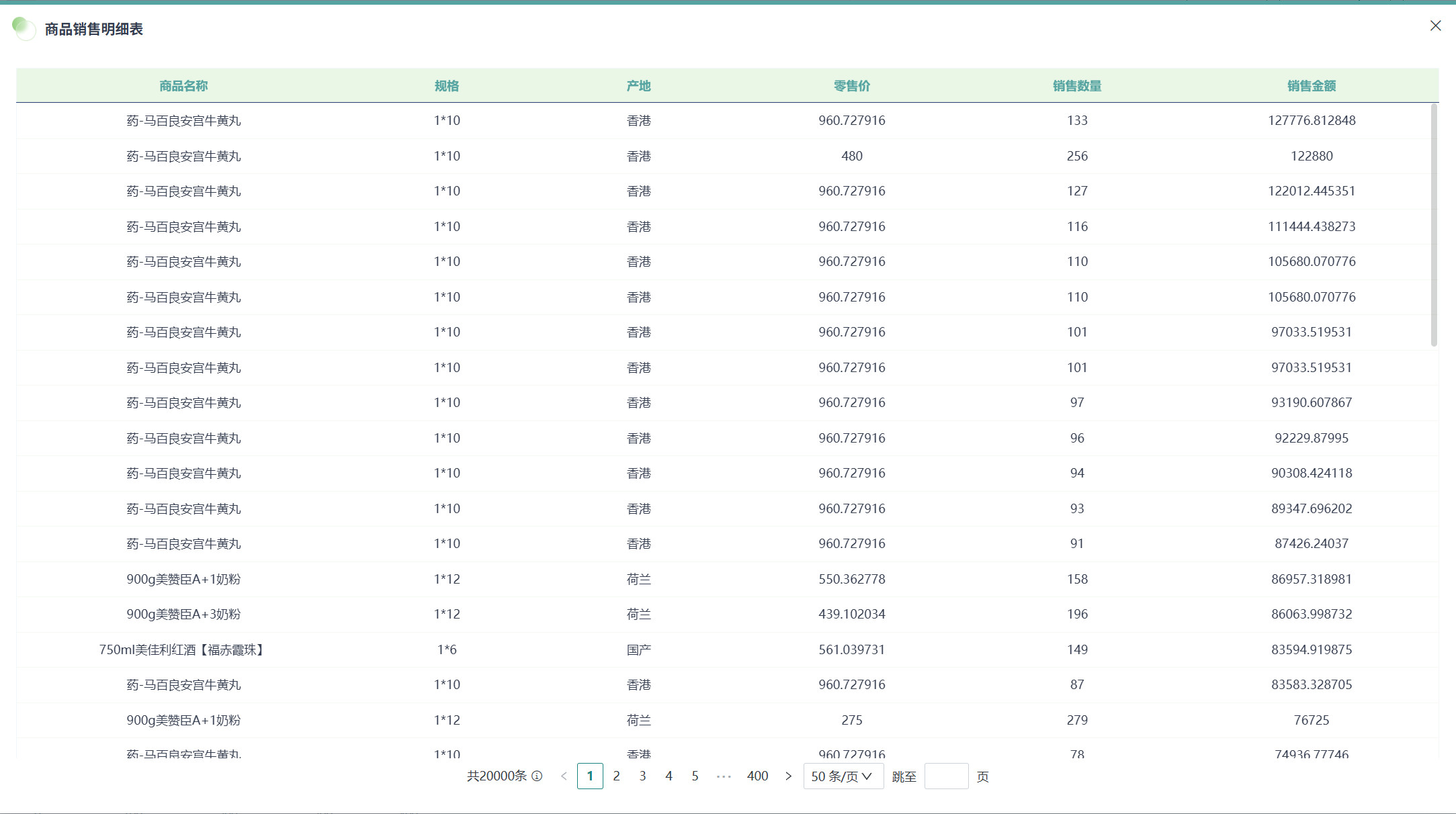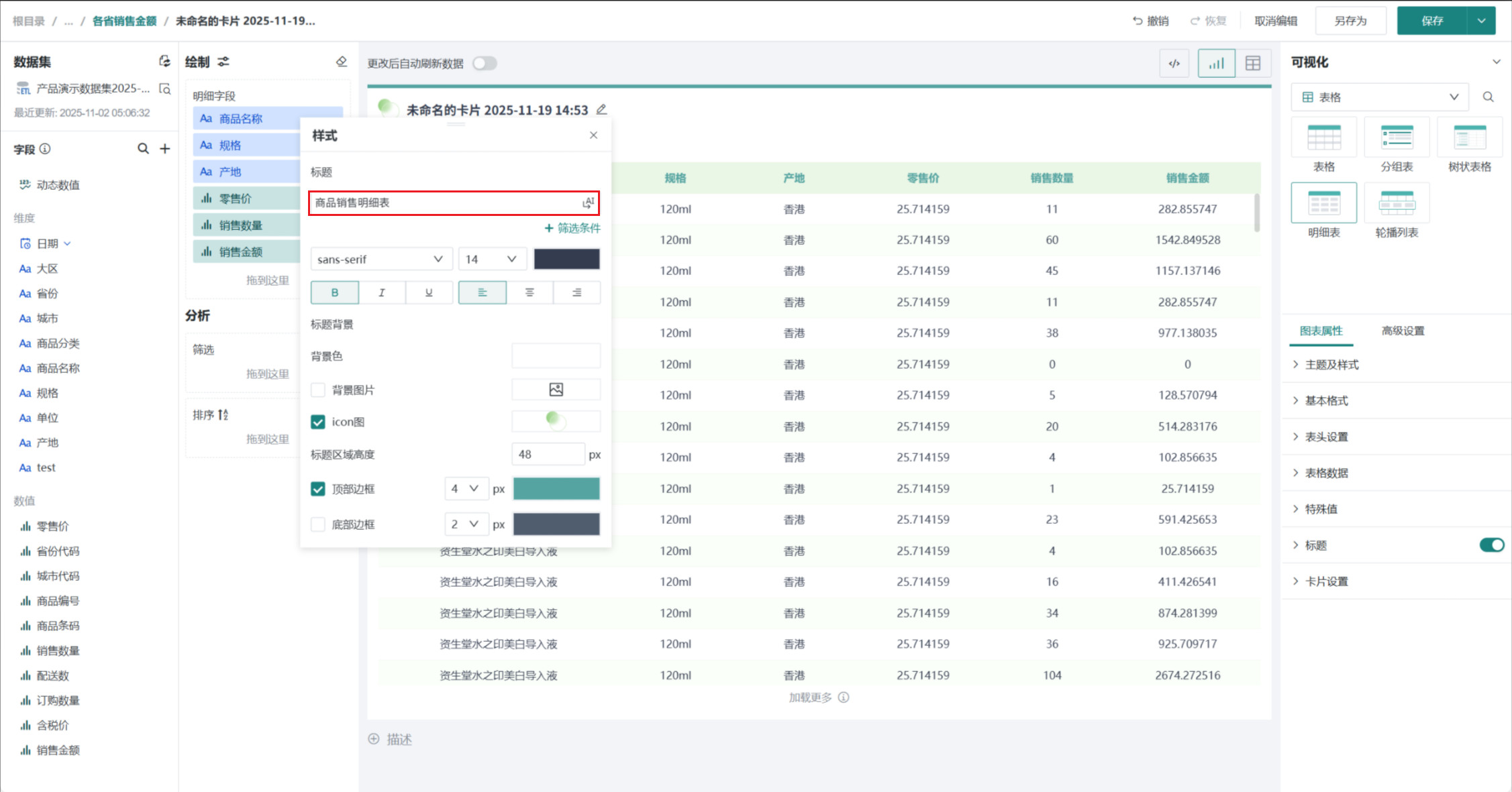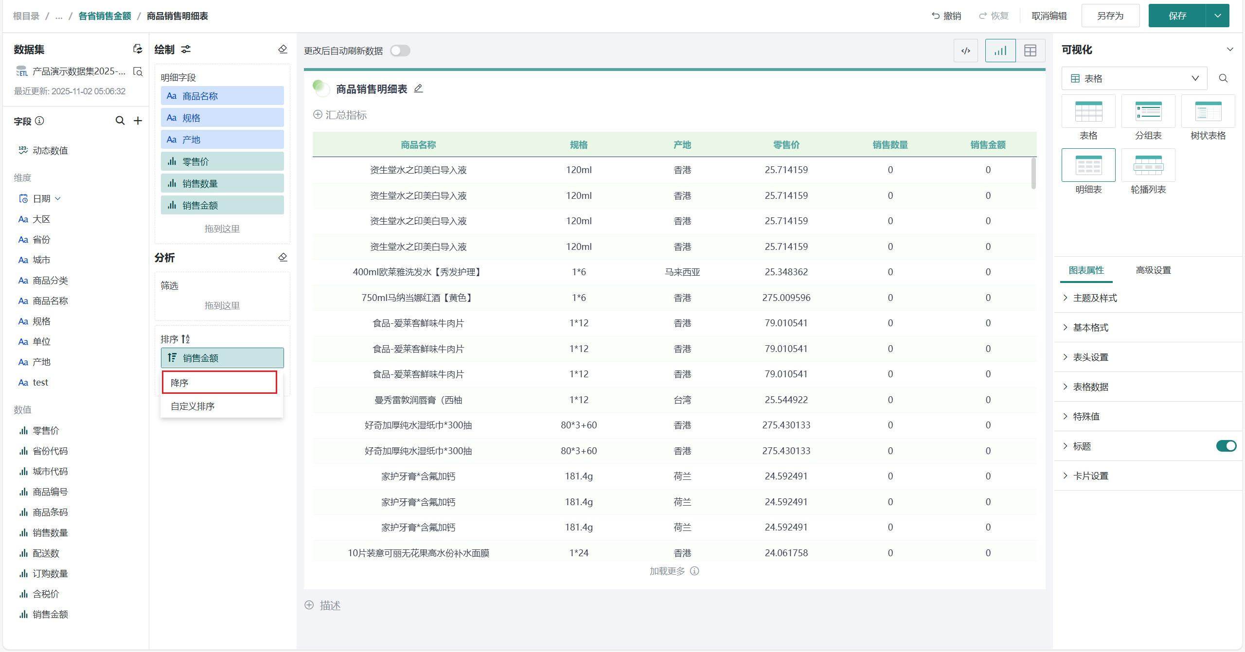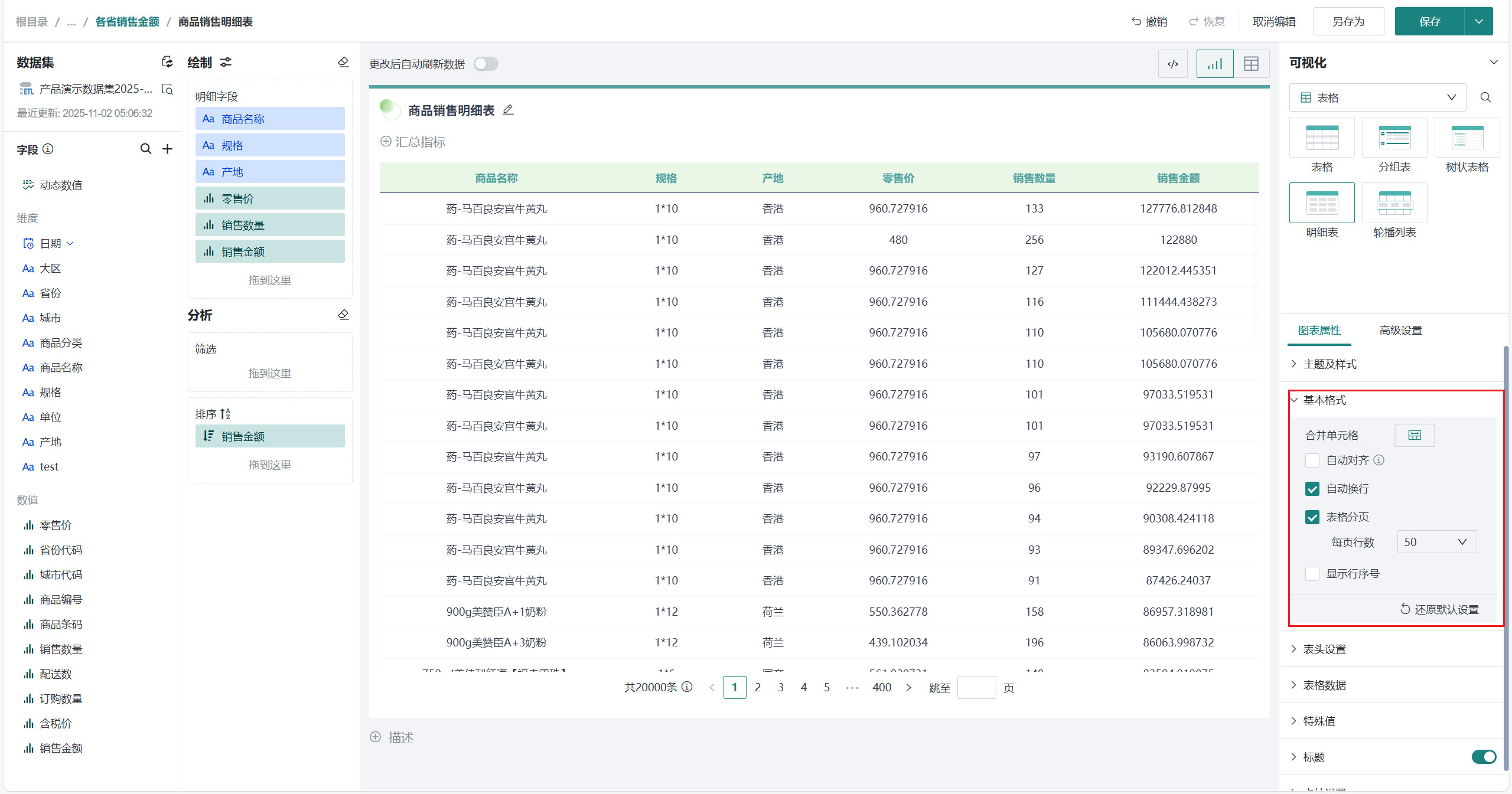 选择「可视化>表格>明细表」,将左侧「字段」区域的需要展示的字段(如「商品名称」、「规格」、「产地」、「零售价」、「销售数量」、「销售金额」等)拖至「绘制」区域的「明细字段」。