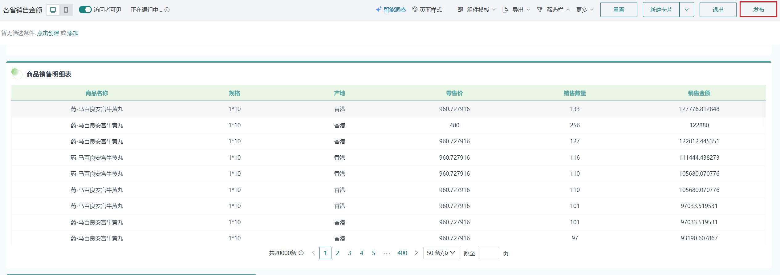 - 点击「发布」,将仪表板发布上线。