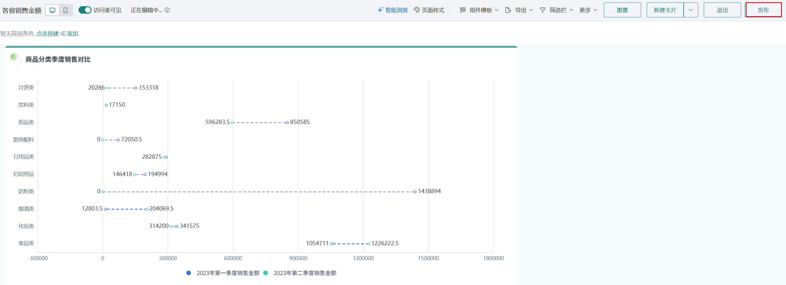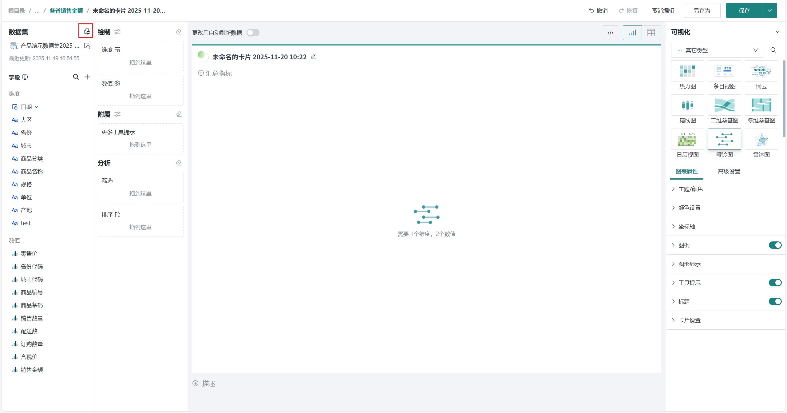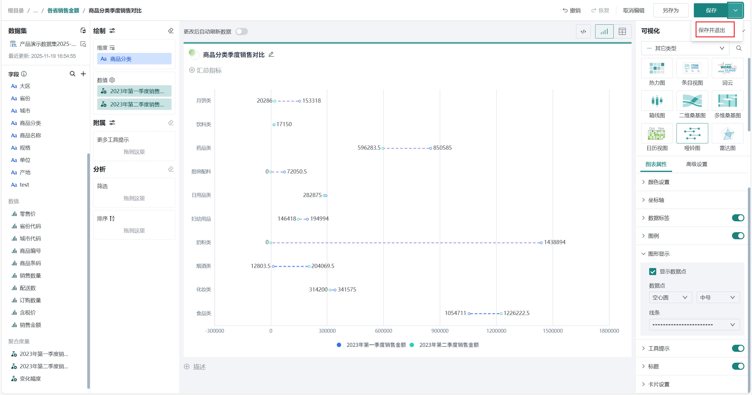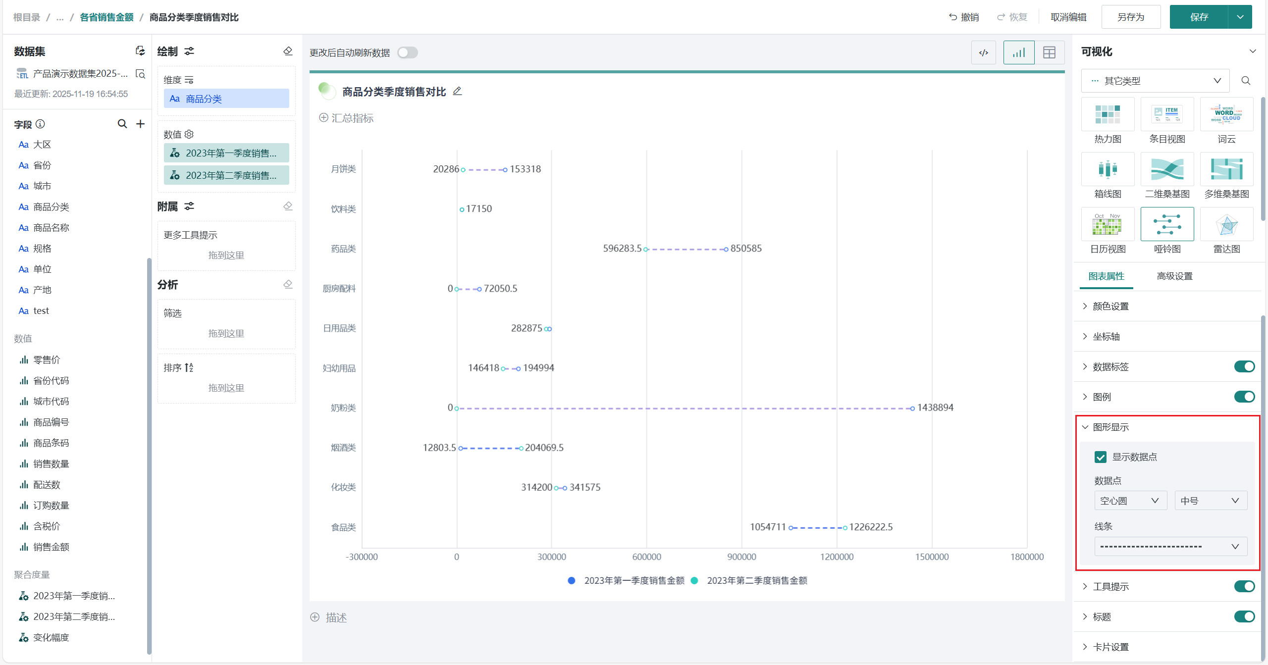 若需要切换分析数据集,可点击页面左上角「切换数据集」按钮。选择「可视化>其它类型>哑铃图」。