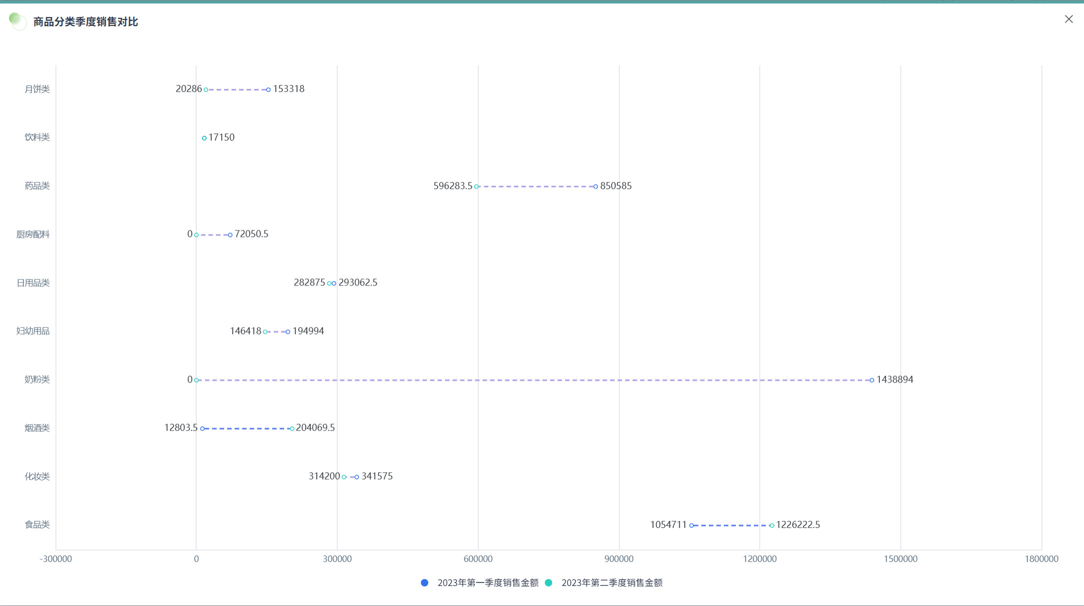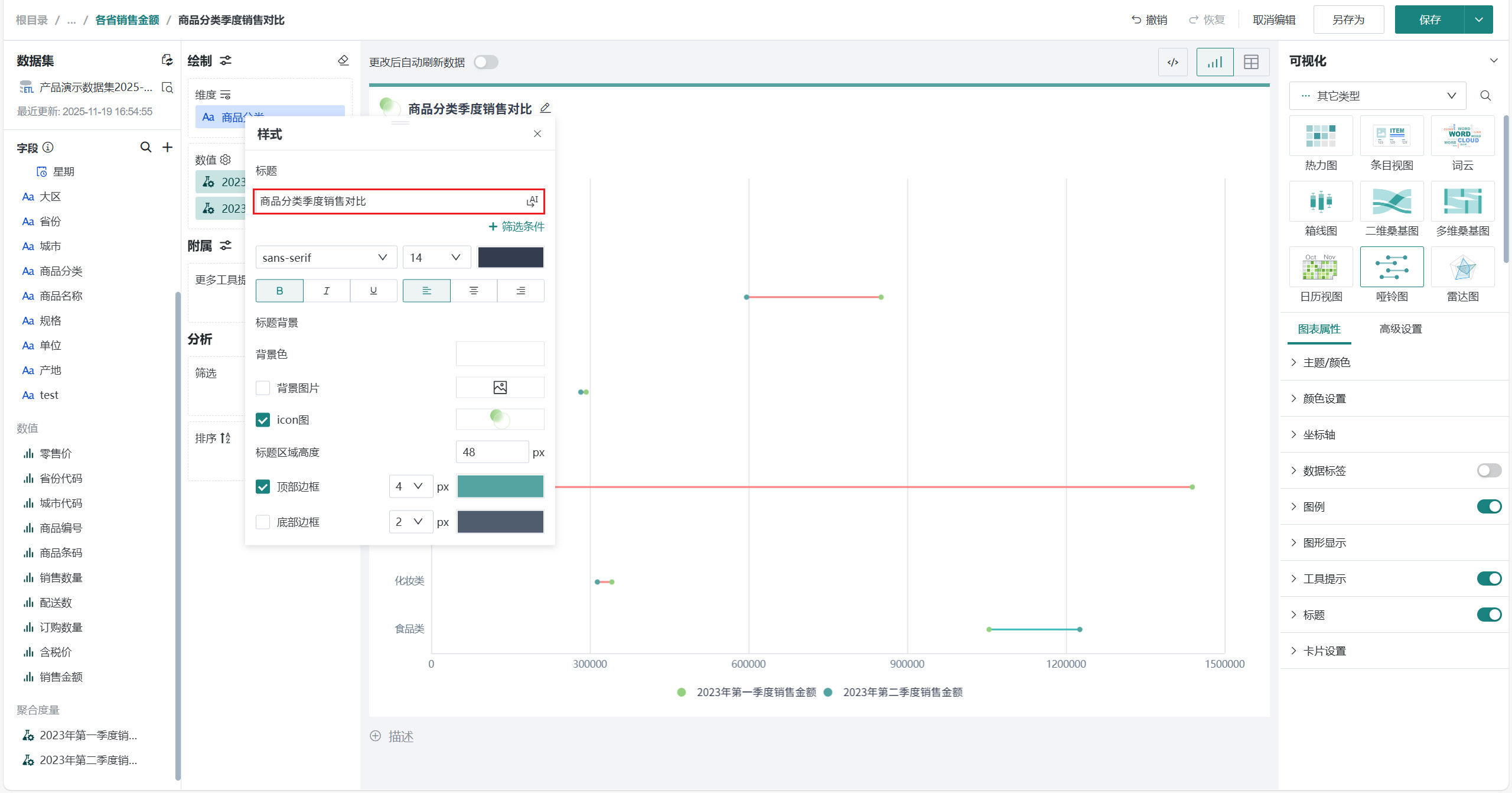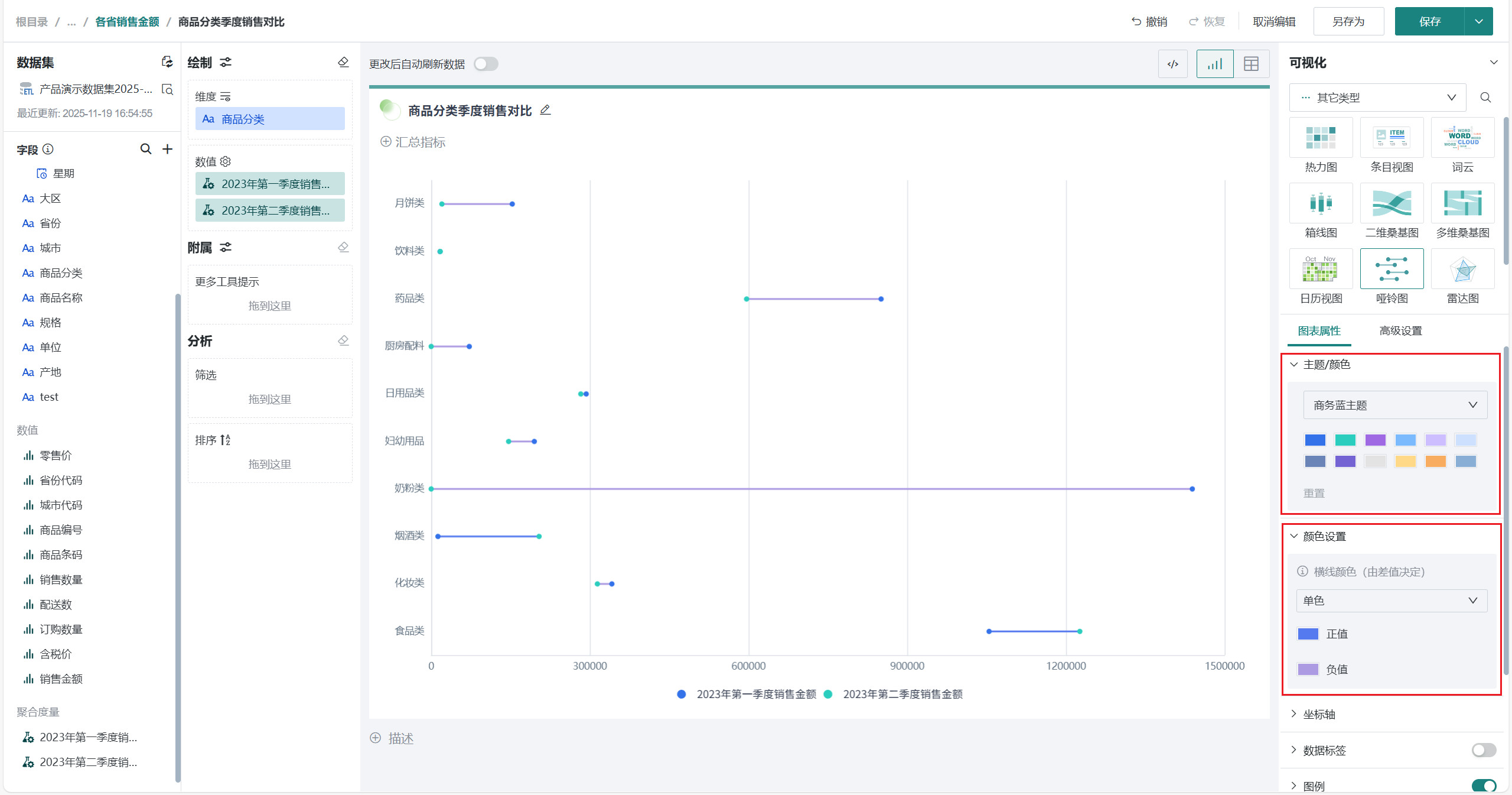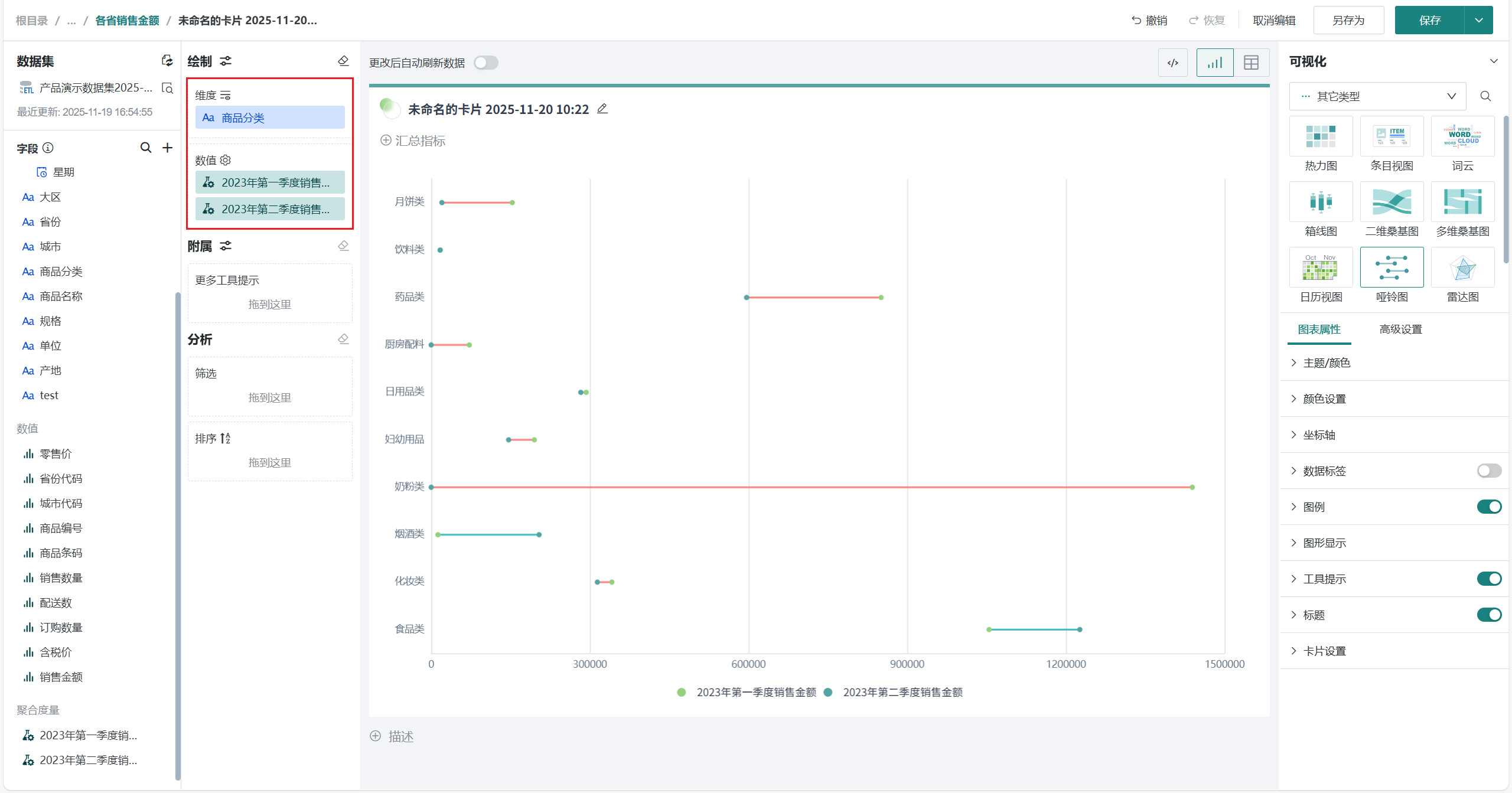 将左侧「字段」区域的类别字段(如「产品类别」)拖至「绘制」区域的「维度」,将起始数值字段(如「第一季度销售额」)和结束数值字段(如「第二季度销售额」)按先后顺序分别拖入「数值」。