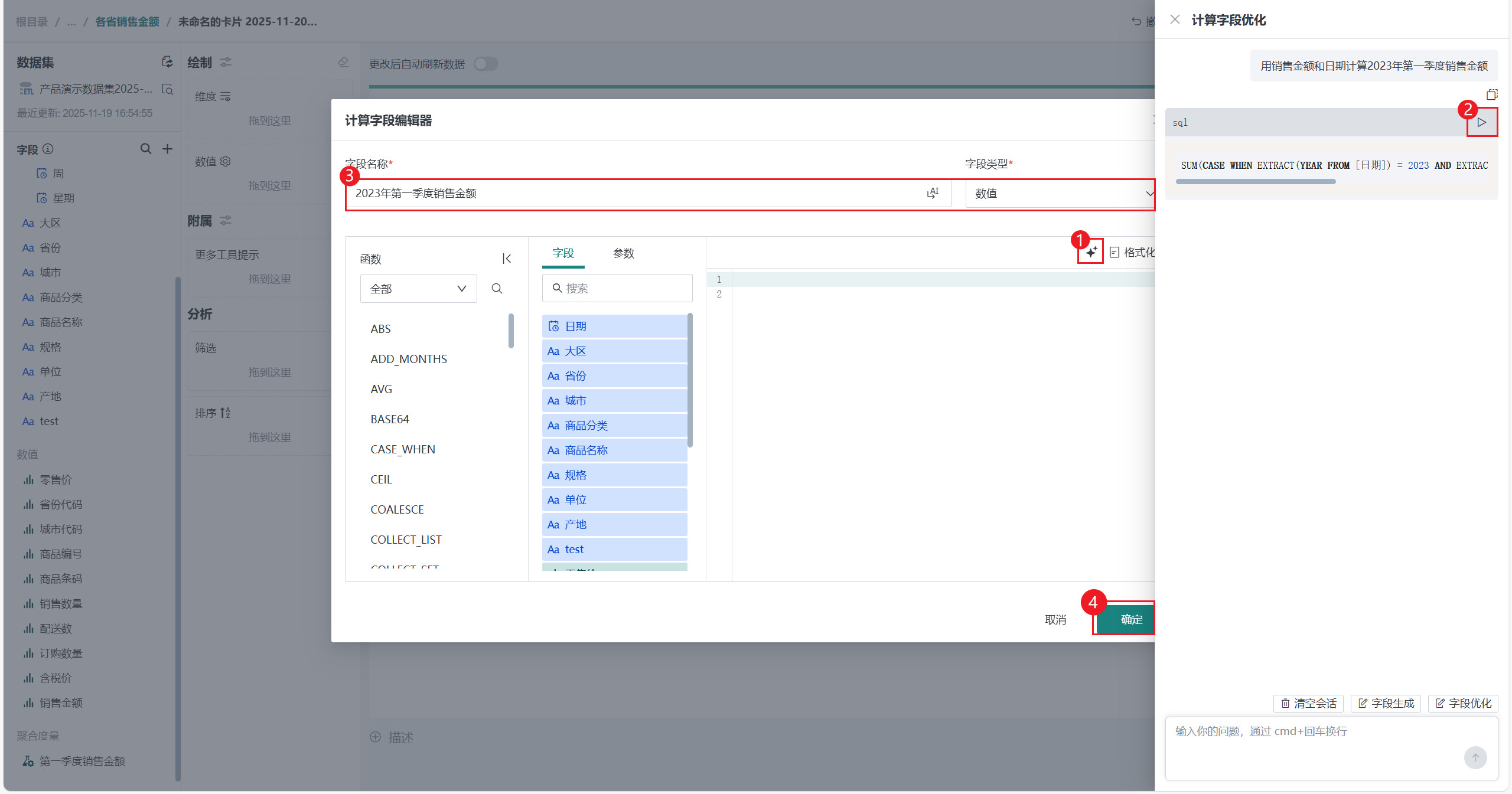 (按需)在「计算字段编辑器」中输入sql或点击「智能编码」,输入需求后点击「运行」,标注字段名称和字段类型后点击「确认」,完成新建字段。