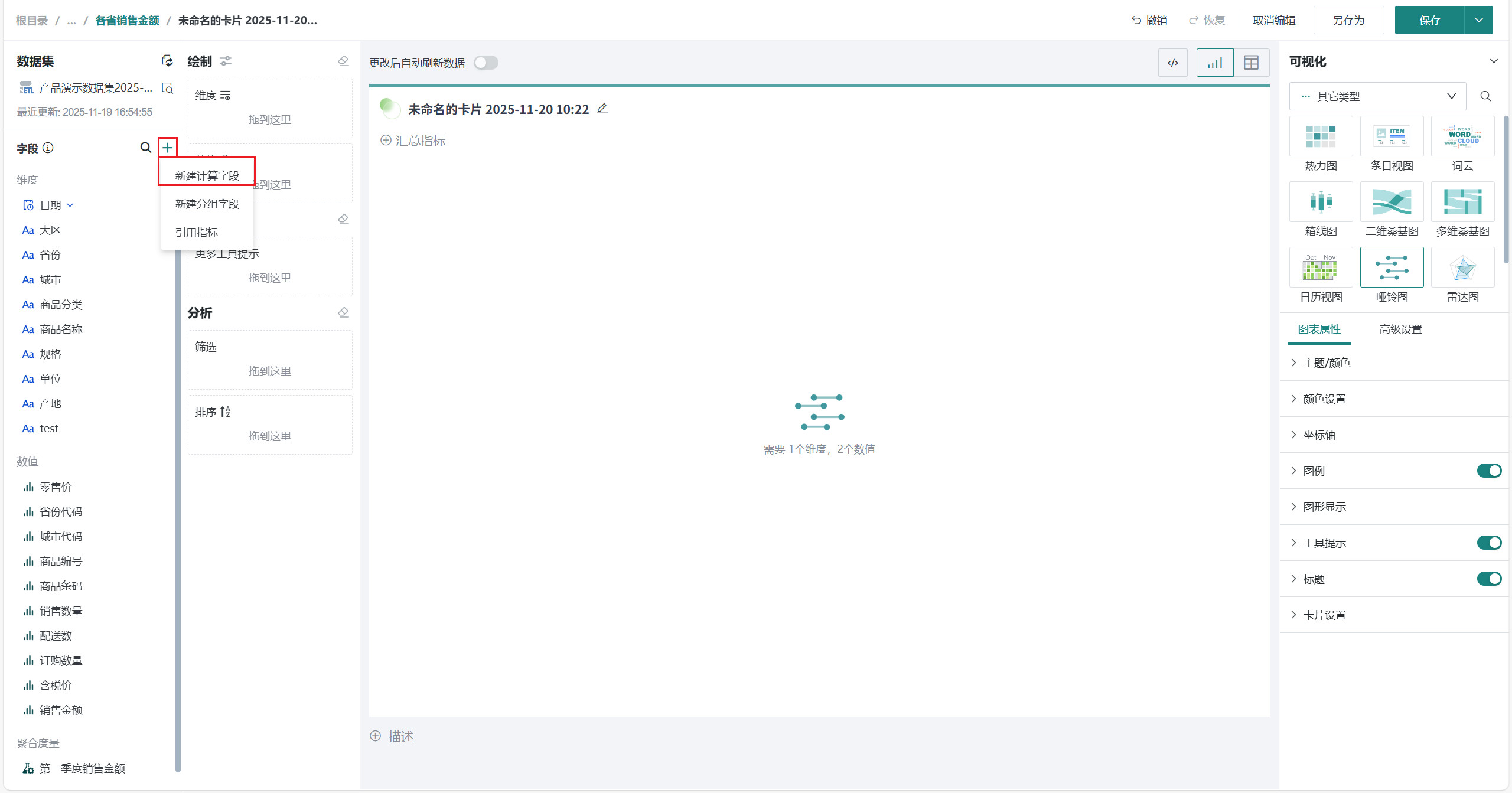(按需)在此情境中需要不同产品在两个季度的销售对比,因此需要新建字段分别表示第一、第二季度的销售金额。点击「+」,选择新建字段。