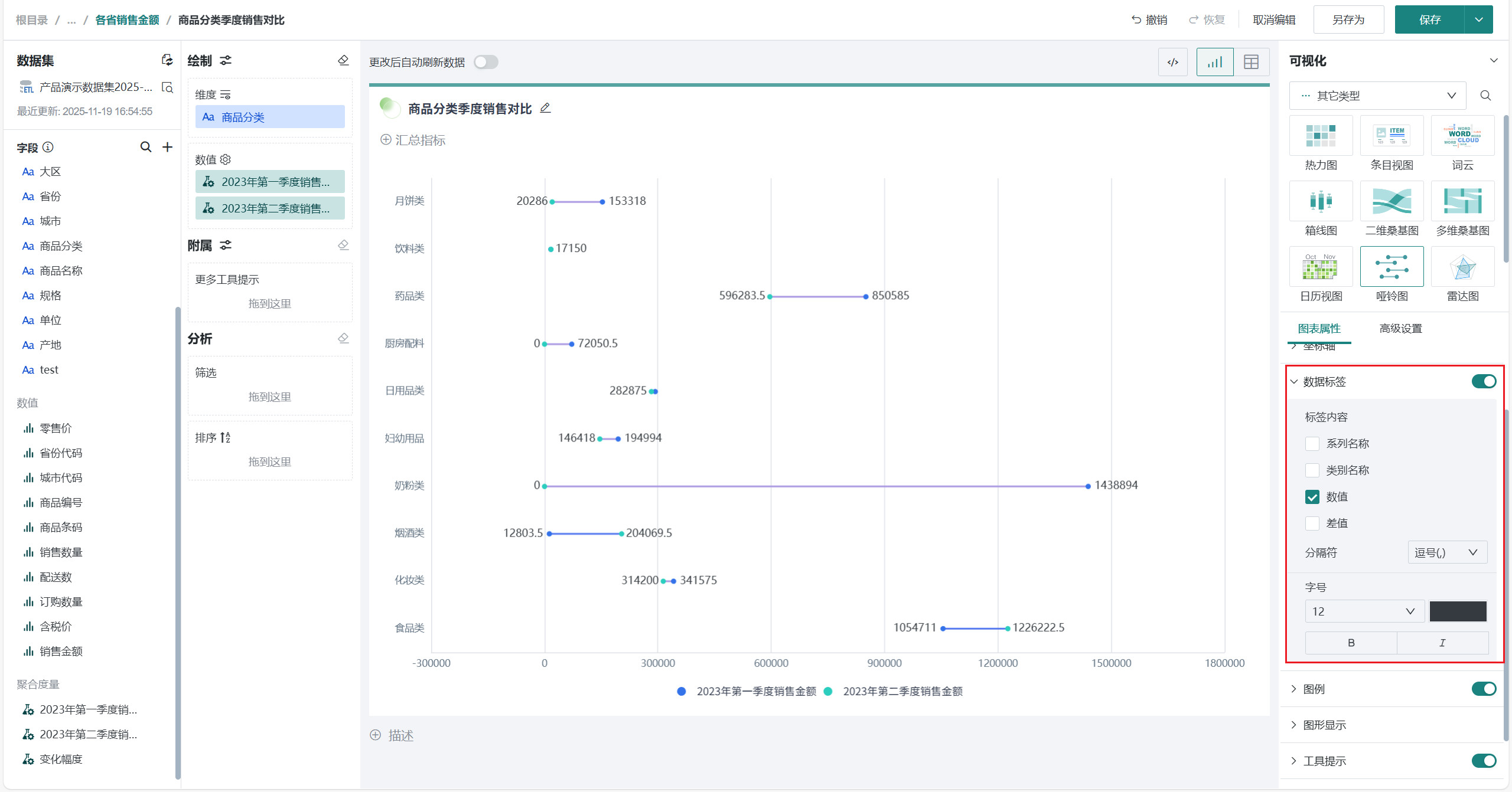 在「图表属性」区域打开「数据标签」按钮,可选择显示起始值、结束值或差值,便于直观查看具体数据。也可以设置标签的显示位置、字体大小和颜色。