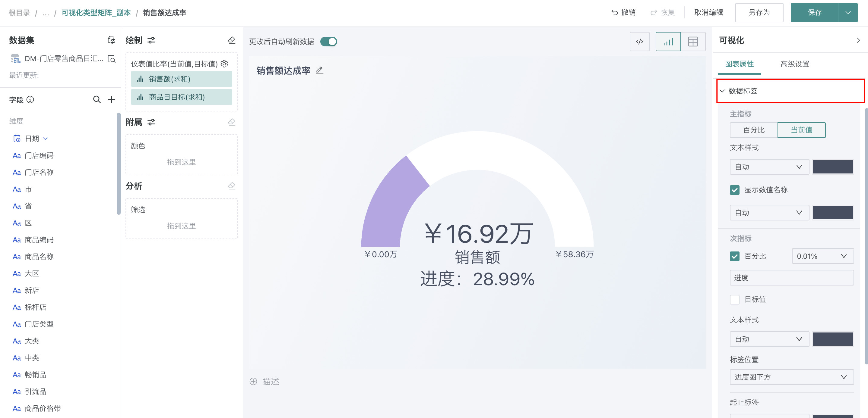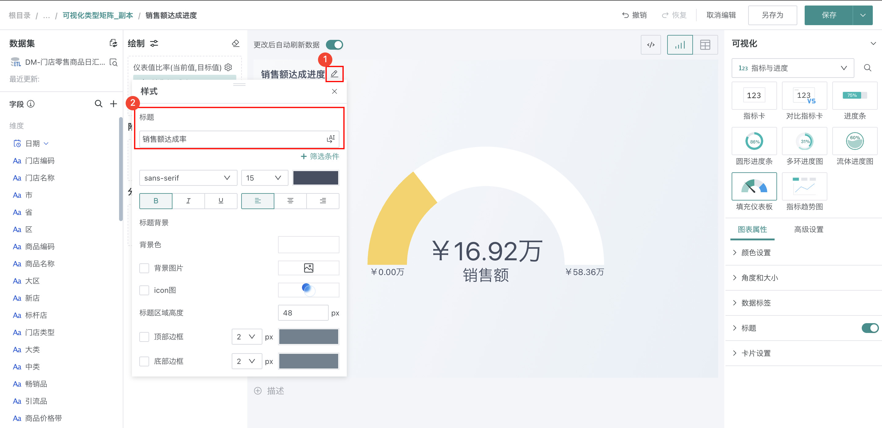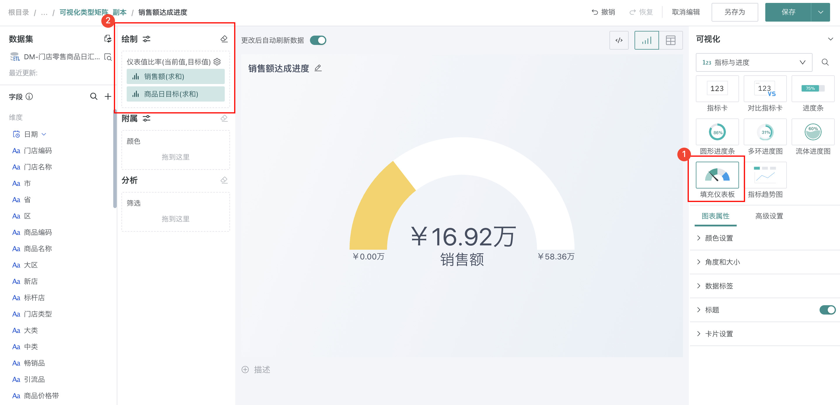 在「可视化」区域中选择「填充仪表板」,将左侧「数据集」区域的「销售额」和「商品日目标」拖至「绘制」区域的「数值」。