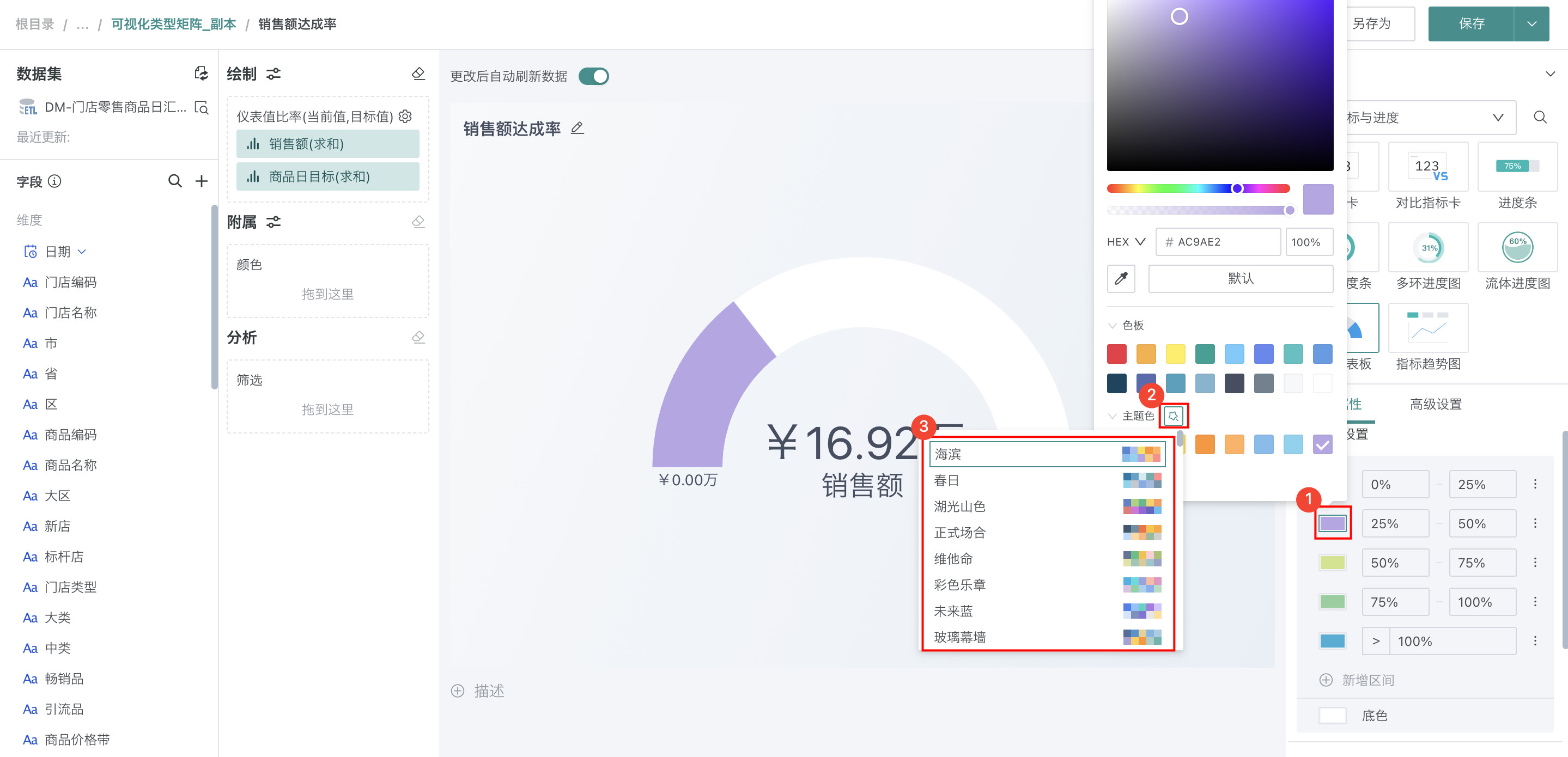 在「图表属性」区域的「颜色设置」中,可以对区间颜色进行选择,点击「主题色」旁边的按钮可以选择颜色主题。