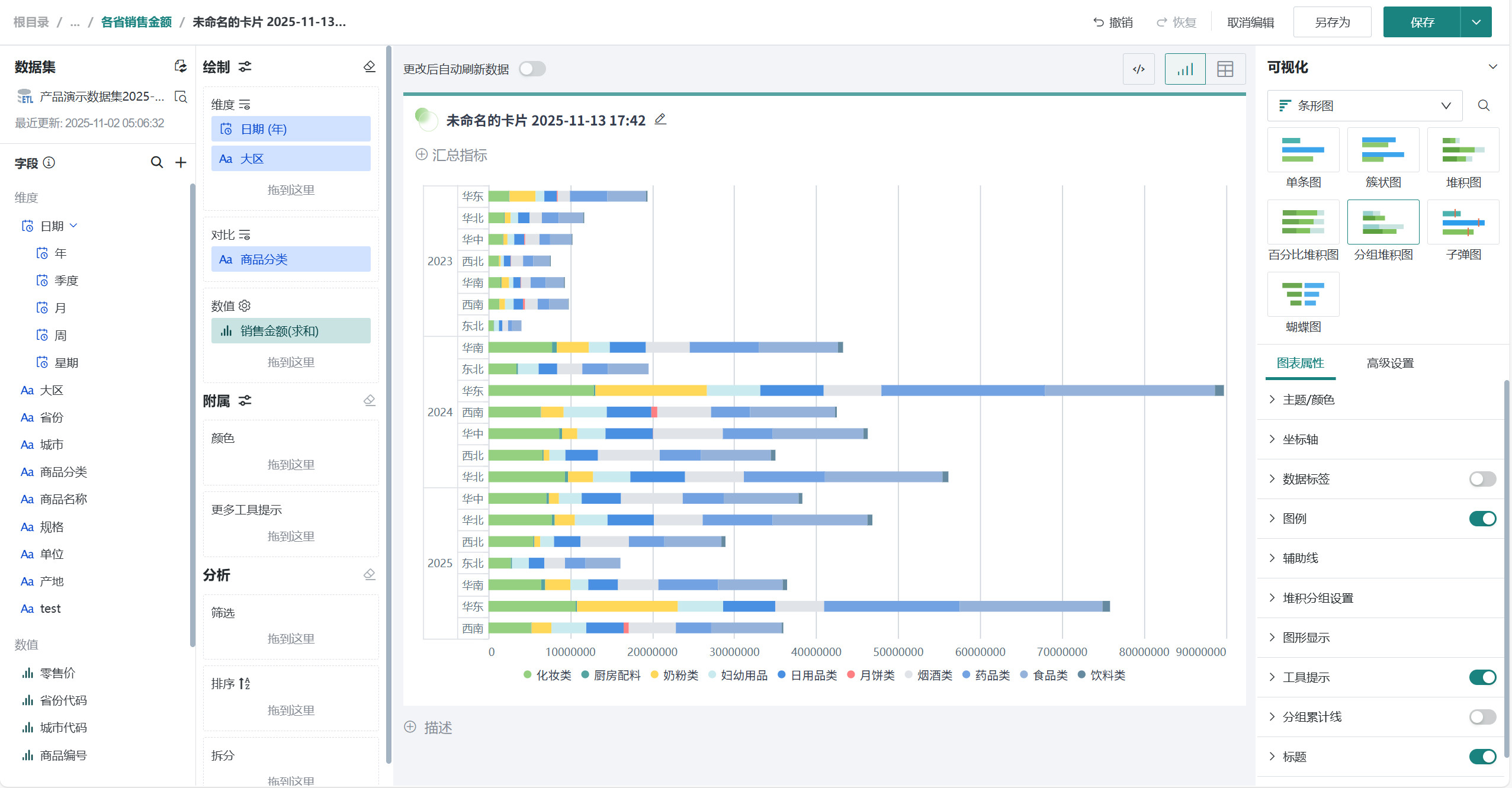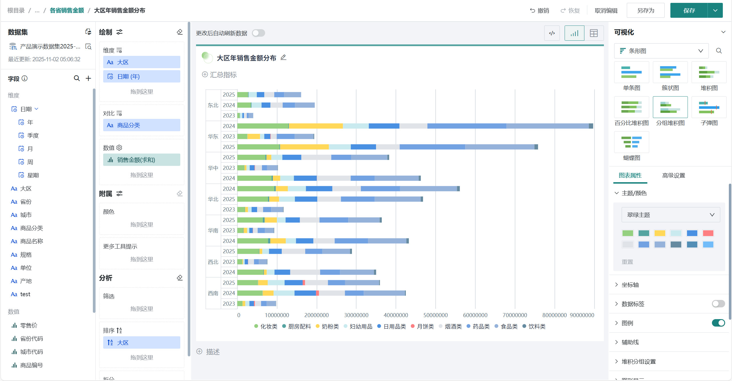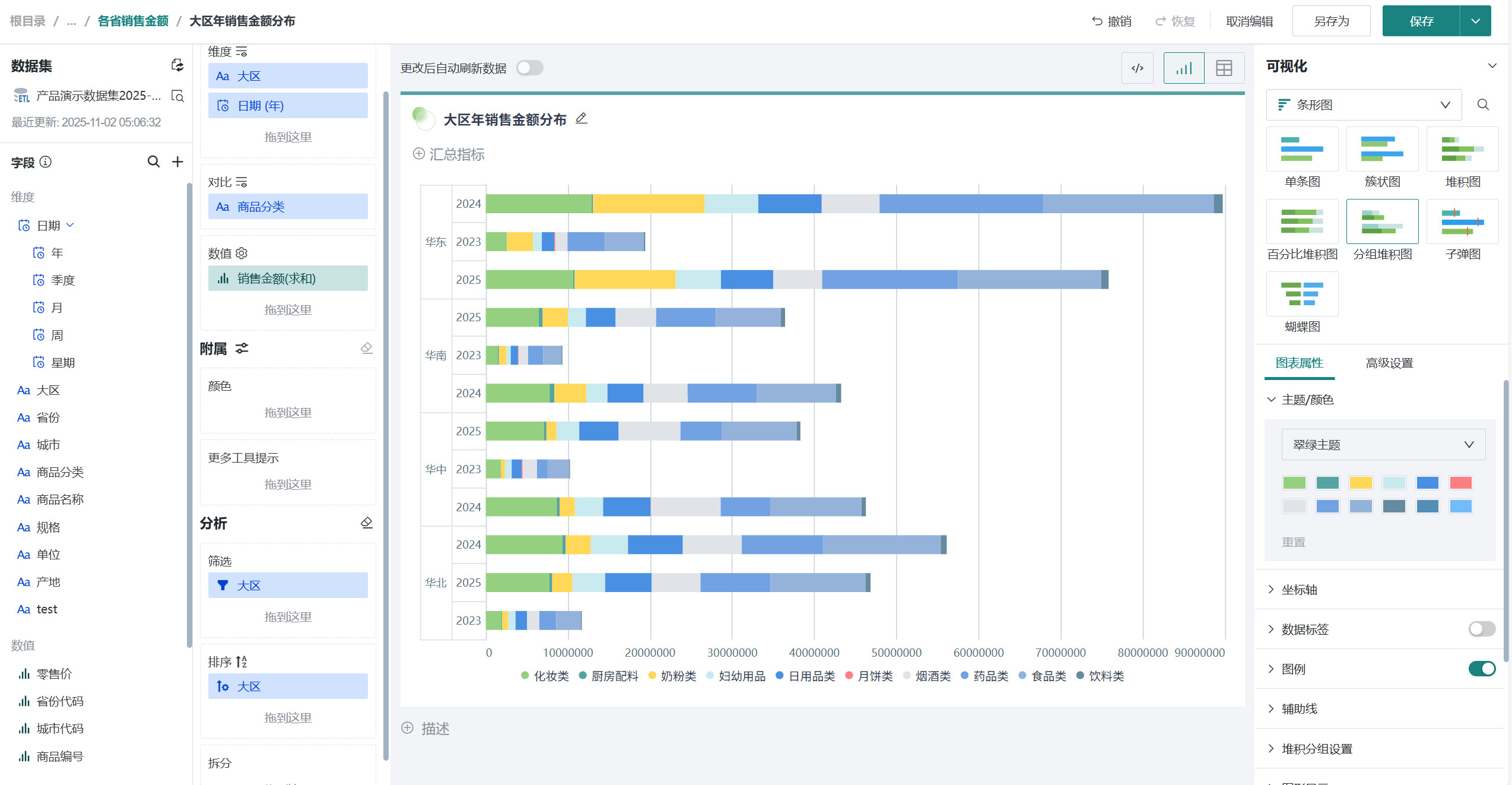 将左侧「数据集」区域的「大区」和「日期(年)」拖至「绘制」区域的「维度」。 将我们需要的「销售金额」拖至「绘制」区域的「数值」,最后将「商品分类」拖至「绘制」区域的「对比」。
