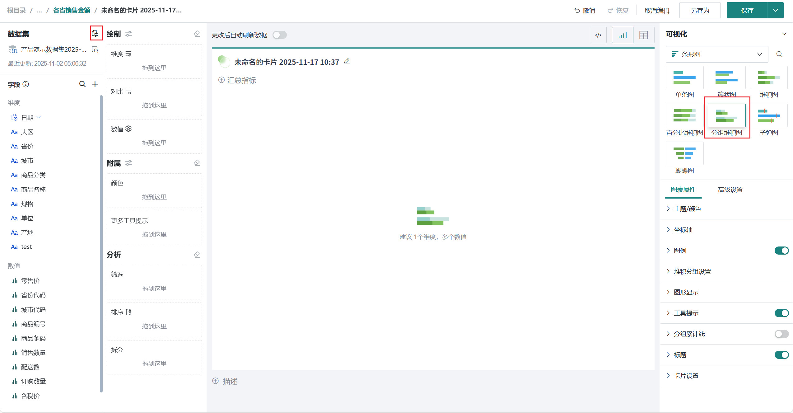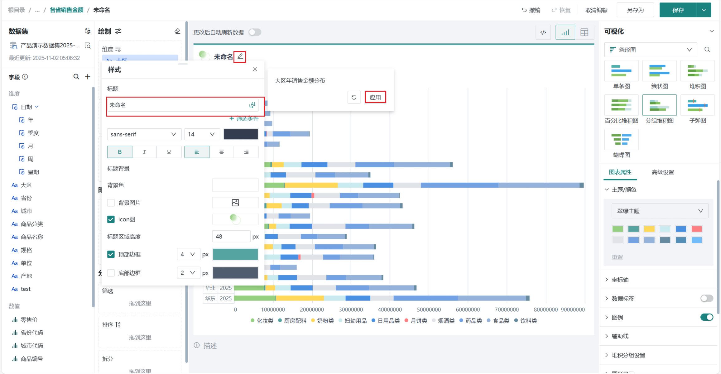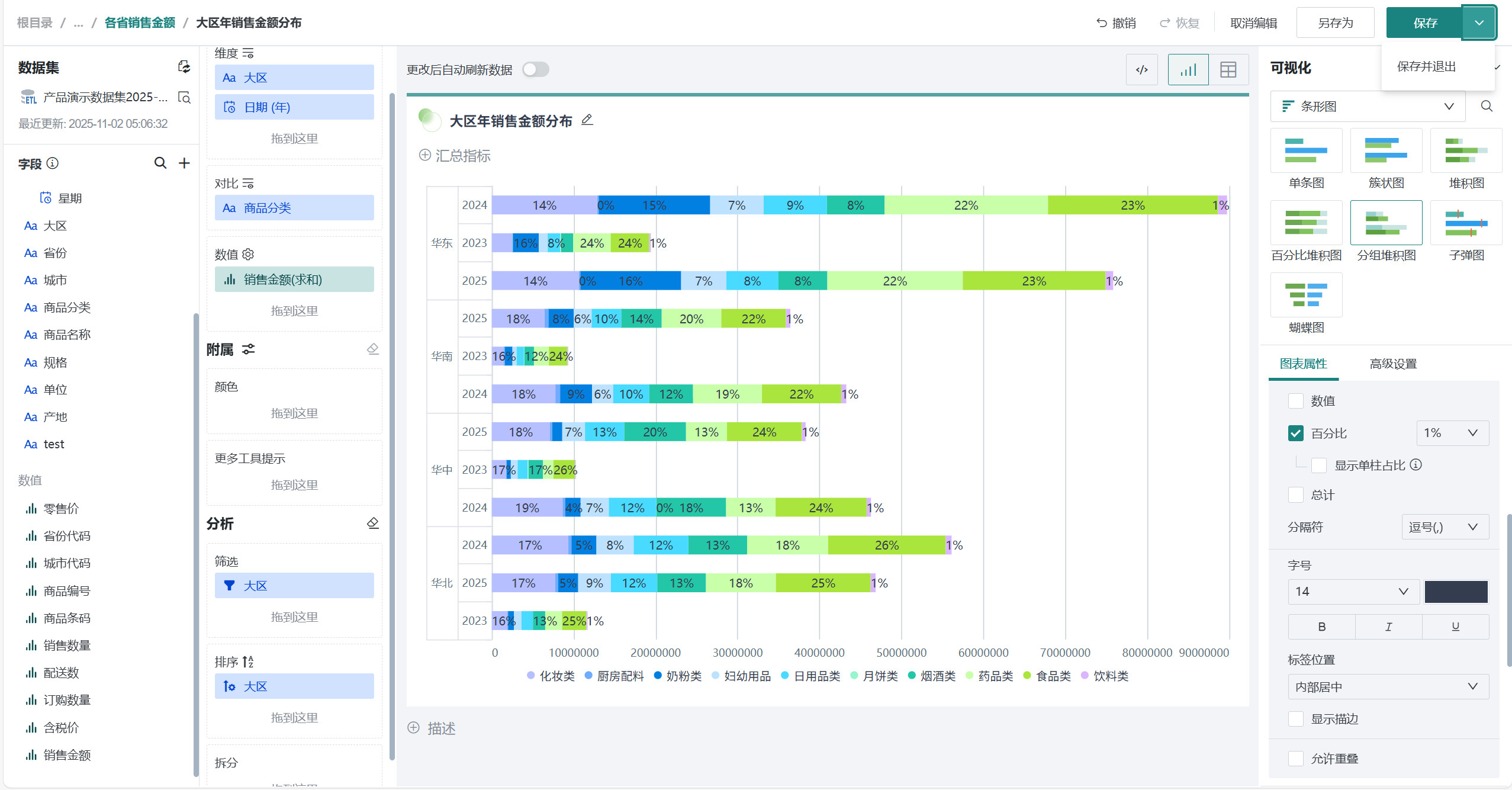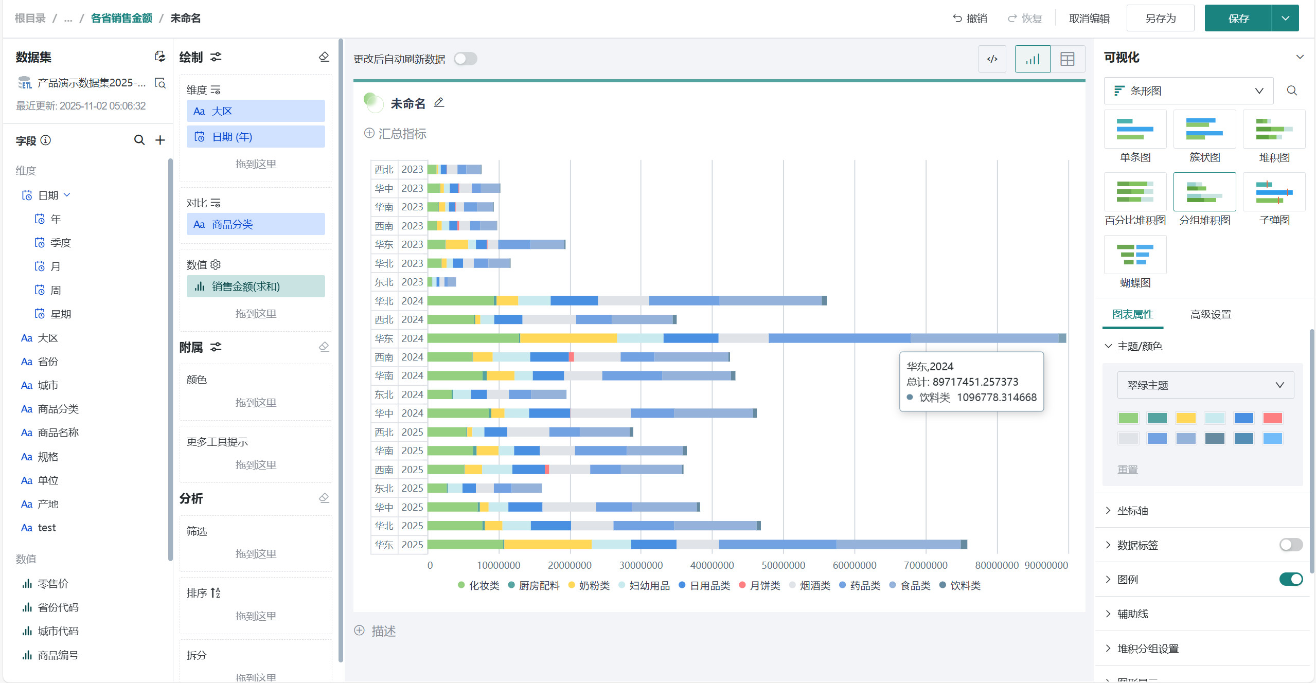 将左侧「数据集」区域的「大区」和「日期(年)」拖至「绘制」区域的「维度」。 将我们需要的「销售金额」拖至「绘制」区域的「数值」,最后将「商品分类」拖至「绘制」区域的「对比」。