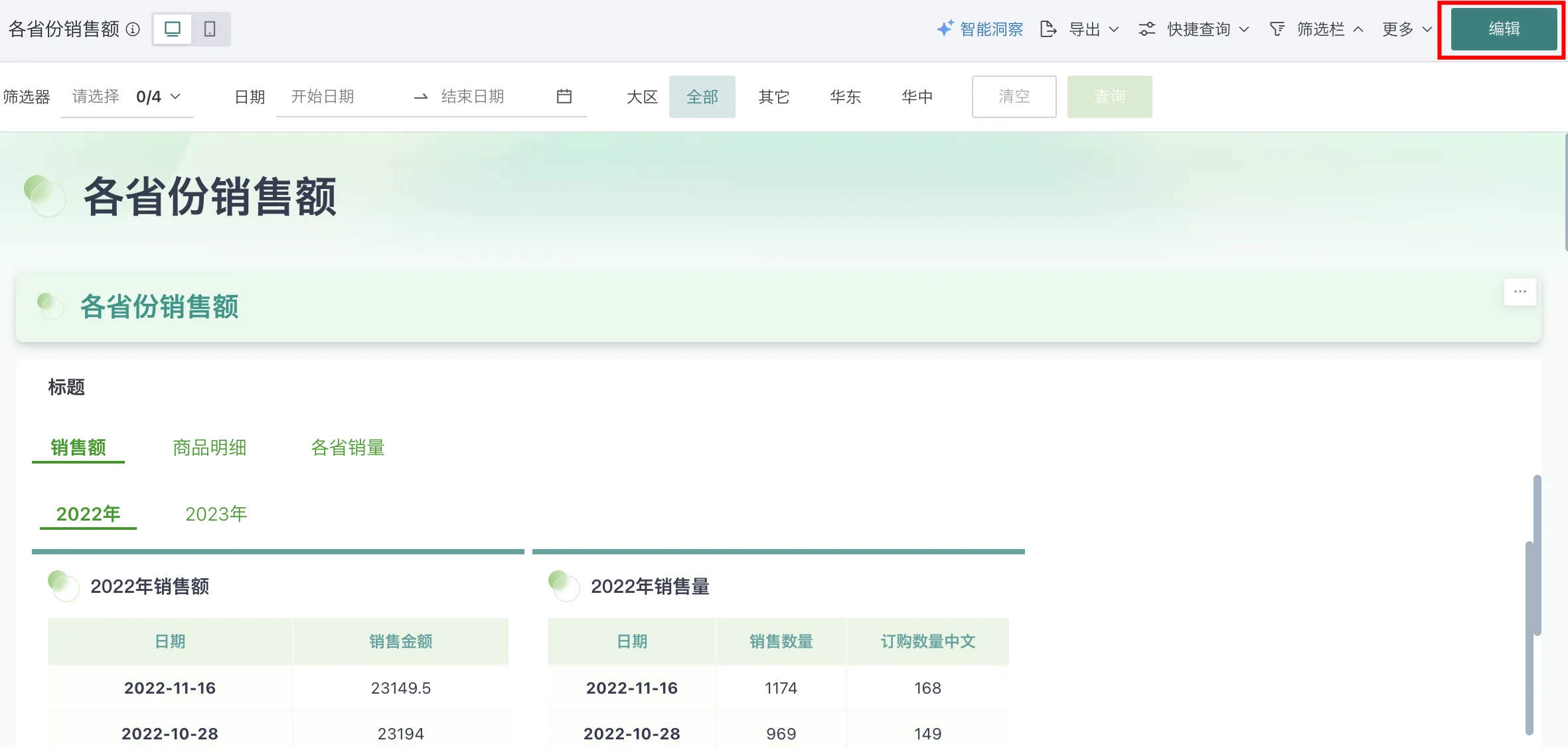 点击仪表板首页右上角「编辑」按钮,进入仪表板编辑页面。