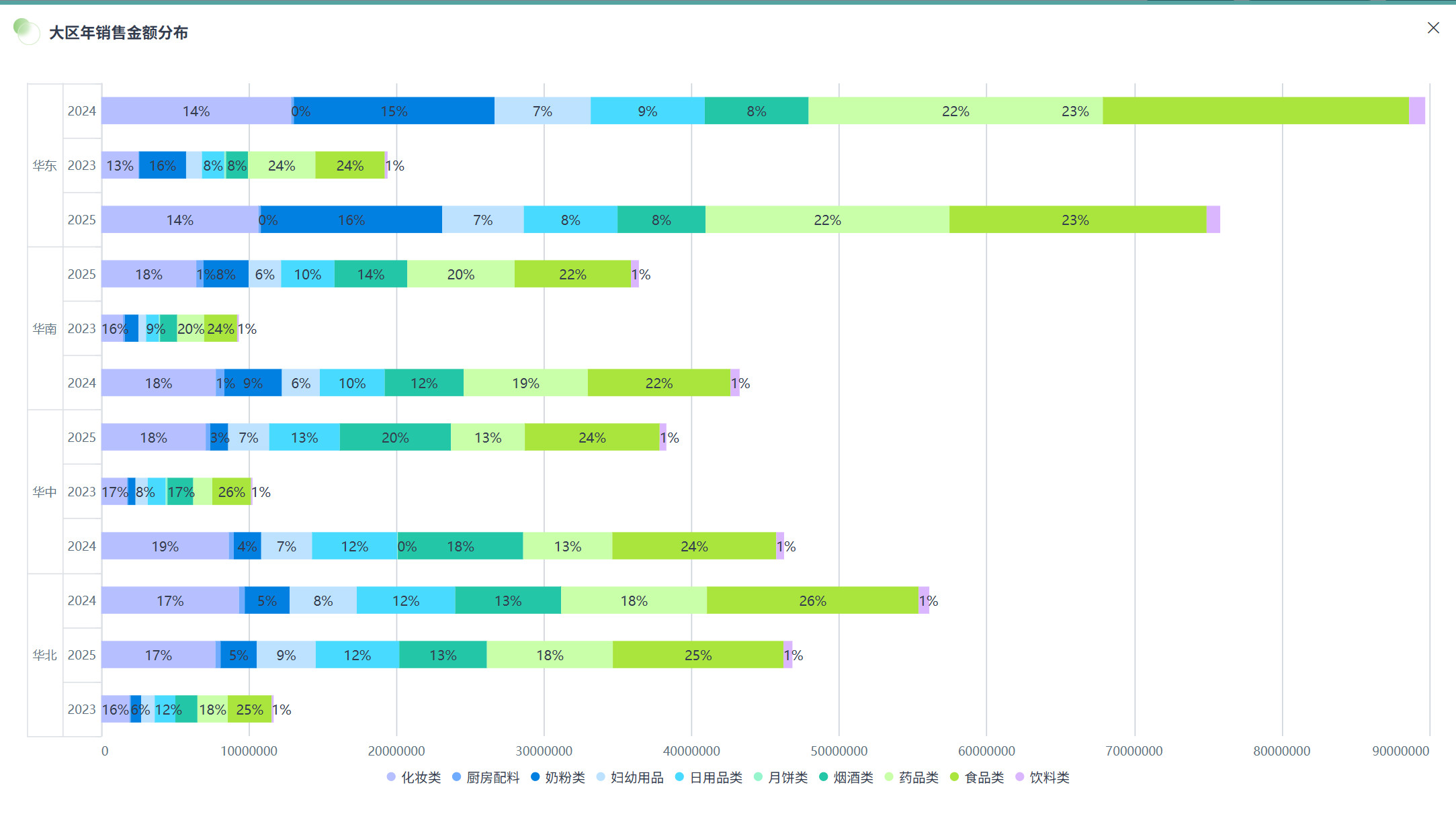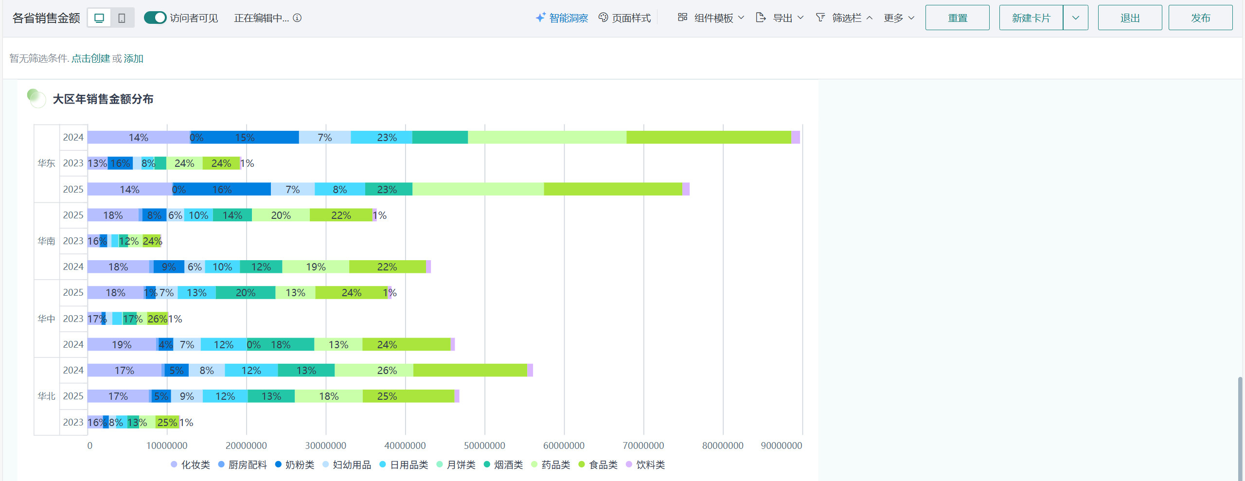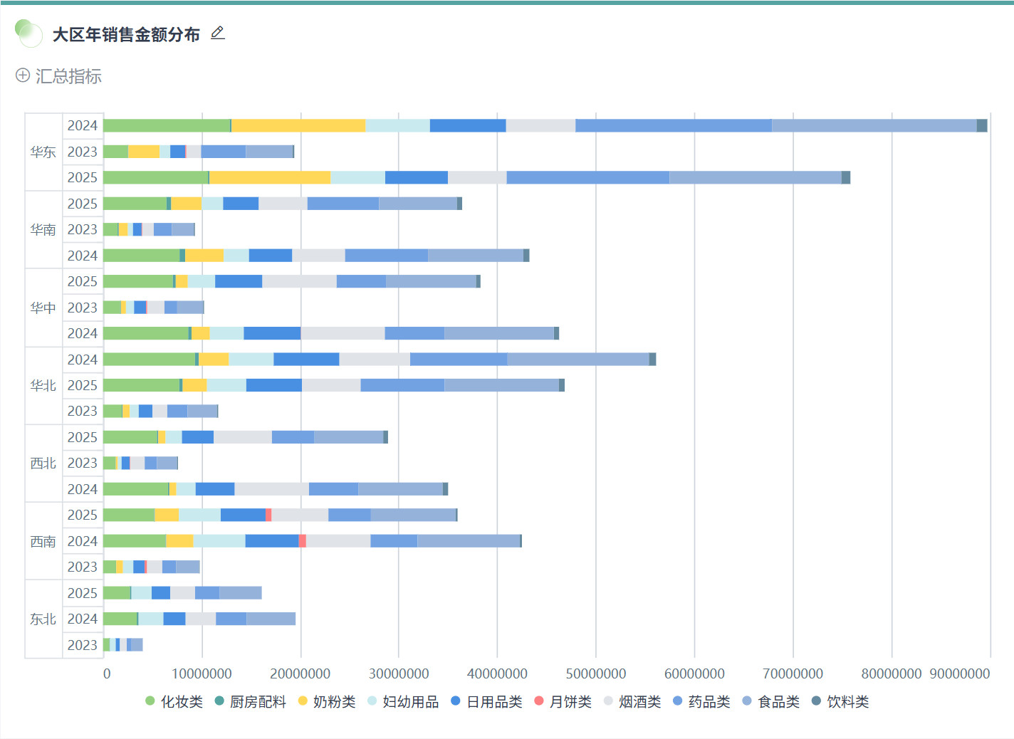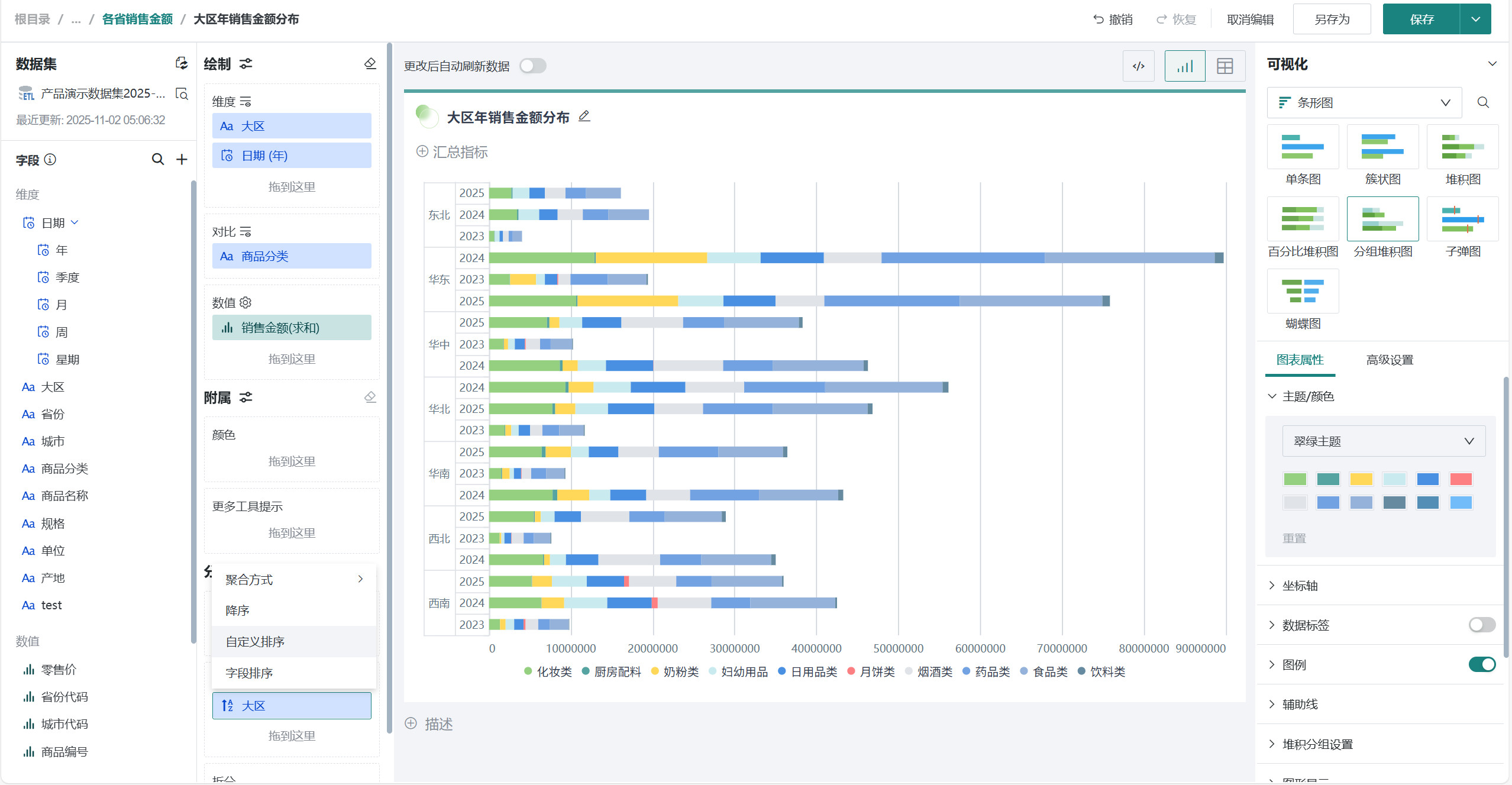 观远默认将维度中的第一个作为分类依据,若情境中希望以大区为分类标准,可以将「维度」中的「大区」和「日期(年)」调换顺序。