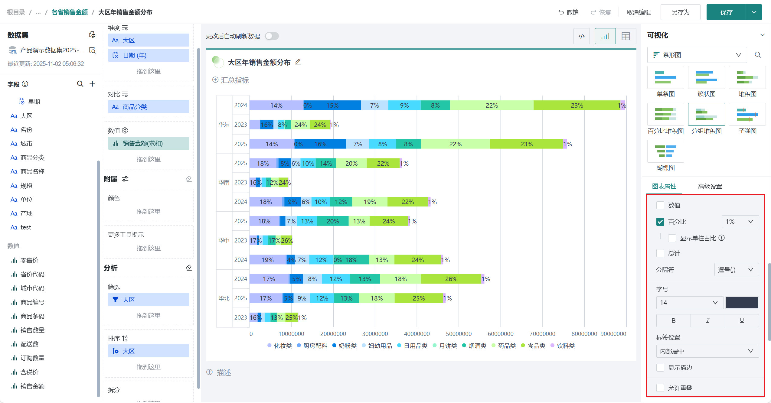 在「图表属性」区域打开「数据标签」按钮,选中「百分比」,即可看到每根柱子显示不同分类对应的销售金额数值的百分比,也可以选中「数值」等,也可以自己选择标签位置。