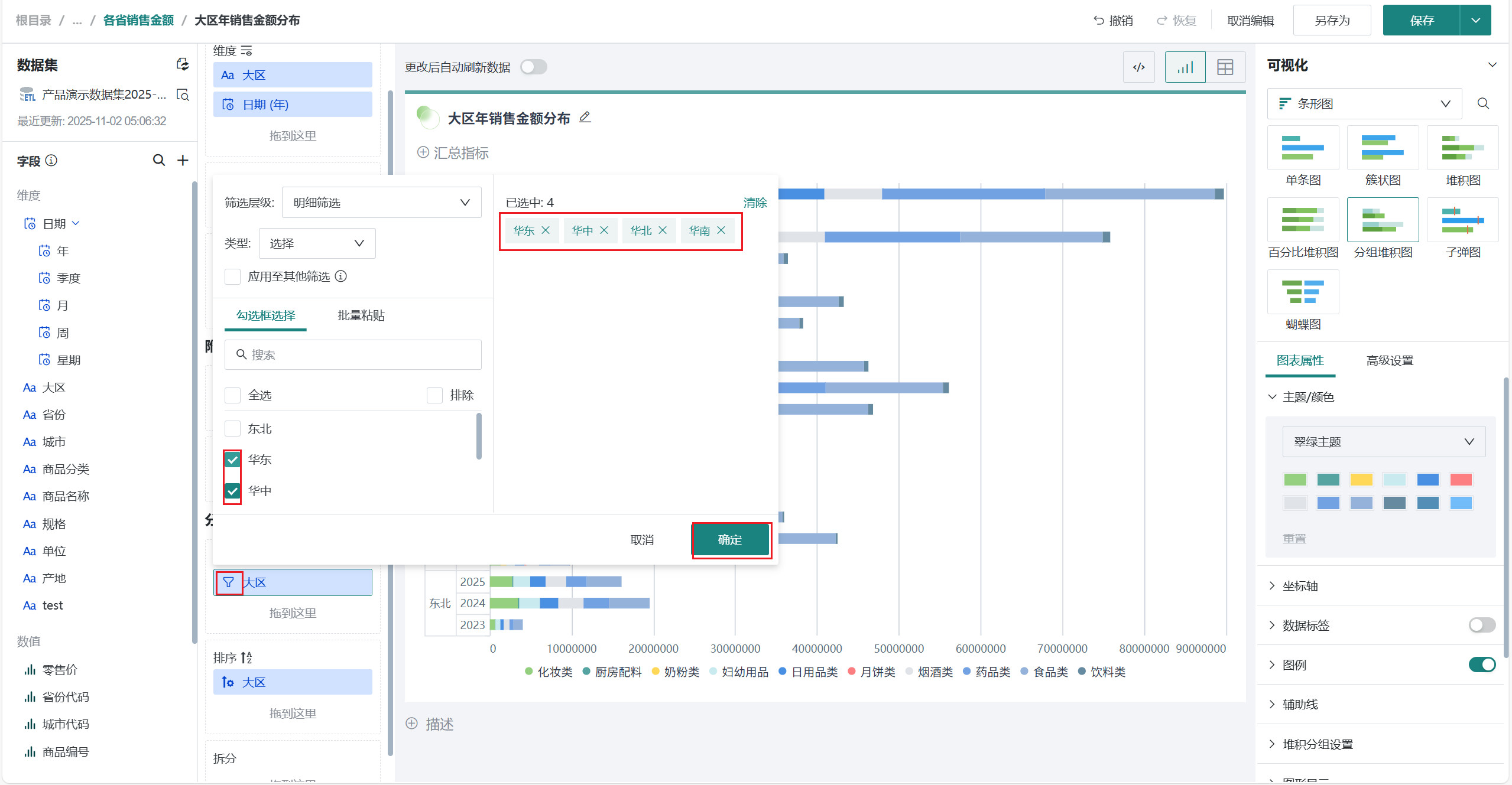 在情境中,若您只需观察华中、华北、华南、华东这四个选项的数据,可以将「大区」字段拖至「筛选」区域,点击前方小漏斗,选择后点击「确认」即可完成筛选。
