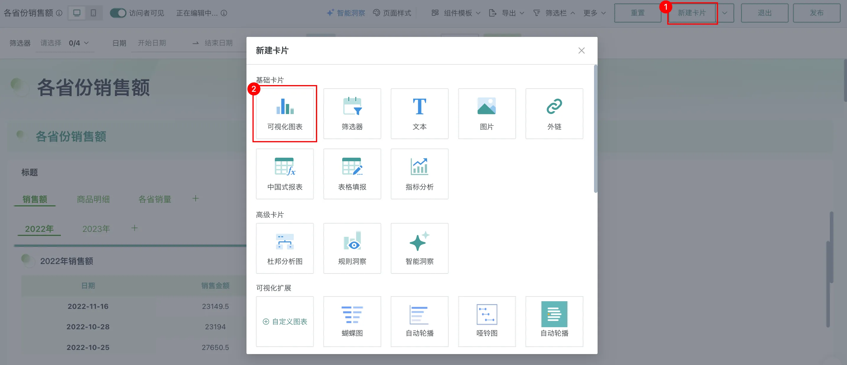 点击「新建卡片 > 可视化图表」,弹出「选择数据集」页面。