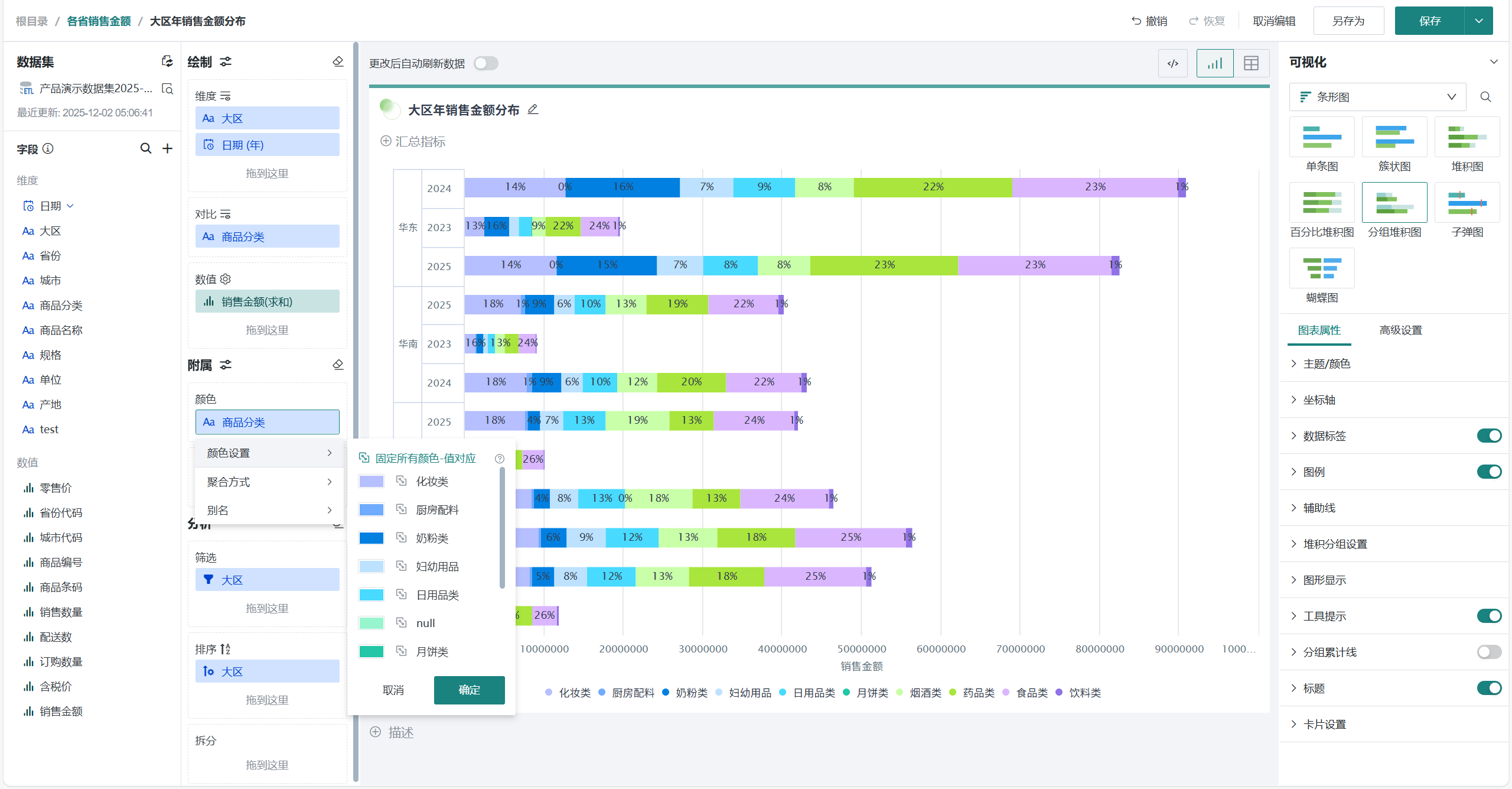 将「销售金额」字段拖至「颜色」区域,点击符号后选择「颜色设置」,可修改不同区域条形对应的颜色,颜色详细配置可参考图表绘制-颜色。