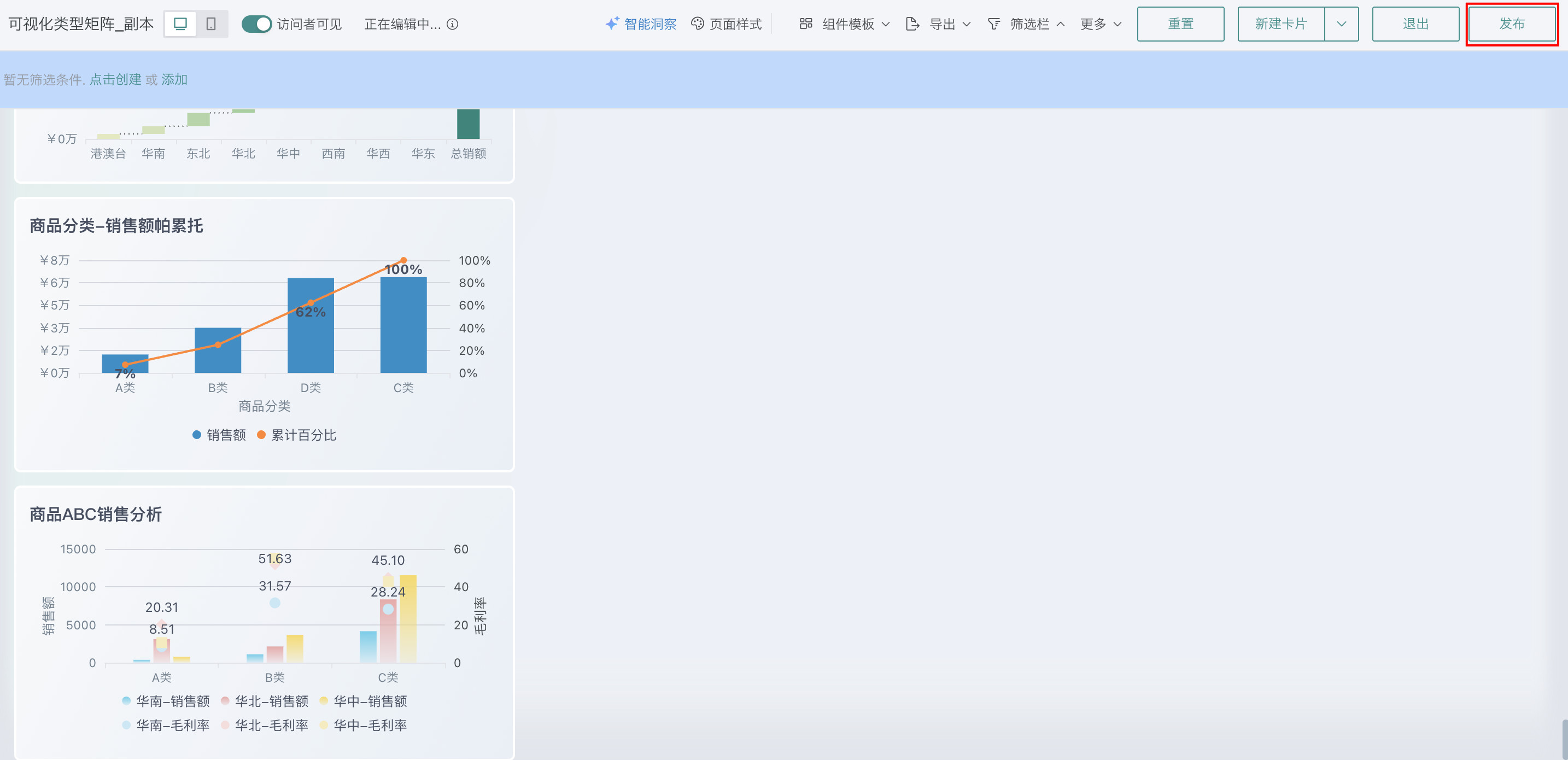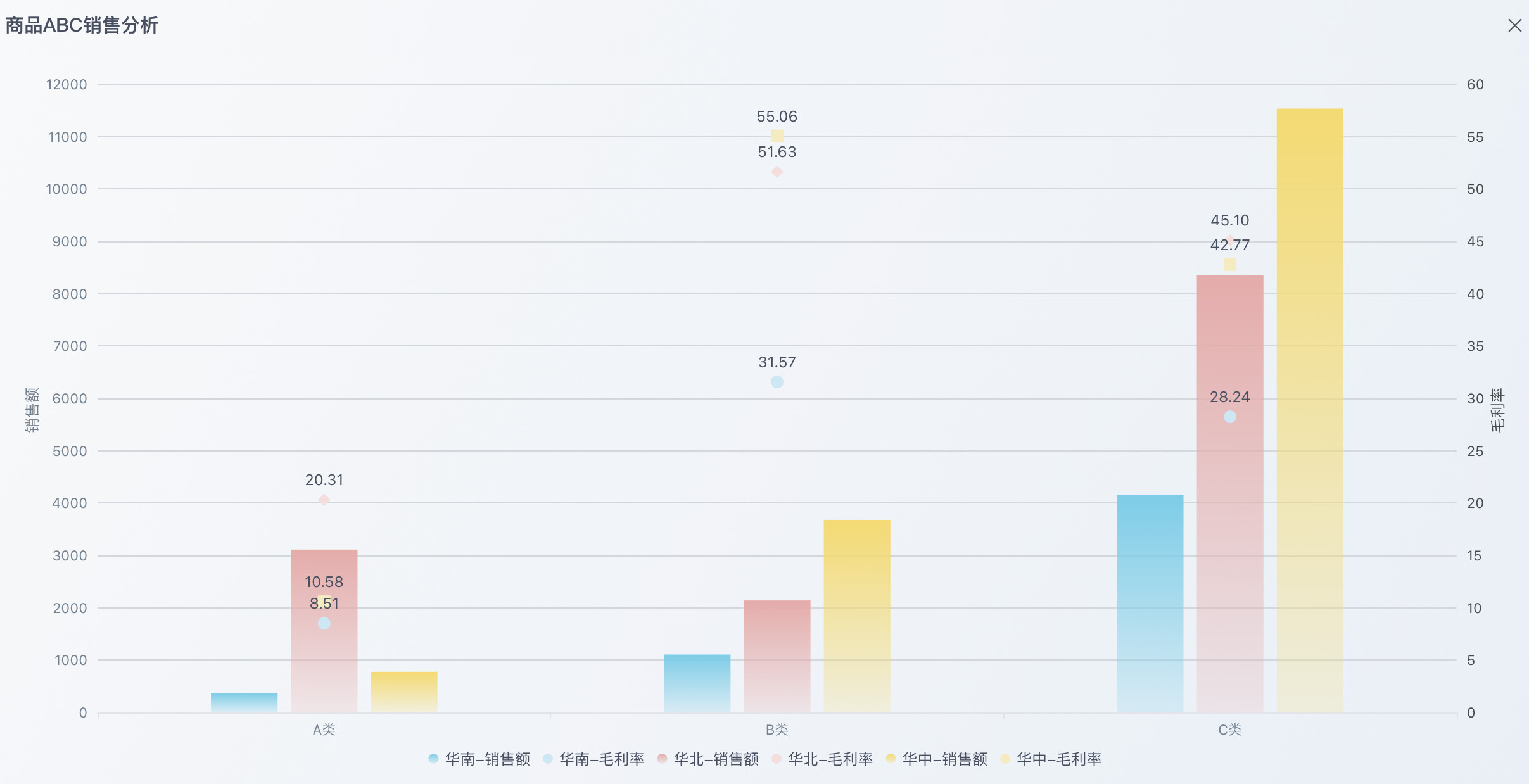 例如,结合商品分类(如A类、B类、C类商品)与区域划分(如华中、华北、华南等大区),同时分析销售额和毛利率等多个关键指标。如下图所示: