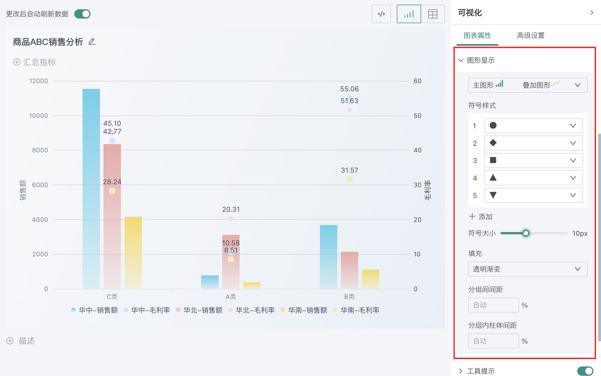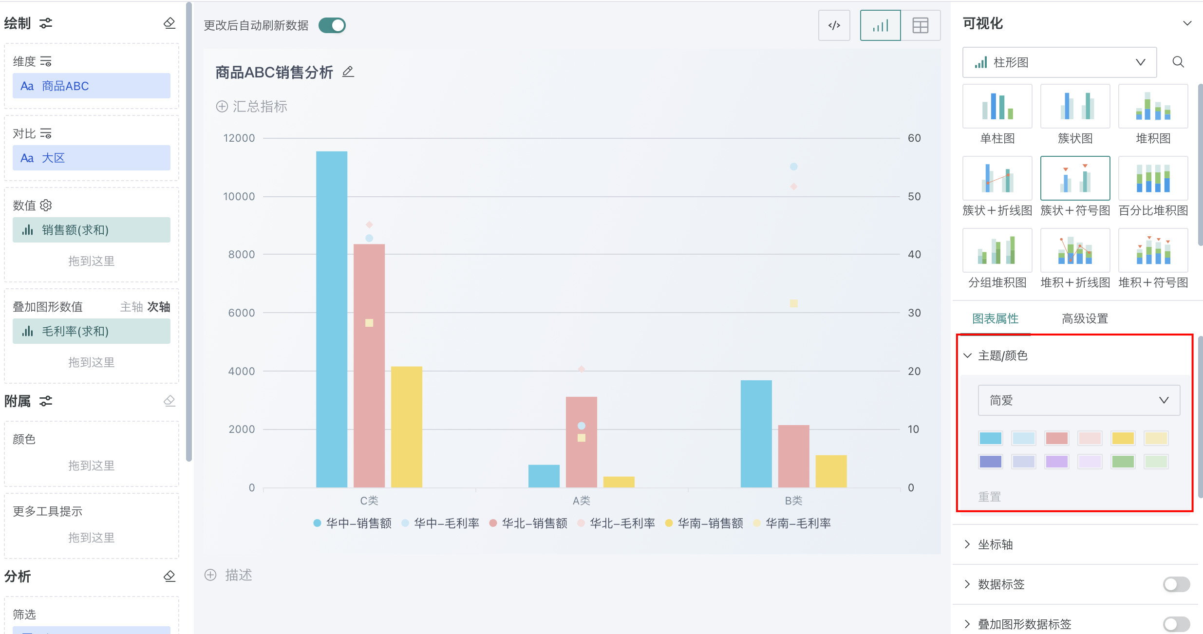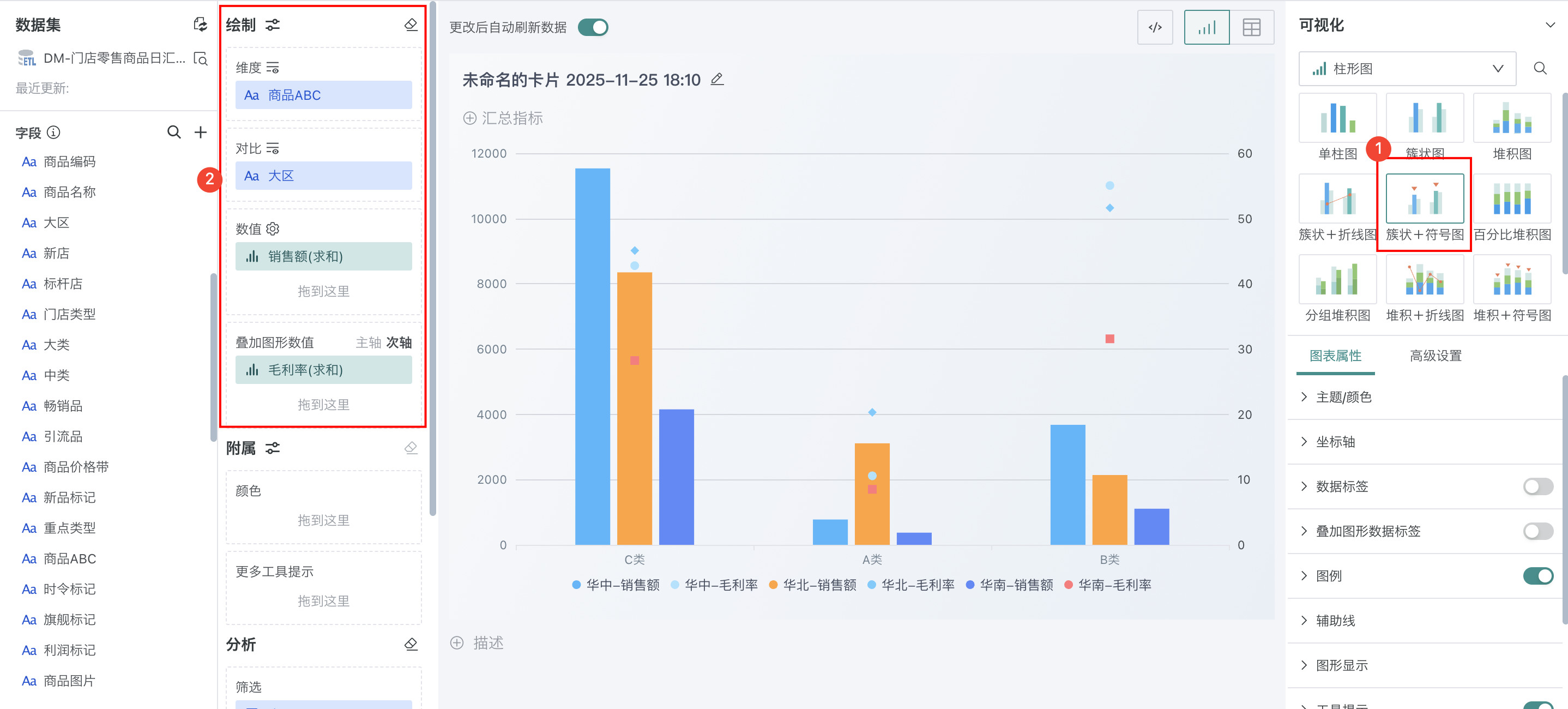 在「可视化」区域中选择「簇状+符号图」,将左侧「数据集」区域的「商品ABC」拖至「绘制」区域的「维度」,「大区」拖至「对比」,「销售额」拖至「数值」,「叠加图形数值」拖入「毛利率」。