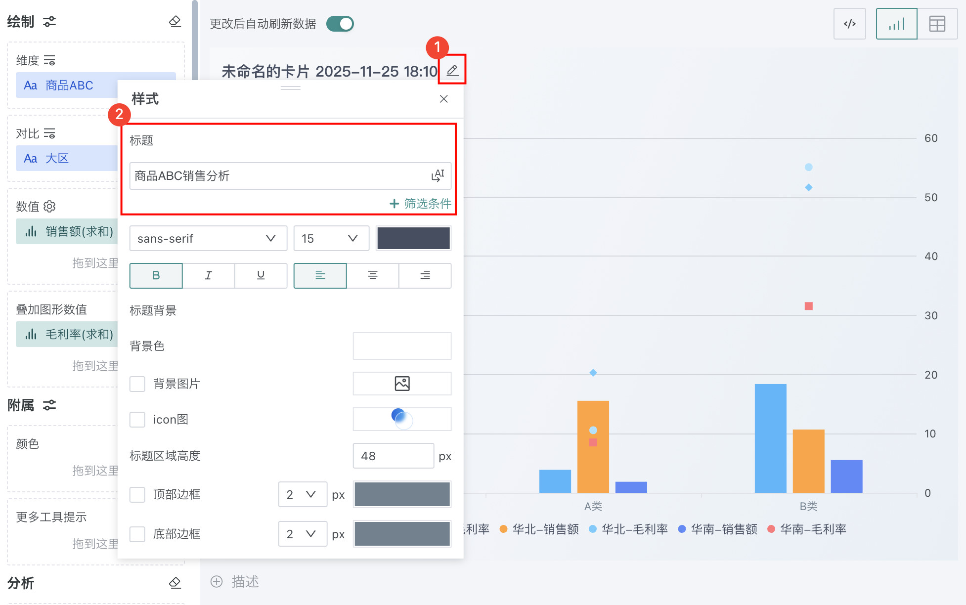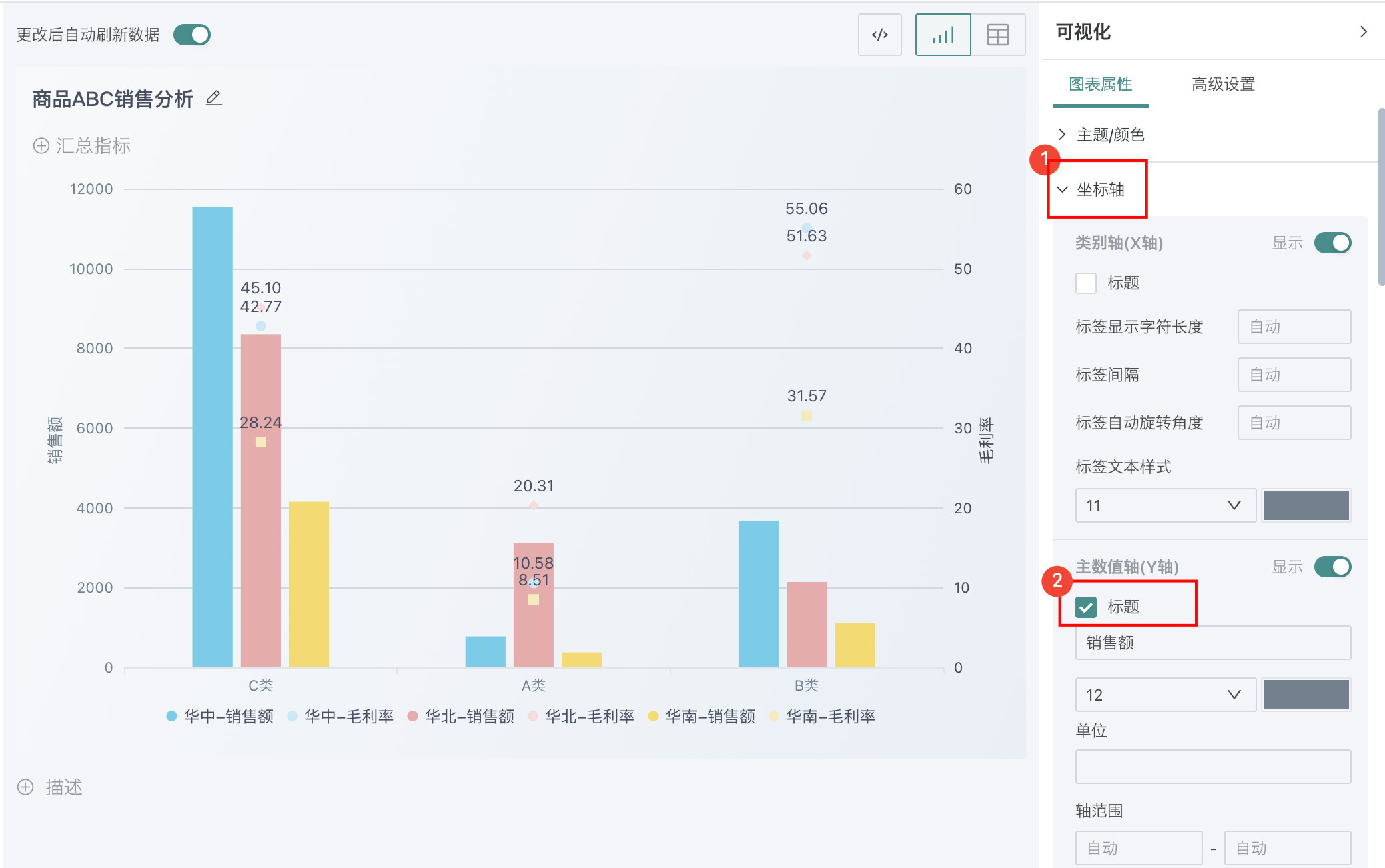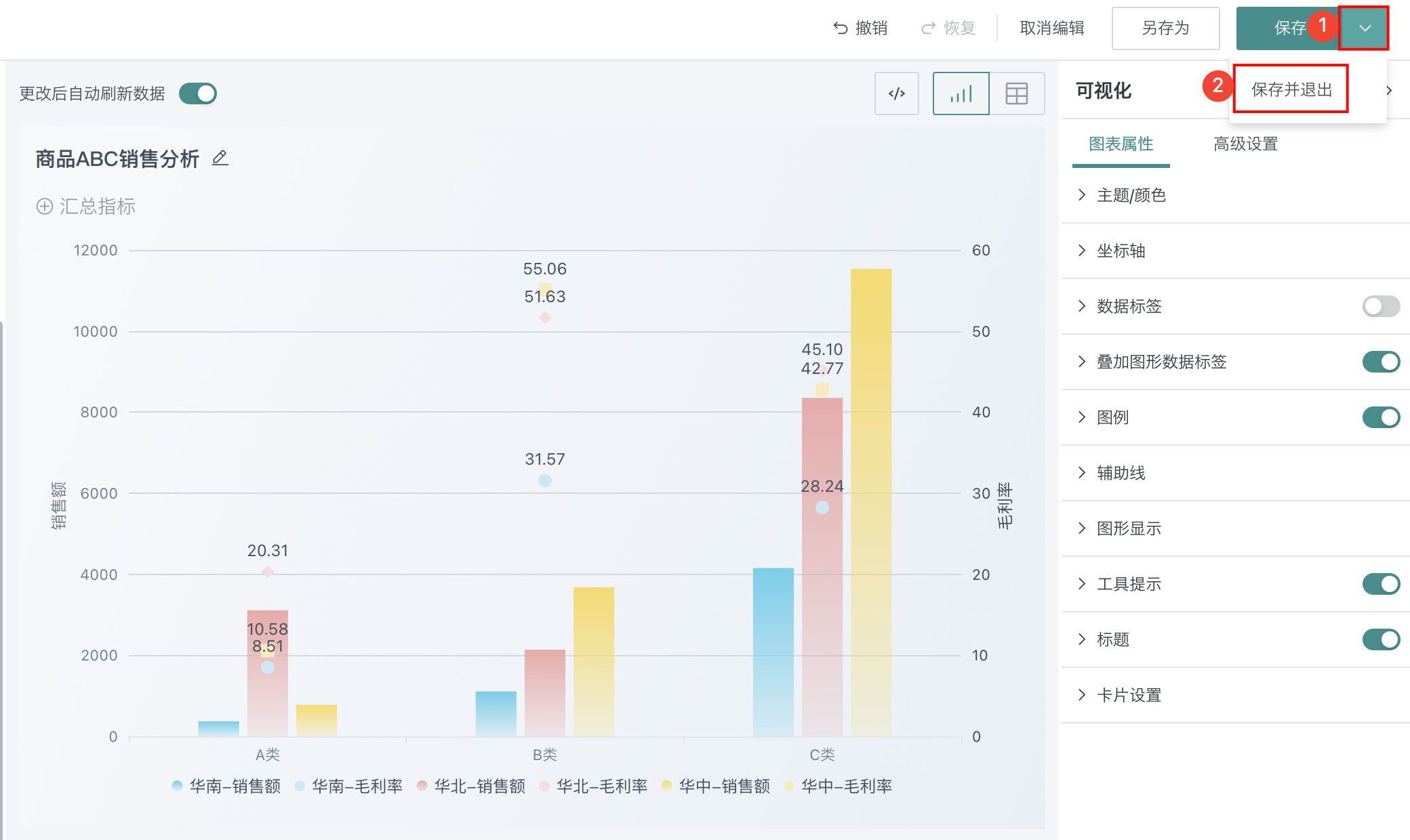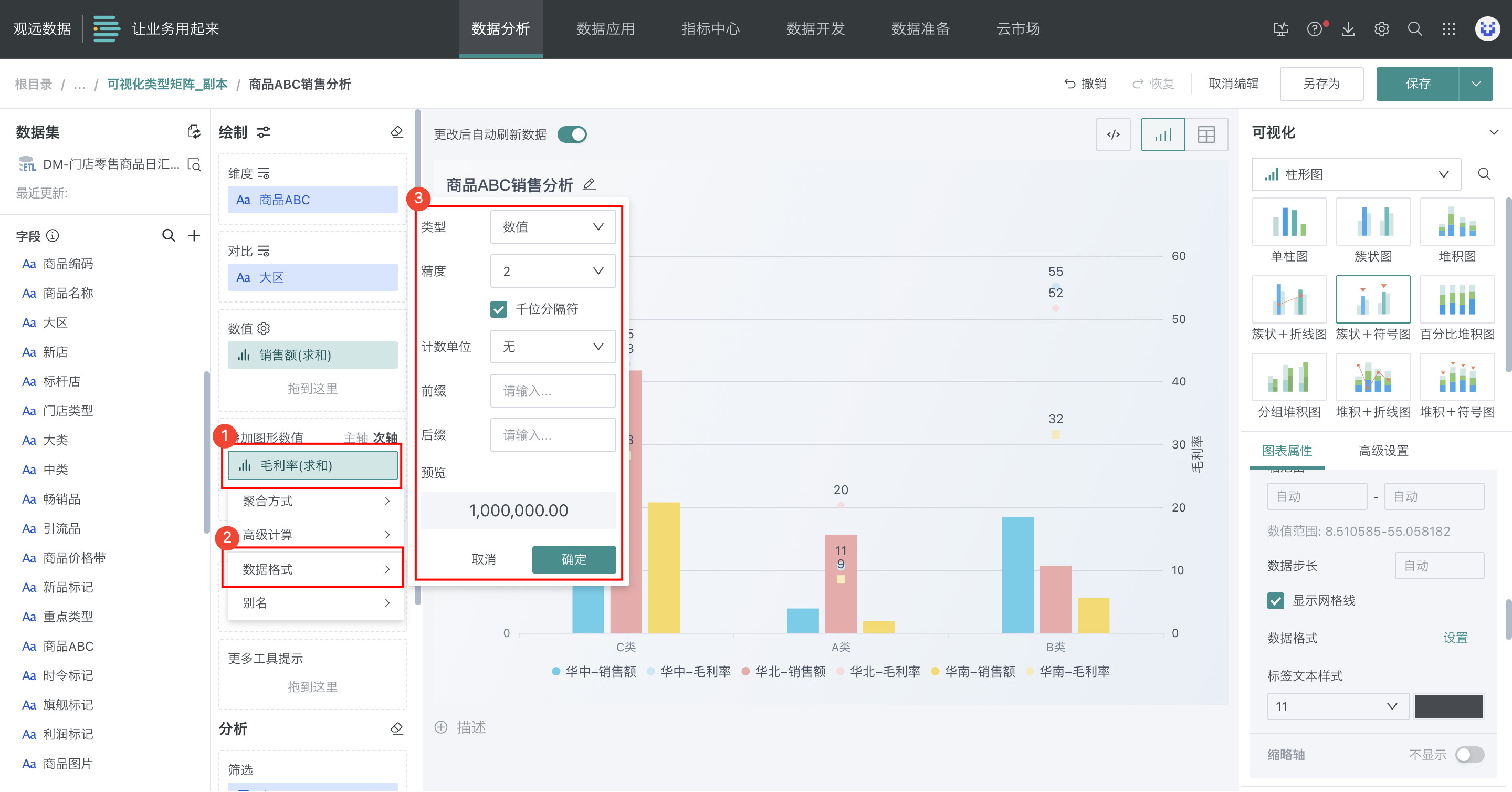 在「可视化」区域中选择「簇状+符号图」,将左侧「数据集」区域的「商品ABC」拖至「绘制」区域的「维度」,「大区」拖至「对比」,「销售额」拖至「数值」,「叠加图形数值」拖入「毛利率」。