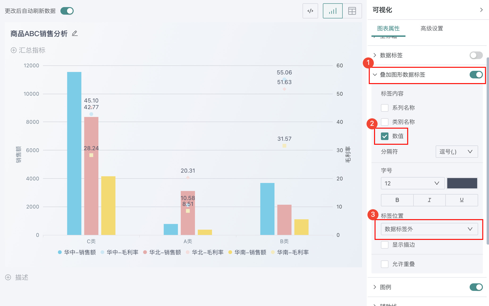 开启后,勾选「数值」会显示各大区毛利率值,还可以设置数值颜色、字号、位置等。