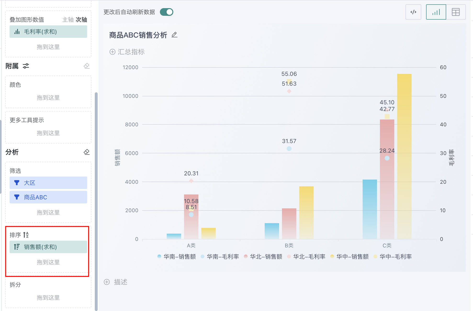 将「销售额」拖至「分析」区域的「排序」中,图表将按照销售额升序呈现。若想降序或者自定义排序,可点击「销售额」进行设置。