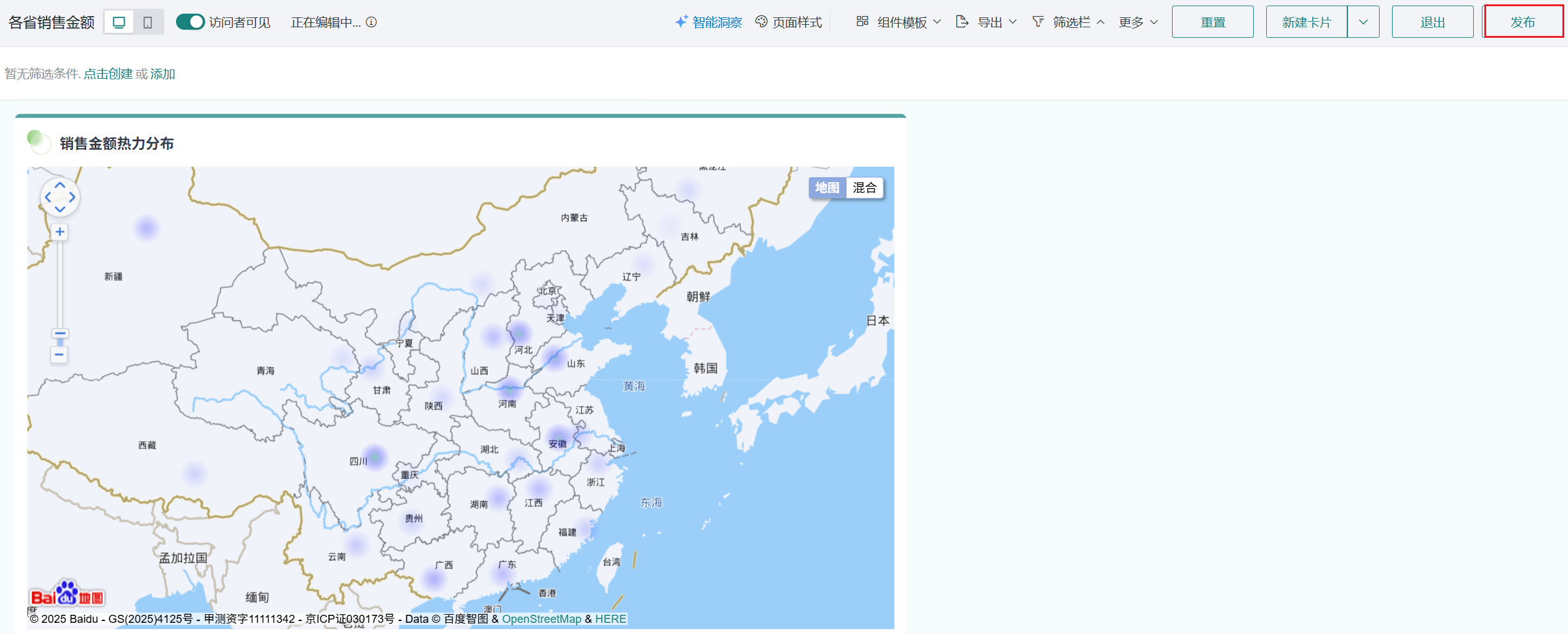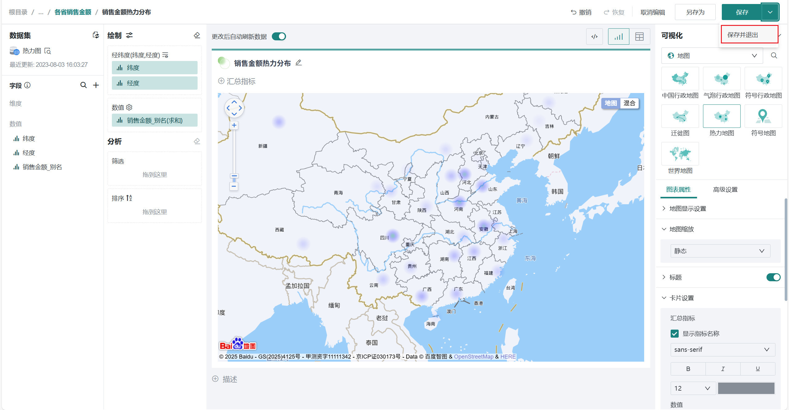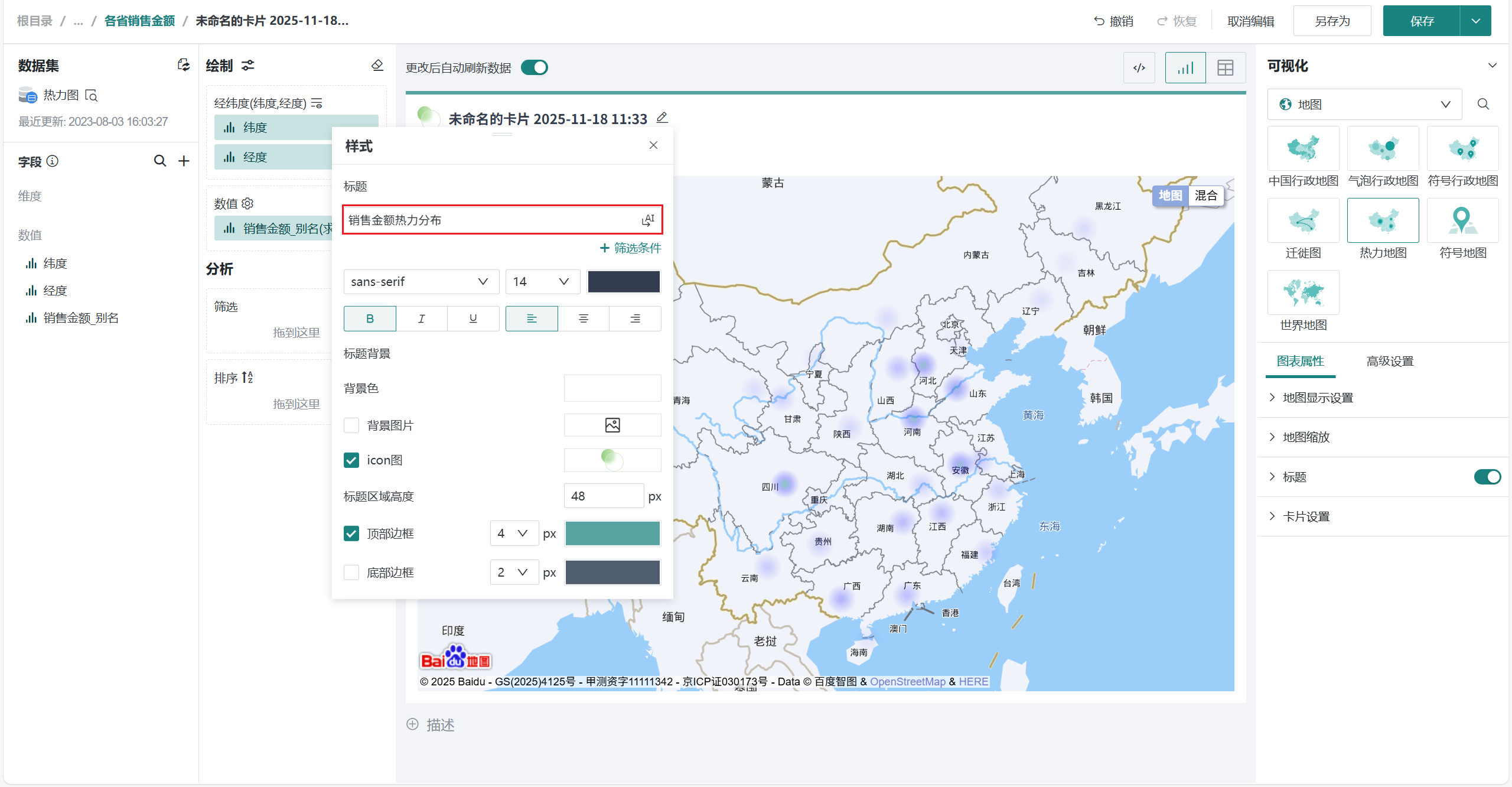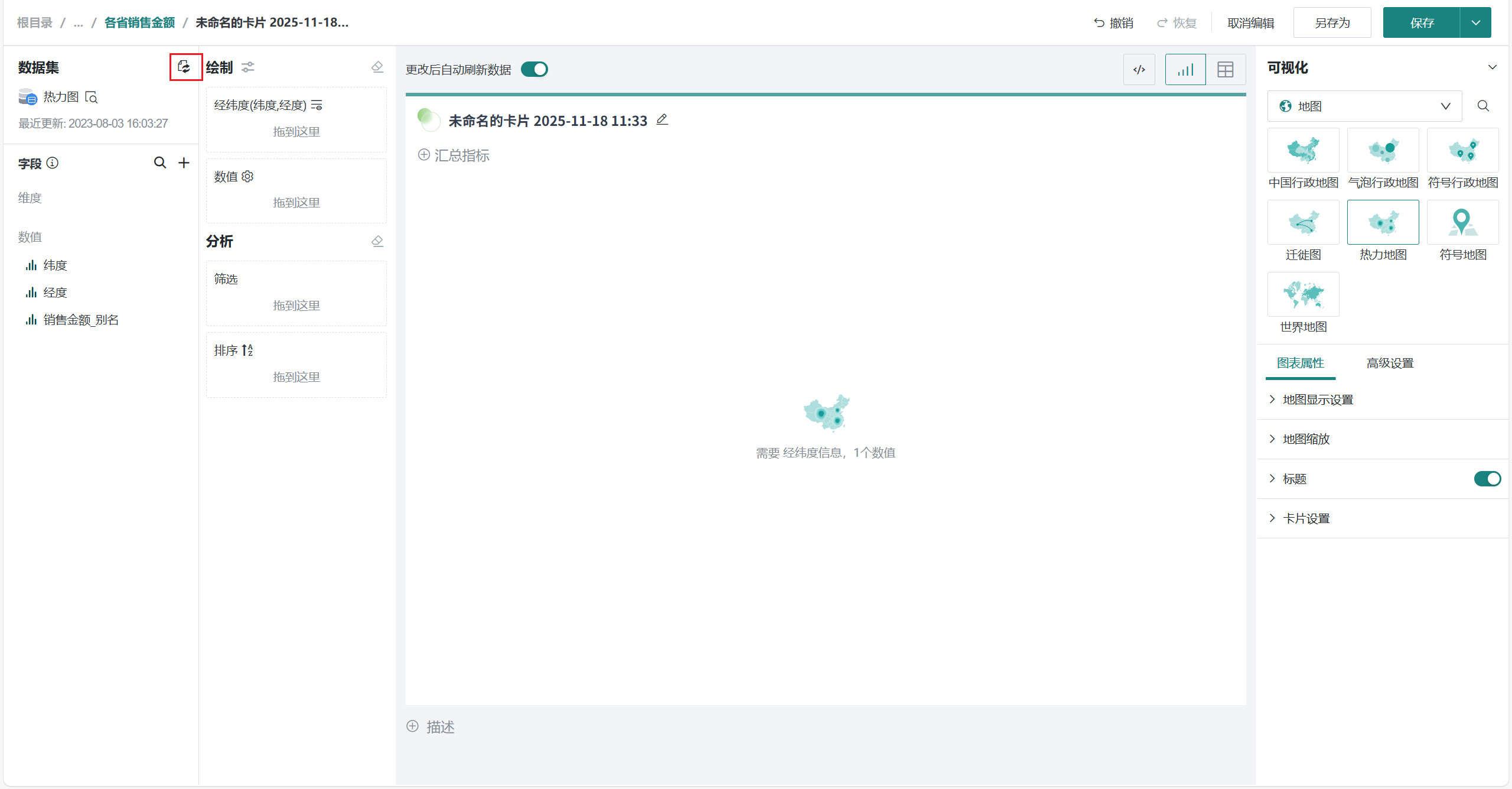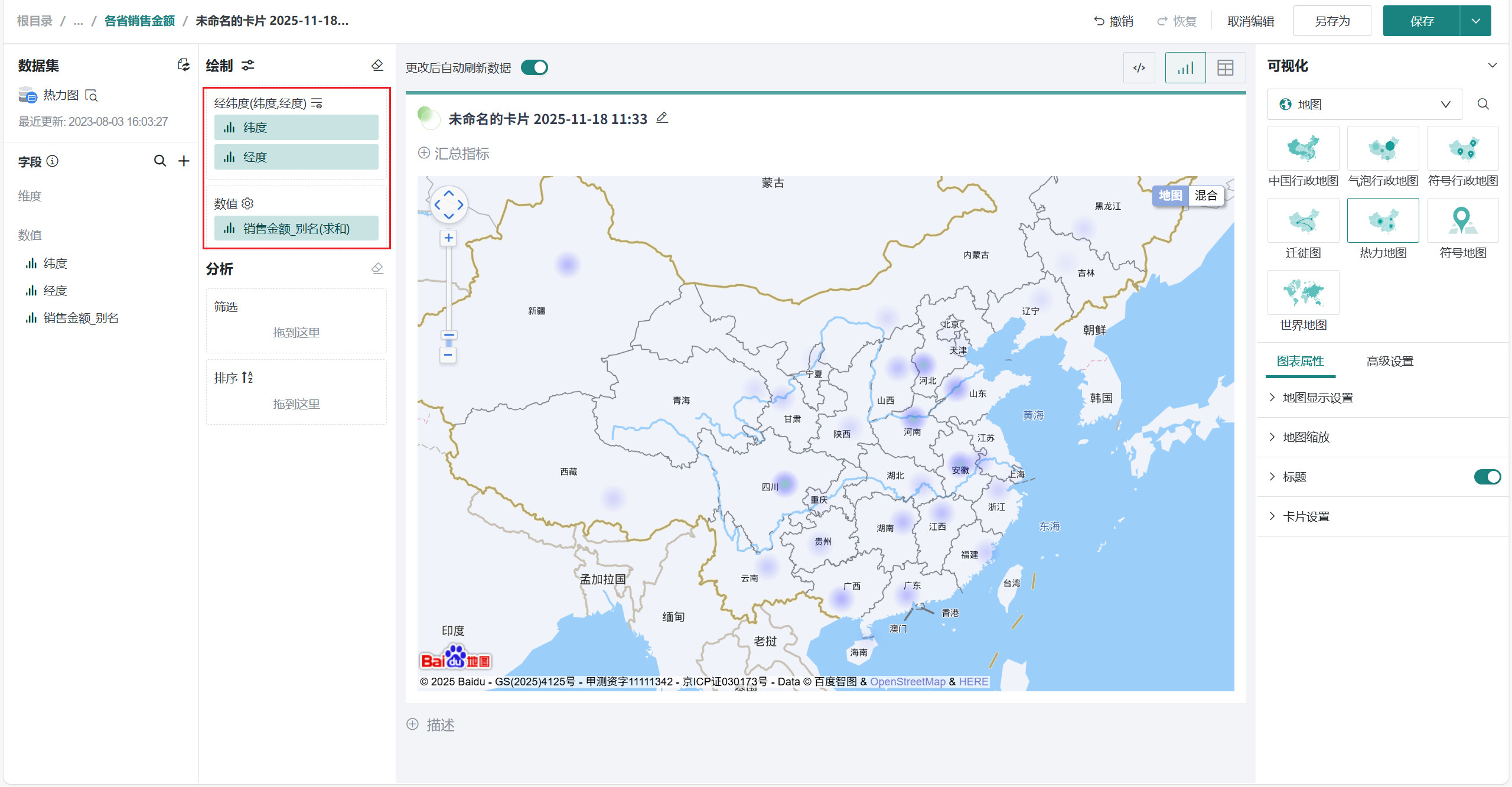 在「可视化」区域「地图」中选择「热力地图」,将左侧「字段」区域的经纬度字段拖至「绘制」区域的「经纬度」,将需要展示热度的数值字段(如「销售金额」)拖入「热力值」。