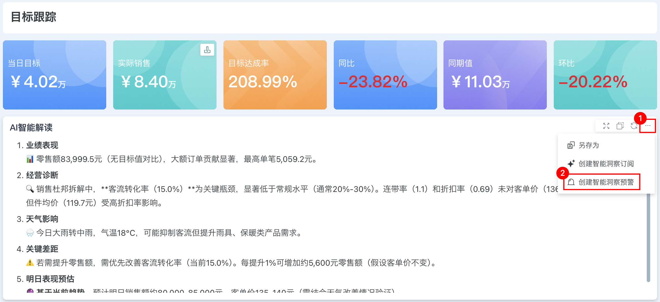 对于智能洞察卡片,创建预警有如下两个入口:
