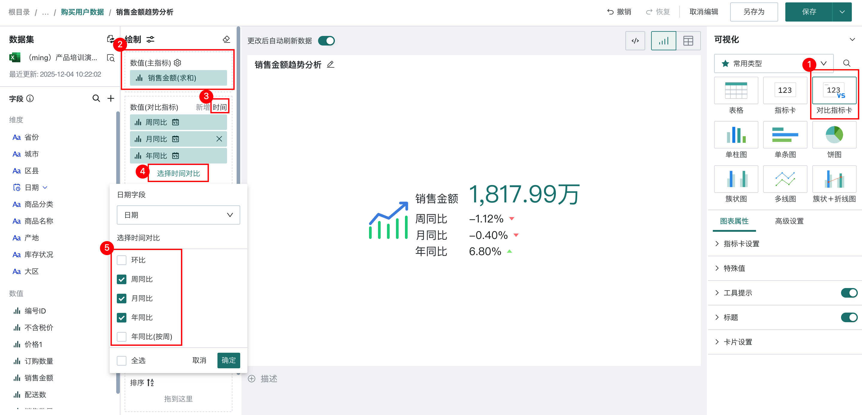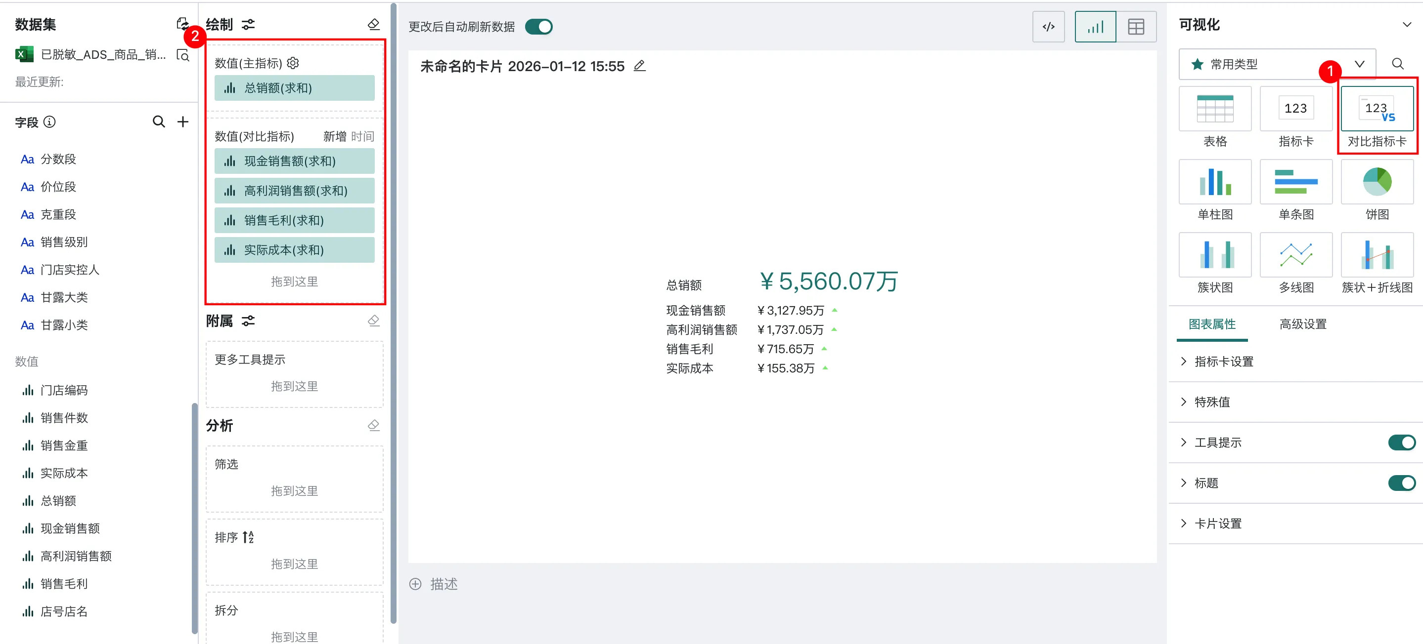 对于多个字段的指标对比而言,操作步骤如下:在「可视化」区域中选择「对比指标卡」,将左侧「数据集」区域的「总销额」拖至「绘制」区域的「数值(主指标)」中,将「现金销售额」、「高利润销售额」、「销售毛利」、「实际成本」依次拖至「数值(对比指标)」。