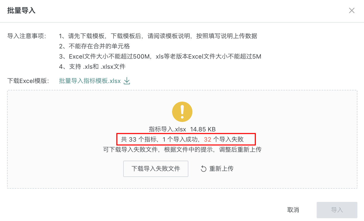 按照批量导入指标模板填写,填写完成后上传文件,点击「导入」。