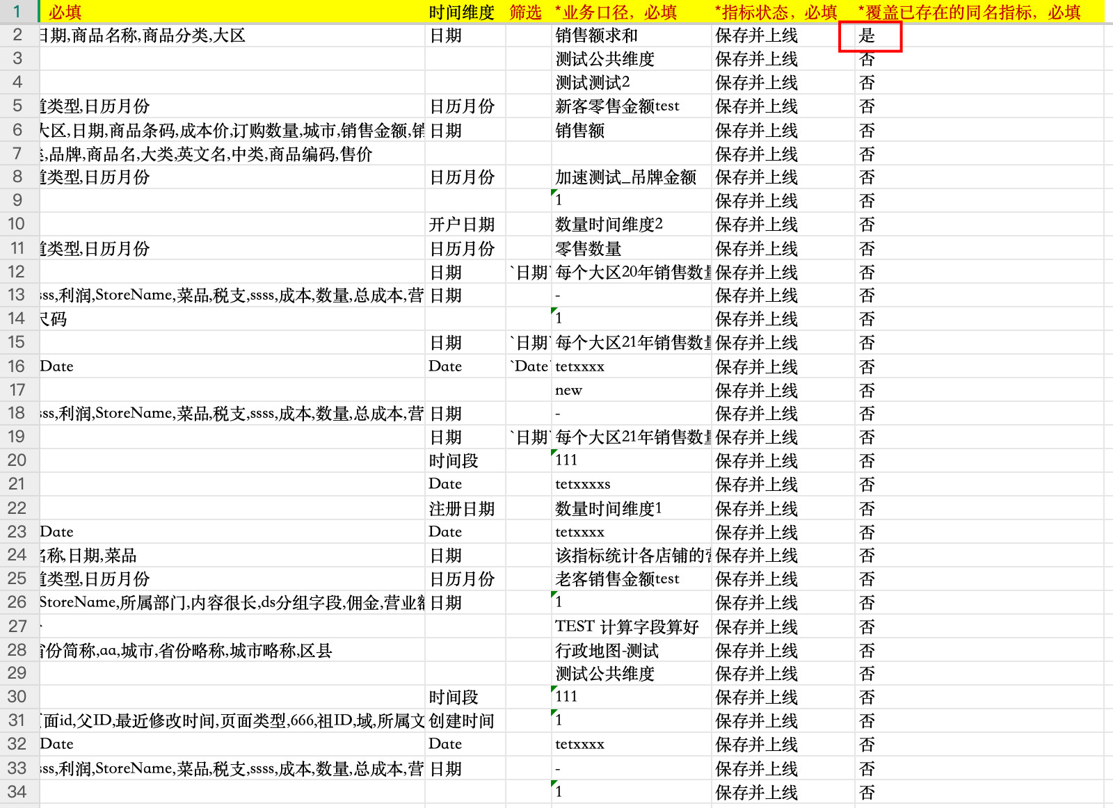 如下图所示,图中33行指标均在指标中心存在同名指标,此时仅1行将「覆盖已存在的同名指标」选择为是,批量导入后仅该指标导入成功,其余选择为否的指标均导入失败。