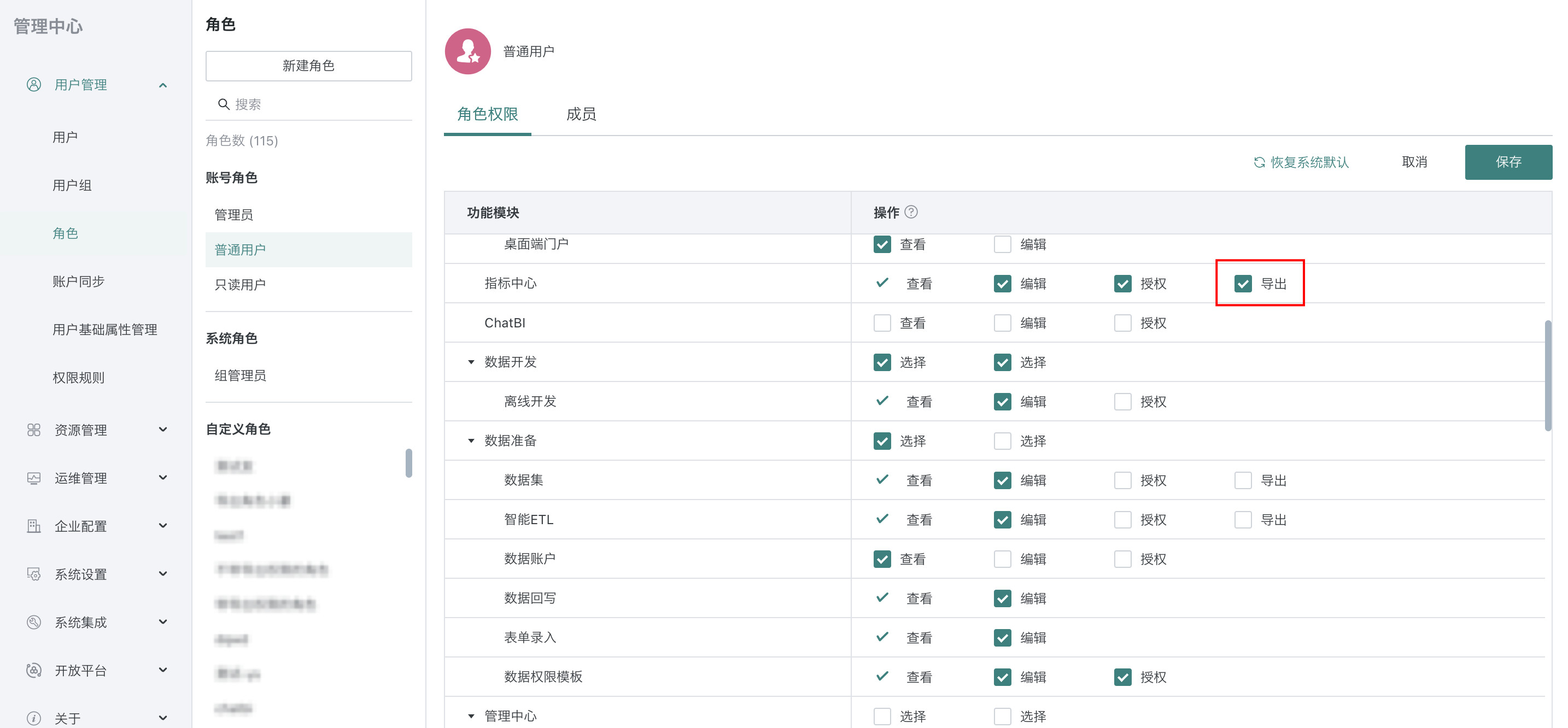 - 若勾选原子指标后无「批量导出」按钮,请至「管理中心 > 角色」页面,查看当前角色是否已开启指标中心「导出」权限。普通用户默认拥有导出权限。